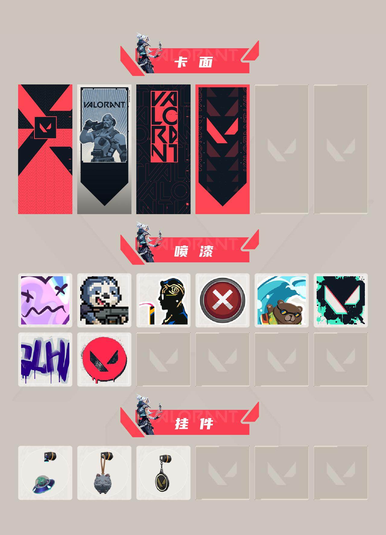 【喷漆】:伤心心 喷漆,审判之爪 喷漆,致命优雅 喷漆,买装还是存钱 喷漆,酷熊冲浪 喷漆,胜利属于无畏契约 喷漆,GLHF 喷漆,无畏契约 喷漆
