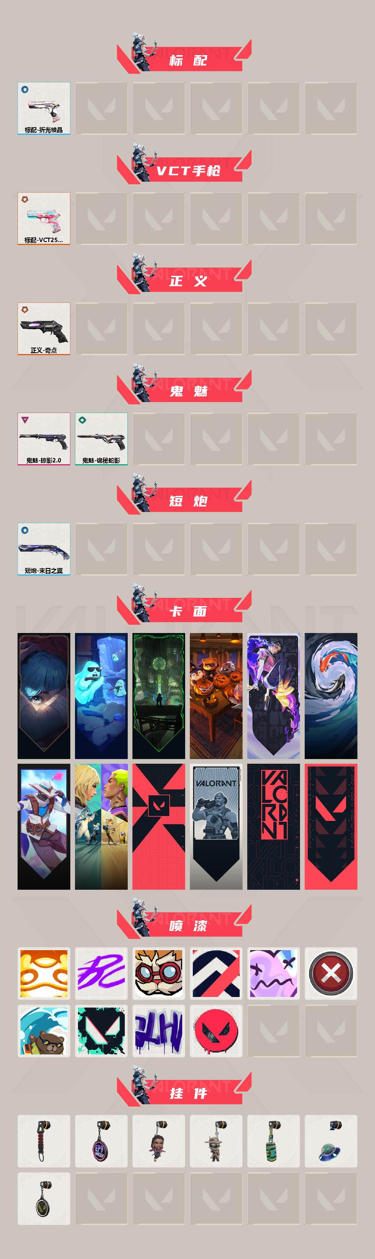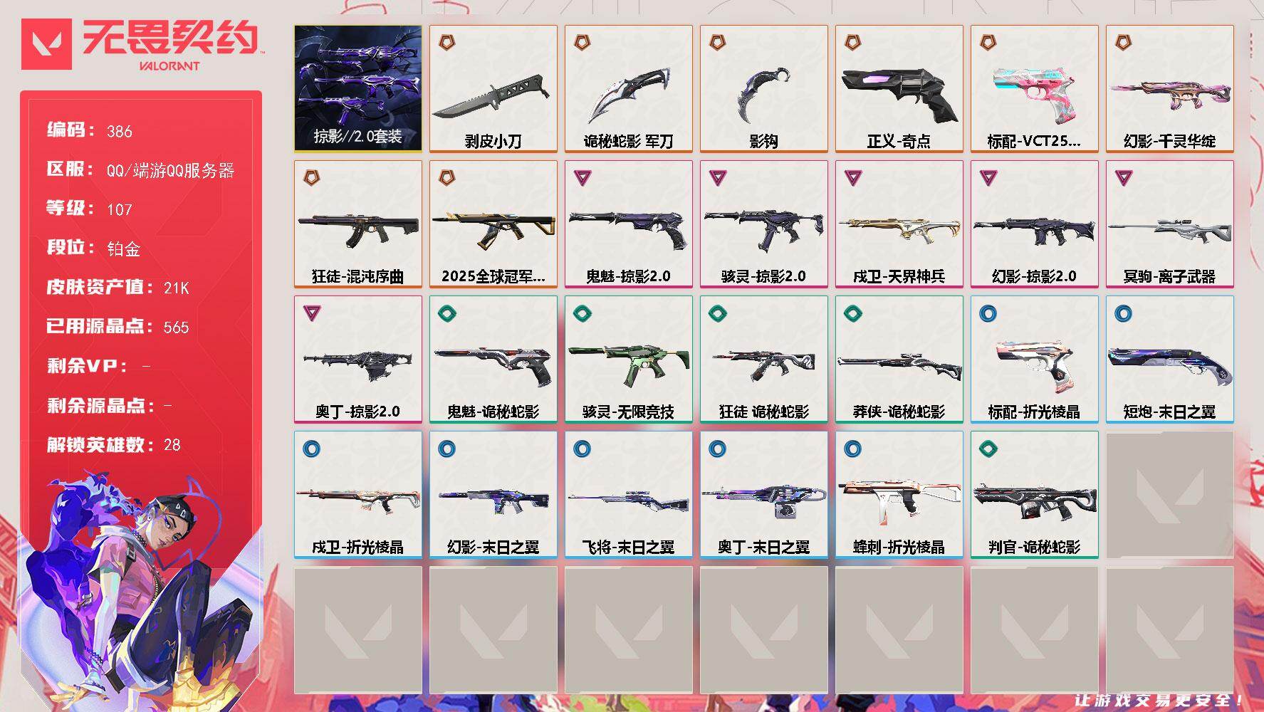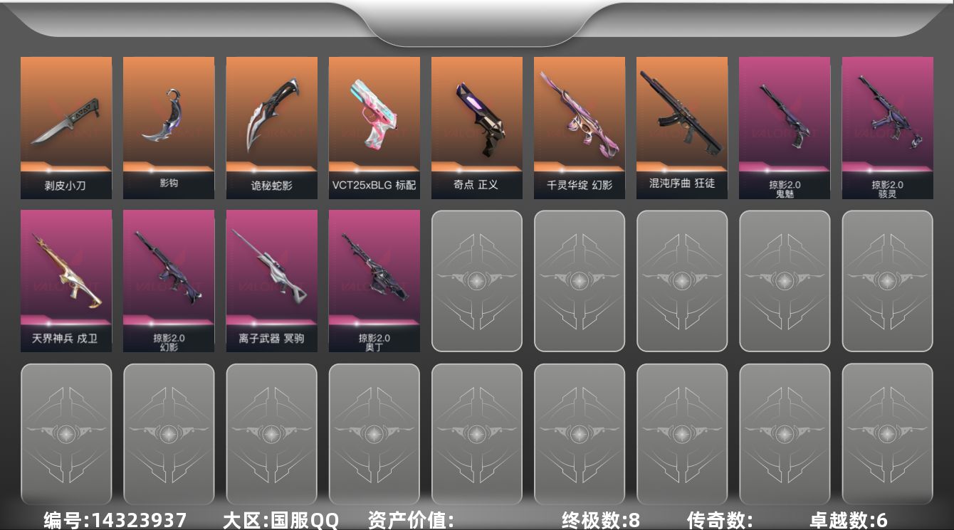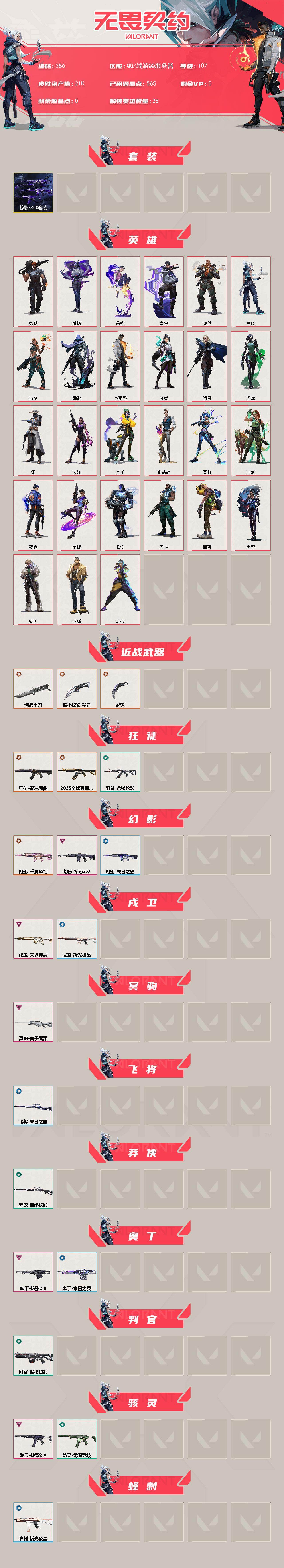 [14323937]【套装】:掠影//2.0套装 【英雄】:幻棱,炼狱,维斯,暮蝶,钛狐,壹决,铁臂,捷风,雷兹,幽影,不死鸟,贤者,猎枭,蝰蛇,零,芮娜,奇乐,尚勃勒,霓虹,斯凯,夜露,星礈,K/O,海神,盖可,黑梦,钢锁 【近战 武器】:近战武器-影钩,近战武器-剥皮小刀,近战武器-诡秘蛇影 军刀 【狂徒】:狂徒-2025全球冠军赛,狂徒-混沌序曲,狂徒-诡秘蛇影 【幻影】:幻影-千灵华绽,幻影-掠影//2.0,幻影-末日之翼 【戍卫】:戍卫-天界神兵,戍卫-折光棱晶 【冥驹】:冥驹-离子武器 【飞将】:飞将-末日之翼 【莽侠】:莽侠-诡秘蛇影 【奥丁】:奥丁-掠影//2.0,奥丁-末日之翼 【判官】:判官-诡秘蛇影 【骇灵】:骇灵-掠影//2.0,骇灵-无限竞技 【蜂刺】:蜂刺-折光棱晶 【标配】:标配-折光棱晶 【VCT手枪】:标配-VCT25 x BLG 【正义】:正义-奇点 【鬼魅】:鬼魅-掠影//2.0,鬼魅-诡秘蛇影 【短炮】:短炮-末日之翼 【卡面】:《双城之战》拥抱 卡面,精灵大战 卡面,欢迎来到底城 卡面,南瓜盛典 卡面,无畏契约:暮蝶 卡面,红鳞松叶 卡面,无畏契约GO!第一卷:零 卡面,钢锁vs盖可 卡面,代号红色 卡面,新兵报到 卡面,V契约 卡面,无畏契约 卡面 【喷漆】:嗨宝南瓜灯 喷漆,嘭! 喷漆,都算到了 喷漆,控场勿近 喷漆,伤心心 喷漆,买装还是存钱 喷漆,酷熊冲浪 喷漆,胜利属于无畏契约 喷漆,GLHF 喷漆,无畏契约 喷漆 【挂饰】:伞绳 挂饰,第九季//第三幕 纪念币 挂饰,无畏契约GO!第一卷 芮娜 挂饰,无畏契约GO!第一卷 零 挂饰,Z世代特饮 挂饰,天外飞客 挂饰,无畏契约 纪念币 挂饰