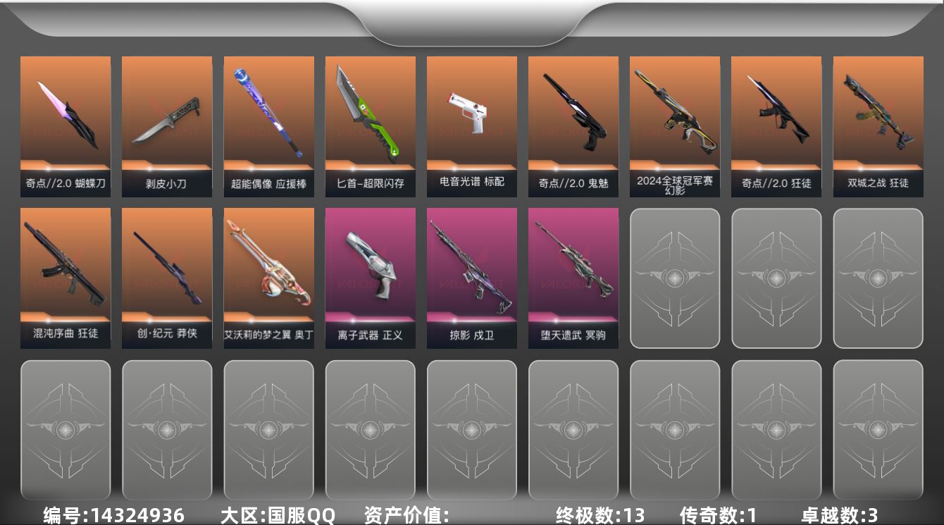 [14324936]【套装】:奇点//2.0套装 【英雄】:幻棱,炼狱,维斯,暮蝶,钛狐,壹决,铁臂,捷风,雷兹,幽影,不死鸟,贤者,猎枭,蝰蛇,零,芮娜,奇乐,尚勃勒,霓虹,夜露,K/O,盖可,黑梦,钢锁 【近战 武器】:近战武器-嘟昂嘟昂超弹力水球拳套,近战武器-剥皮小刀,近战武器-奇点//2.0 蝴蝶刀,近战武器-超能偶像 应援棒,近战武器-超限闪存 匕首 【狂徒】:狂徒-混沌序曲,狂徒-奇点//2.0,狂徒-双城之战,狂徒-超能偶像,狂徒-荒土机兵 【幻影】:幻影-2024全球冠军赛,幻影-超限闪存,幻影-聚合之力,幻影-纳米打击 【戍卫】:戍卫-掠影,戍卫-超能偶像,戍卫-浮光跃金,戍卫-逆冲蛮牛 【獠犬】:獠犬-采蜜小蜂队,獠犬-模拟赫兹,獠犬-逆冲蛮牛 【冥驹】:冥驹-堕天遗武,冥驹-荒土机兵,冥驹-模拟赫兹 【飞将】:飞将-聚合之力 【莽侠】:莽侠-创·纪元,莽侠-超限闪存 【战神】:战神-采蜜小蜂队,战神-浮光跃金 【奥丁】:奥丁-艾沃莉的梦之翼,奥丁-纳米打击 【判官】:判官-超能偶像,判官-采蜜小蜂队,判官-纳米打击x 【雄鹿】:雄鹿-模拟赫兹,雄鹿-逆冲蛮牛 【骇灵】:骇灵-荒土机兵,骇灵-无限竞技,骇灵-浮光跃金 【蜂刺】:蜂刺-超限闪存,蜂刺-聚合之力 【标配】:标配-电音光谱,标配-超能偶像,标配-荒土机兵,标配-浮光跃金,标配-电音光谱 【正义】:正义-离子武器,正义-超限闪存 【鬼魅】:鬼魅-奇点//2.0,鬼魅-采蜜小蜂队,鬼魅-模拟赫兹 【狂怒】:狂怒-聚合之力,狂怒-逆冲蛮牛 【卡面】:纳米打击 卡面,抑制技术 卡面,激斗汉堡 卡面,瓦娃脸雪糕 P2 卡面,从黄昏到黎明 卡面,荒土机兵 卡面,银弹猎手 卡面,逆冲蛮牛 卡面,《双城之战》拥抱 卡面,精灵大战 卡面,欢迎来到底城 卡面,南瓜盛典 卡面,唱片的故事 卡面,钢弓与箭弦 卡面,排除故障 卡面,奇点//2.0 卡面,战术桌游 卡面,悠享食光 卡面,修车达人 卡面,模拟赫兹 卡面,浮光跃金 卡面,超限闪存 卡面,维斯工牌 卡面,正义的化身 卡面,终章:生意人麦宝 卡面,铁之华 卡面,失而复得 卡面,时间到 卡面,最高舞台 卡面,复活专家 卡面,归乡 // 蝰蛇 卡面,超能偶像 卡面,生意人麦宝 卡面,树懒大作战 卡面,声感陷阱设计图 卡面,Clutch 卡面,钢锁工牌 卡面,战术小伙伴的夏日
