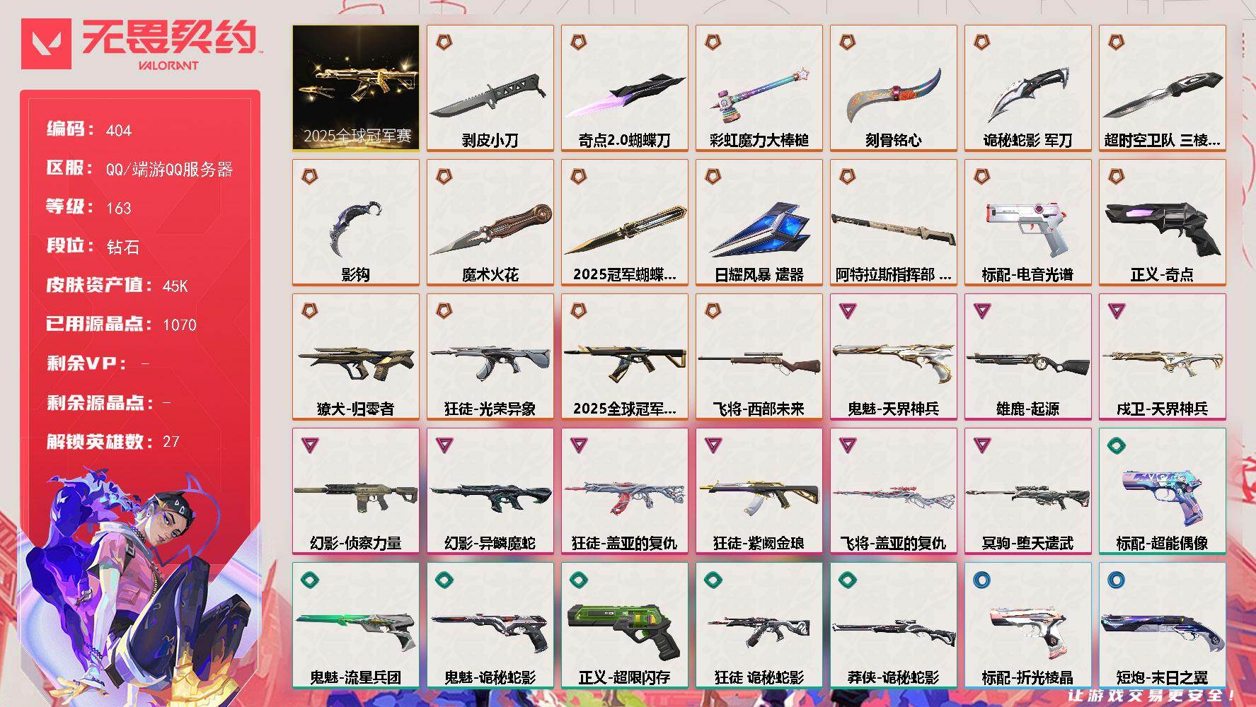 [14325010]【套装】:2025全球冠军赛套装 【英雄】:幻棱,炼狱,维斯,暮蝶,钛狐,壹决,铁臂,捷风,雷兹,幽影,不死鸟,贤者,猎枭,蝰蛇,零,芮娜,奇乐,尚勃勒,霓虹,斯凯,夜露,星礈,K/O,海神,盖可,黑梦,钢锁 【近战 武器】:近战武器-2025全球冠军赛 蝴蝶刀,近战武器-魔术火花,近战武器-影钩,近战武器-超时空卫队 三棱军刺,近战武器-剥皮小刀,近战武器-奇点//2.0 蝴蝶刀,近战武器-彩虹魔力大棒槌,近战武器-刻骨铭心,近战武器-诡秘蛇影 军刀,近战武器-日耀风暴 遗器,近战武器-阿特拉斯指挥部 甩棍,近战武器-魔术火花 【狂徒】:狂徒-2025全球冠军赛,狂徒-光荣异象,狂徒-盖亚的复仇,狂徒-紫阙金琅,狂徒-诡秘蛇影 【幻影】:幻影-侦察力量,幻影-异鳞魔蛇,幻影-末日之翼 【戍卫】:戍卫-天界神兵,戍卫-折光棱晶 【獠犬】:獠犬-归零者 【冥驹】:冥驹-堕天遗武 【飞将】:飞将-西部未来,飞将-盖亚的复仇,飞将-末日之翼 【莽侠】:莽侠-诡秘蛇影 【奥丁】:奥丁-末日之翼 【判官】:判官-诡秘蛇影 【雄鹿】:雄鹿-起源 【蜂刺】:蜂刺-折光棱晶 【标配】:标配-电音光谱,标配-超能偶像,标配-折光棱晶,标配-电音光谱 【正义】:正义-奇点,正义-超限闪存,正义-纳米打击,正义-游戏结束 【鬼魅】:鬼魅-天界神兵,鬼魅-流星兵团,鬼魅-诡秘蛇影 【短炮】:短炮-末日之翼 【卡面】:终章:激斗汉堡 卡面,进入射程 卡面,《双城之战》拥抱 卡面,精灵大战 卡面,欢迎来到底城 卡面,南瓜盛典 卡面,VCT CN首冠 卡面,钢弓与箭弦 卡面,修车达人 卡面,热舞环节 卡面,正义的化身 卡面,终章:生意人麦宝 卡面,铁之华 卡面,失而复得 卡面,时间到 卡面,最高舞台 卡面,先瓦为敬 - 银色 卡面,声感陷阱设计图 卡面,红鳞松叶 卡面,梦幻奶茶 卡面,终章:打造专属狂徒 卡面,趁热吃 卡面,无畏契约:尚勃勒 卡面,源能反应 卡面,零点嗅探设计图 卡面,沙雕爆能器 卡面,无畏契约GO!第一卷:芮娜 卡面,清除名单 卡面,无畏契约GO!第一卷:零 卡面,龍记 卡面,无垠星环 卡面,完美调谐 卡面 ,暗枪 卡面,无畏契约GO!第一卷:贤者 卡面,别冒尖 卡面,代号红色 卡面,新兵报到 卡面,V契约 卡面,无畏契约 卡面 【喷漆】:嗨宝南瓜灯 喷漆,嘭! 喷漆,都算到