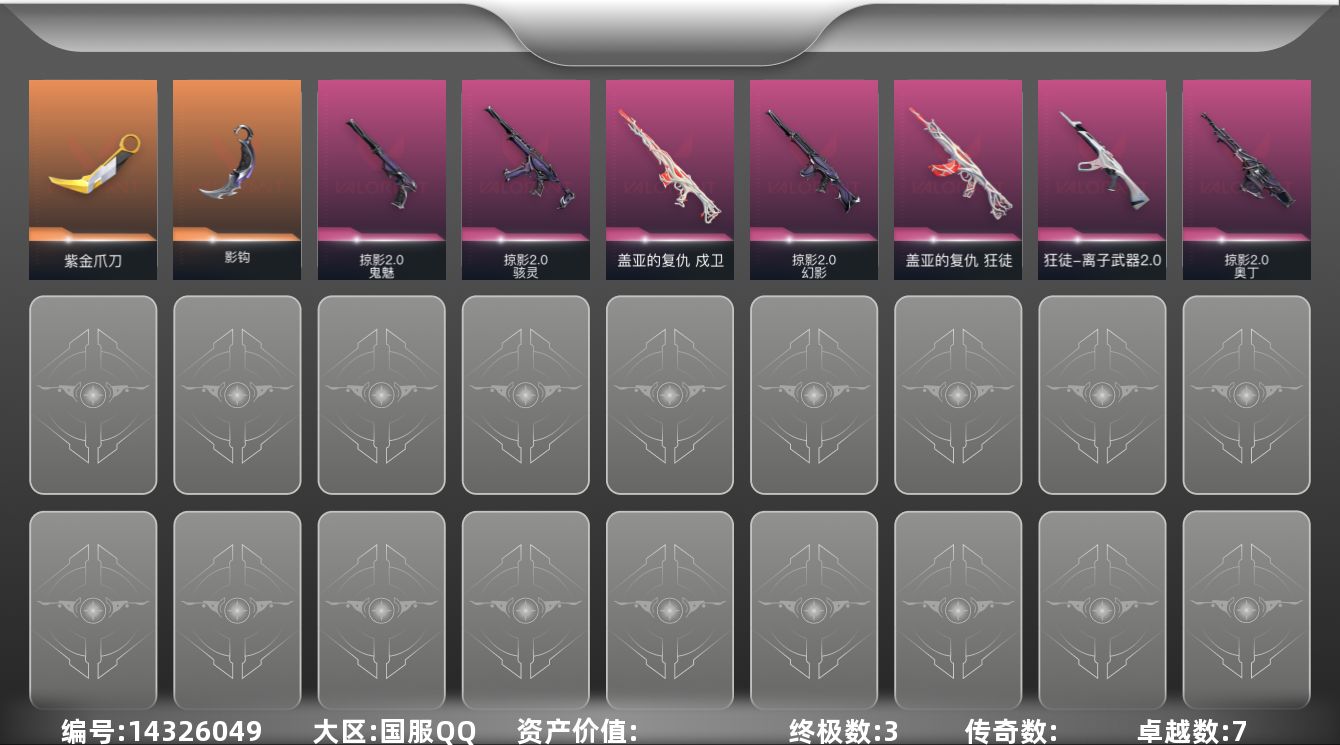 [14326049]【套装】:掠影//2.0套装 【英雄】:炼狱,维斯,暮蝶,壹决,捷风,不死鸟,贤者,猎枭,芮娜,尚勃勒,霓虹 【近战 武器】:近战武器-影钩,近战武器-紫金爪刀,近战武器-阿特拉斯指挥部 甩棍 【狂徒】:狂徒-盖亚的复仇,狂徒-离子武器//2.0 【幻影】:幻影-掠影//2.0 【戍卫】:戍卫-盖亚的复仇 【奥丁】:奥丁-掠影//2.0 【骇灵】:骇灵-掠影//2.0 【鬼魅】:鬼魅-掠影//2.0 【卡面】:排除故障 卡面,树懒大作战 卡面,无垠星环 卡面,《双城之战》金克丝 卡面,势不可挡//K/O 卡面,代号红色 卡面,新兵报到 卡面,V契约 卡面,无畏契约 卡面 【喷漆】:无畏契约GO!第一卷:零 喷漆,无畏契约GO!第一卷:贤者 喷漆,放下武器 喷漆,胜利属于无畏契约 喷漆,GLHF 喷漆,无畏契约 喷漆 【挂饰】:动力机箱 挂饰,《双城之战》魄罗 挂饰,无畏契约 纪念币 挂饰