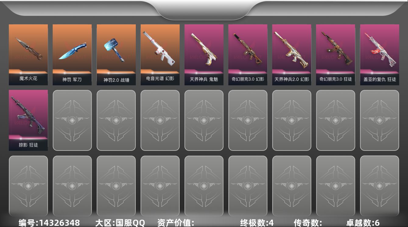 - [12135486]24橙皮 1金皮 9紫皮 112皮肤 14英雄 124卡面 1140已用源晶 超凡 优质装备:2024全球冠军赛套装,幻影-2024全球冠军赛,狂徒-紫阙金琅,狂徒-机动狂飙,正义-机动狂飙,标配-紫阙金琅,飞将-天界神兵,狂徒-盖世英雄,剥皮小刀,紫金爪刀,鬼魅-奇幻朋克,荒土机兵热能刀,镭切,神圣领域 战刀,VCT 2025 爪刀,诡秘蛇影,阿特拉斯指挥部,骇灵-洪荒怒焰,雄鹿-离子武器 亮点皮肤:战刀-2024全球冠军赛 套装:VCT 2025赛季礼包,VCTCN2025套装,创·纪元套装 佩枪皮肤:正义-创·纪元,正义-虚空遗器,标配-VCTxEDG 冲锋枪皮肤:骇灵-创·纪元 步枪皮肤:幻影-异鳞魔蛇,狂徒-创·纪元,狂徒-虚空遗器,狂徒-噬影者,RGX 11z pro 狂徒,戌卫-电音光谱,狂徒-海洋之星,狂徒-堕天遗武 狙击枪皮肤:莽侠-创·纪元,冥驹-上古龙炎