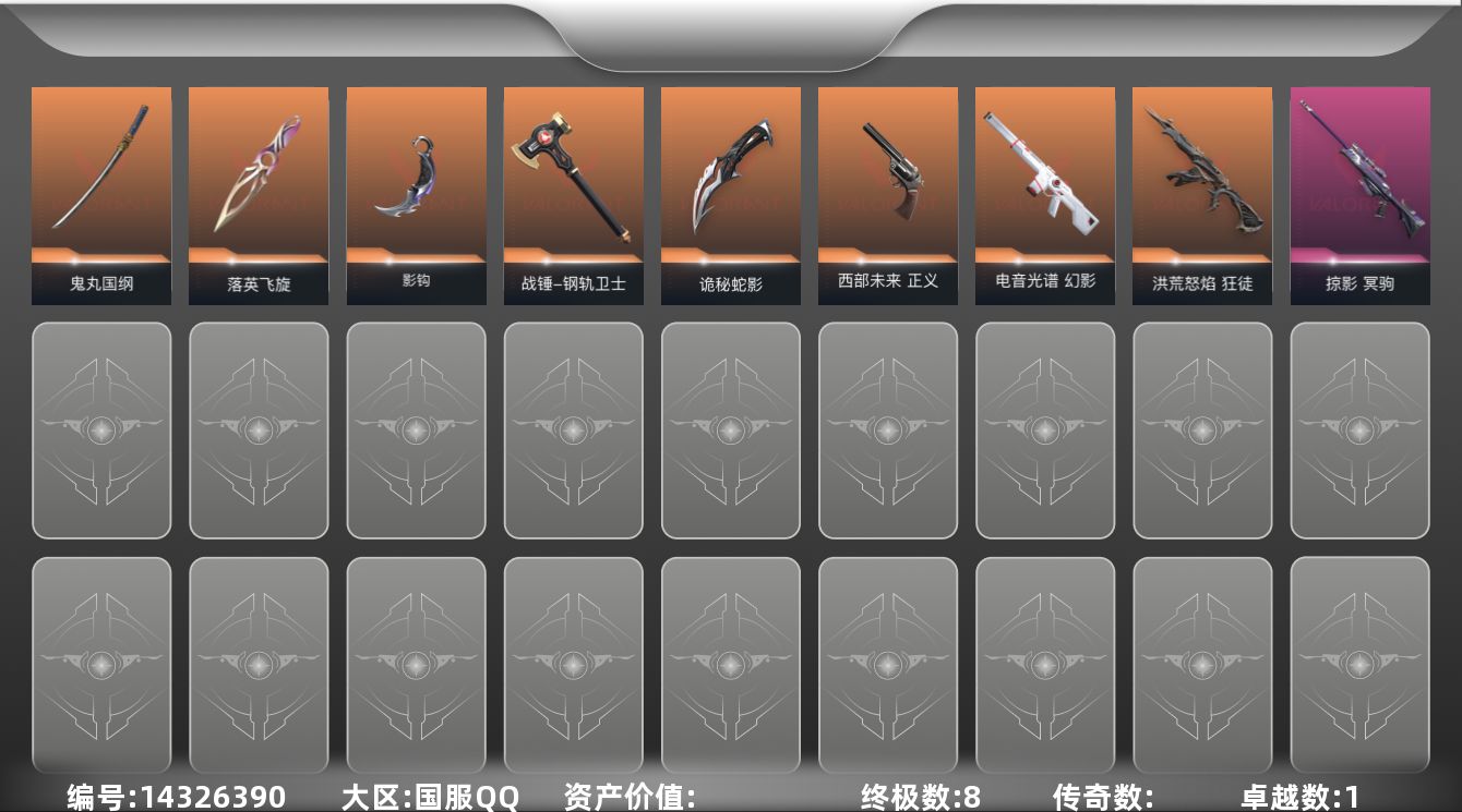 [14326390]【英雄】:幻棱,炼狱,维斯,暮蝶,钛狐,壹决,铁臂,捷风,雷兹,幽影,不死鸟,贤者,猎枭,蝰蛇,零,芮娜,奇乐,尚勃勒,霓虹,斯凯,夜露,星礈,K/O,海神,盖可,黑梦,钢锁 【近战 武器】:近战武器-影钩,近战武器-落英飞旋,近战武器-鬼丸国纲,近战武器-钢轨卫士 战锤,近战武器-诡秘蛇影 军刀 【狂徒】:狂徒-洪荒怒焰,狂徒-钢轨卫士,狂徒-诡秘蛇影 【幻影】:幻影-电音光谱,幻影-战术小伙伴,幻影-末日之翼,幻影-电音光谱 【戍卫】:戍卫-钢轨卫士,戍卫-折光棱晶 【獠犬】:獠犬-战术小伙伴 【冥驹】:冥驹-掠影 【飞将】:飞将-光导纤维,飞将-末日之翼 【莽侠】:莽侠-诡秘蛇影 【奥丁】:奥丁-战术小伙伴,奥丁-末日之翼 【判官】:判官-诡秘蛇影 【骇灵】:骇灵-光导纤维 【蜂刺】:蜂刺-战术小伙伴,蜂刺-折光棱晶 【标配】:标配-超能偶像,标配-光导纤维,标配-折光棱晶 【正义】:正义-西部未来,正义-超限闪存,正义-传奇制造,正义-复古浪潮,正义-纳米打击 【鬼魅】:鬼魅-流星兵团,鬼魅-诡秘蛇影,鬼魅-光导纤维,鬼魅-扑棱扑棱,鬼魅-星云暗涌 【狂怒】:狂怒-钢轨卫士 【短炮】:短炮-钢轨卫士,短炮-末日之翼 【卡面】:终章:激斗汉堡 卡面,进入射程 卡面,《双城之战》拥抱 卡面,精灵大战 卡面,欢迎来到底城 卡面,南瓜盛典 卡面,钢弓与箭弦 卡面,无畏契约:暮蝶 卡面,修车达人 卡面,热舞环节 卡面,正义的化身 卡面,铁之华 卡面,音熊登场 卡面,树懒大作战 卡面,声感陷阱设计图 卡面,红鳞松叶 卡面,霓帧牛蛙 卡面,梦幻奶茶 卡面,趁热吃 卡面,无畏契约:尚勃勒 卡面,源能反应 卡面,零点嗅探设计图 卡面,终章:瓦娃脸雪糕 卡面,表象之下 卡面,沙雕爆能器 卡面,无畏契约GO!第一卷:芮娜 卡面,清除名单 卡面,无畏契约GO!第一卷:零 卡面,终章:同步耍酷 卡面,龍记 卡面,化茧成蝶 卡面,比比看谁快? 卡面,《双城之战》金克丝 卡面,蝰蛇vs幽影 卡面,势不可挡//盖可 卡面,逆向独行 卡面 ,同步耍酷 卡面,完美调谐 卡面 ,没有什么能逃过我的眼睛 卡面,光导纤维 卡面,战术小伙伴 卡面,钢轨卫士 卡面,暗枪 卡面,钢锁vs盖可 卡面,别冒尖 卡面,代号红色 卡面,新兵报到 卡面,V契约 卡面,无畏契约 卡面 【喷漆】:嗨宝南瓜灯 喷漆,嘭