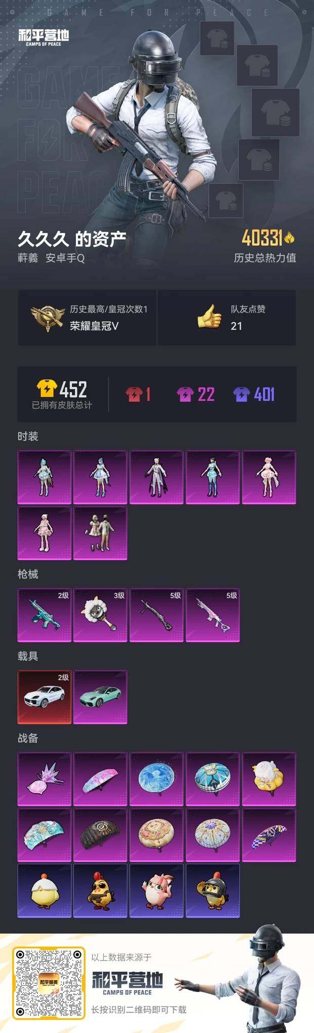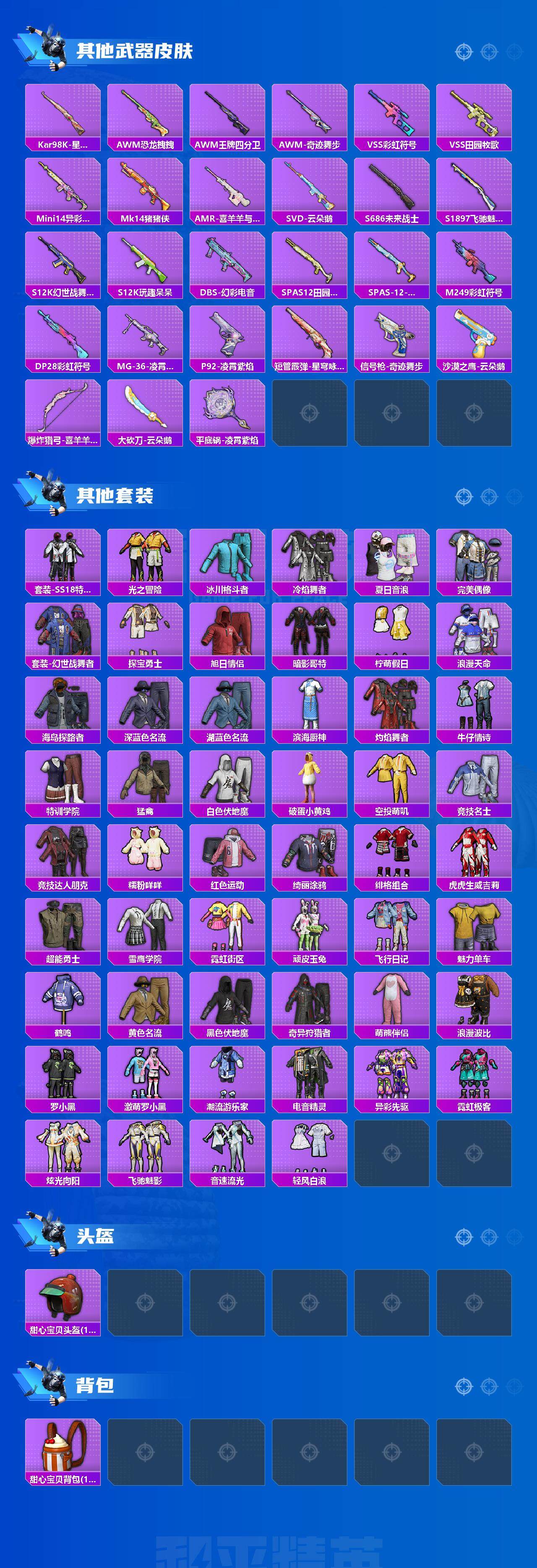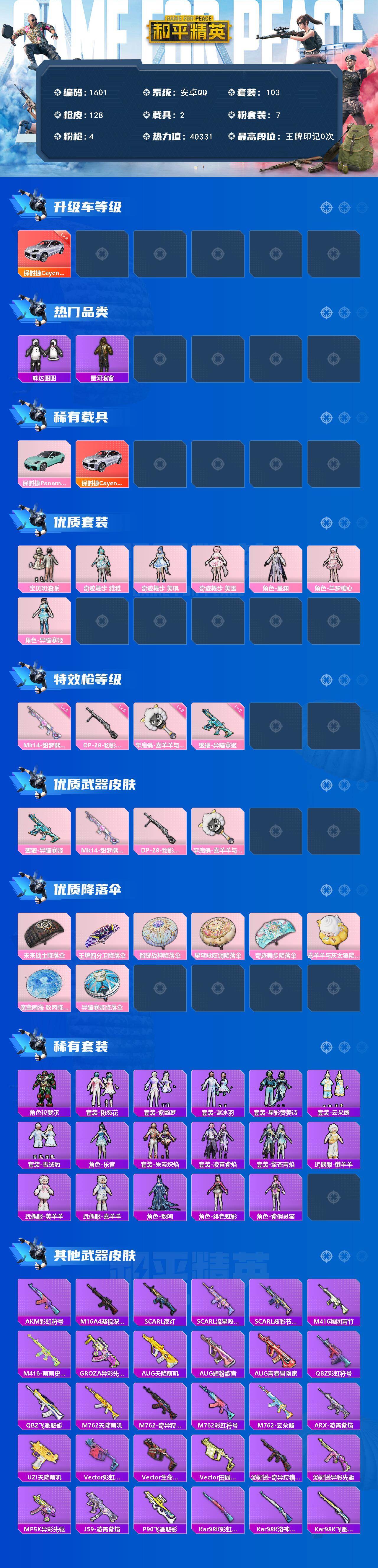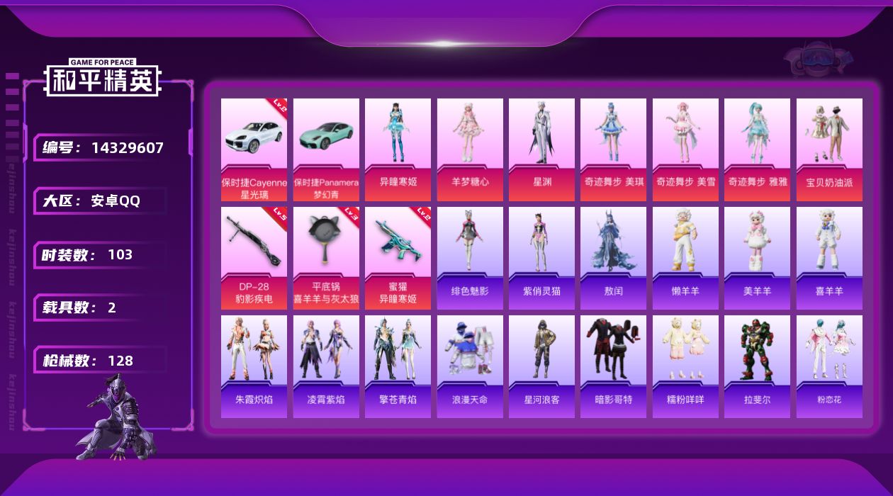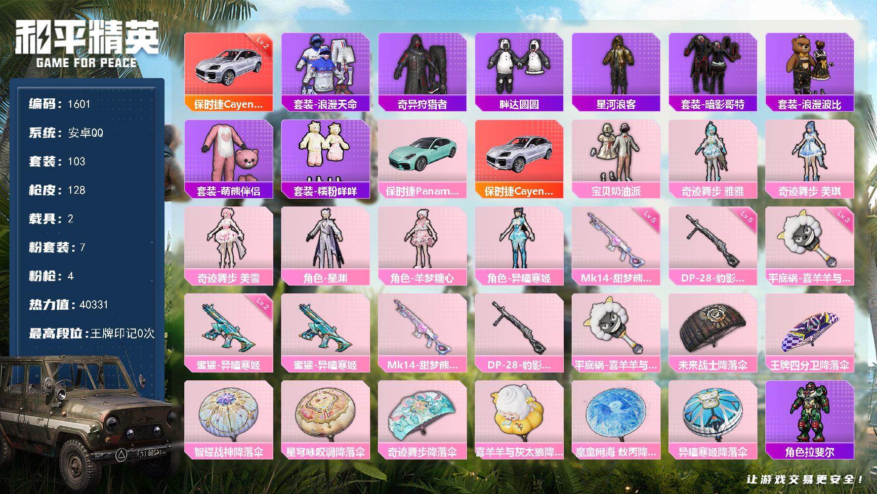 [14329607]安卓 手Q-7粉装-4特效枪-2载具-1粉色飞行器-40331热力值-1王牌印记-103套装-128枪皮 【红色载具】:保时捷Cayenne(星光璃)(二级) 【热门品类】:套装-浪漫天命,套装-奇异狩猎者,套装-胖达圆圆,套装-星河浪客,套装-暗影哥特,套装-浪漫波比,套装-萌熊伴侣,套装-糯粉咩咩 【粉色载具】:保时捷Panamera(梦幻青),保时捷Cayenne(星光璃) 【粉色套装】:粉装-宝贝奶油派,角色-奇迹舞步 雅雅,角色-奇迹舞步 美琪,角色-奇迹舞步 美雪,角色-星渊,角色-羊梦糖心,角色-异瞳寒姬 【粉色枪皮等级】:蜜獾-异瞳寒姬(二级),Mk14-甜梦熊击(五级),DP-28-豹影疾电(五级),平底锅-喜羊羊与灰太狼(三级) 【粉色枪皮】:蜜獾-异瞳寒姬,Mk14-甜梦熊击,DP-28-豹影疾电,平底锅-喜羊羊与灰太狼 【粉色降落伞】:未来战士降落伞,王牌四分卫降落伞,智耀战神降落伞,星穹咏叹调降落伞,奇迹舞步降落伞,喜羊羊与灰太狼降落伞,魔童闹海 敖丙降落伞,异瞳寒姬降落伞 【稀有套装】:角色-拉斐尔,套装-粉恋花,套装-紫幽梦,套装-蓝冰羽,套装-星影赞美诗,套装-云朵鹅,套装-雪绒豹,角色-乐音,套装-朱霞炽焰,套装-凌霄紫焰,套装-擎苍青焰,玩偶服-懒羊羊,玩偶服-美羊羊,玩偶服-喜羊羊,角色-敖闰,角色-绯色魅影,角色-紫俏灵猫,套装-炫彩糖果,套装-雁字回时 【稀有枪皮】:AUG-冰晶雪宝,AKM-彩虹符号,M16A4-凝视深渊,SCAR-L-夜灯,SCAR-L-流星咚咚,SCAR-L-炫彩节奏,M416-糯团青竹,M416-萌萌史莱姆,GROZA-异彩先驱,AUG-天降萌叽,AUG-耀粉歌者,AUG-青春冒险家,QBZ-彩虹符号,QBZ-飞驰魅影,M762-天降萌叽,M762-奇异狩猎者,M762-彩虹符号,M762-云朵鹅,ARX-凌霄紫焰,UZI-天降萌叽,Vector-彩虹符号,Vector-生命誓言,Vector-田园牧歌,汤姆逊-奇异狩猎者,汤姆逊-异彩先驱,MP5K-异彩先驱,JS9-凌霄紫焰,P90-飞驰魅影,Kar98K-彩虹符号,Kar98K-洛神天依,Kar98K-飞驰魅影,Kar98K-星穹咏叹调,AWM-恐龙拽拽,AWM-王牌四分卫,AWM-奇迹舞步,VSS-彩虹符号,VSS-田园牧歌,Mini14-异
