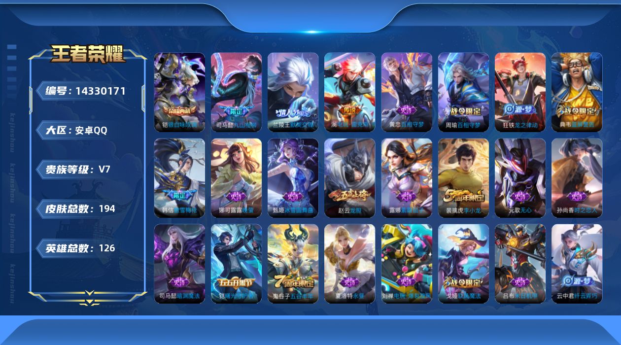 [14330171]可二次【店主推荐捡漏号!可直接换绑】:安卓Q-V7-最强王者段位-126英雄-194皮肤-1典藏皮肤-3传说-42史诗