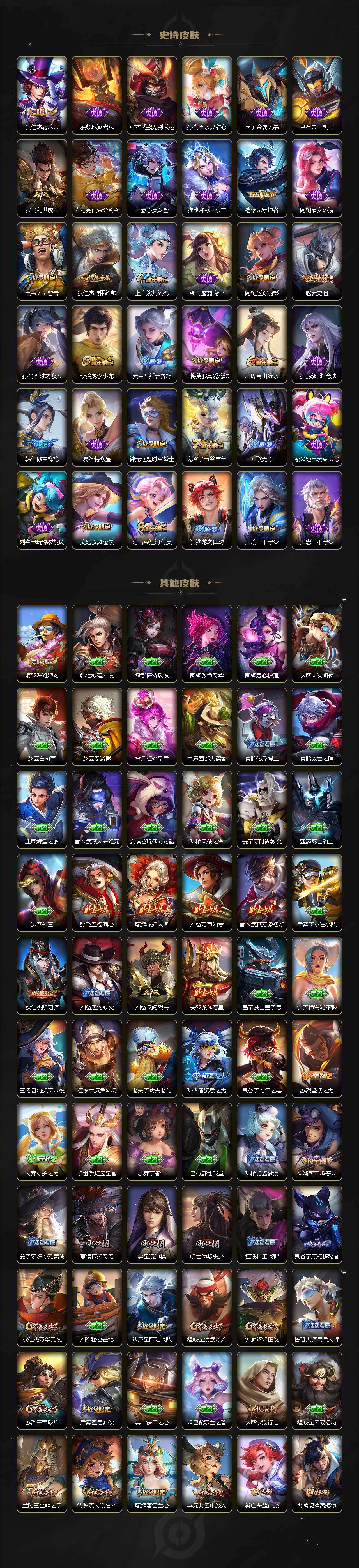 【史诗皮肤】:项羽苍穹之光,露娜紫霞仙子,赵云皇家上将,赵云未来纪元,貂蝉圣诞恋歌,甄姬冰雪圆舞曲,狄仁杰魔术师,廉颇地狱岩魂,宫本武藏鬼剑武藏,孙尚香水果甜心,墨子金属风暴,吕布末日机甲,张飞乱世虎臣,诸葛亮黄金分割率,亚瑟心灵战警,雅典娜冰冠公主,铠曙光守护者,阿轲节奏热浪,典韦蓝屏警告,狄仁杰鹰眼统帅,上官婉儿梁祝,娜可露露晚萤,阿轲迷踪丽影,赵云龙胆,孙尚香时之恋人,裴擒虎李小龙,云中君纤云弄巧,干将莫邪真爱魔法,庄周高山流水,司马懿暗渊魔法,韩信傲雪梅枪,夏洛特永昼,钟无艳超时空战士,鬼谷子五谷丰年,元歌无心,蔡文姬电玩兔顽号,刘禅电玩爆裂旋风,戈娅驭风魔法,阿