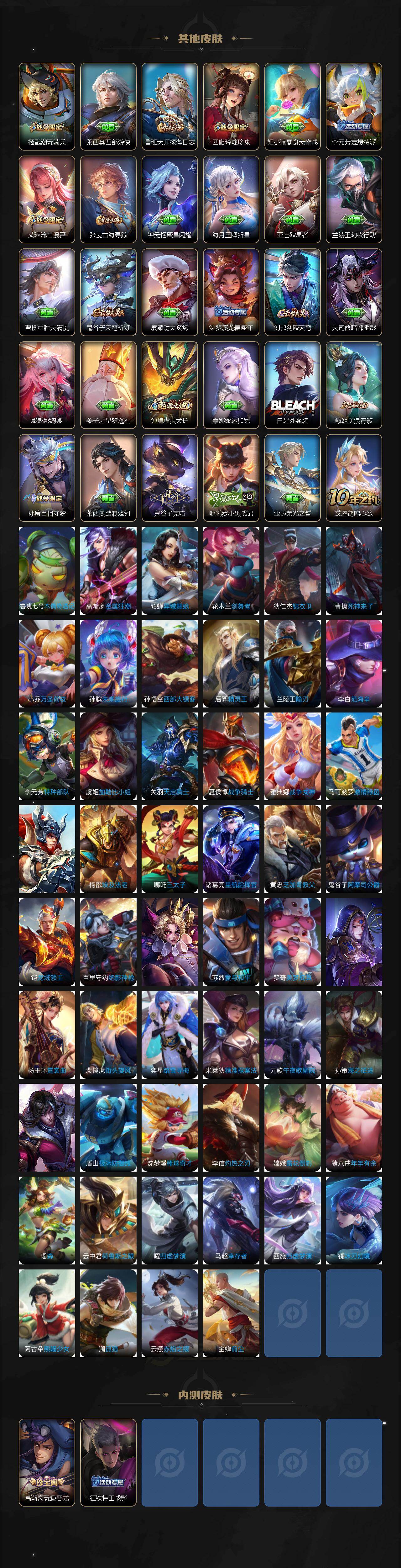 【限定皮肤】:狄仁杰阴阳师,赵云皇家上将,赵云龙胆,庄周高山流水,高渐离玩趣恶龙,阿轲迷踪丽影,钟无艳超时空战士,元歌无心,夏侯惇朔风刀,甄姬落雪兰心,典韦蓝屏警告,狄仁杰魔术师,狄仁杰万华元夜,达摩星际陆战队,达摩沙漠行僧,项羽海滩派对,程咬金演武夺筹,韩信傲雪梅枪,兰陵王默契交锋,兰陵王金庭之子,后羿圣弓游侠,李元芳云中旅人,钟馗驱傩正仪,杨戬潮玩骑兵,干将莫邪真爱魔法,鬼谷子原初探秘者,鬼谷子五谷丰年,苏烈千军破阵,弈星混沌棋,沈梦溪大漠名商,明世隐疑决卦,裴擒虎李小龙,裴擒虎擒涛扼浪,云中君纤云弄巧,上官婉儿梁祝,西施玲珑珍味,鲁班大师探海日志,桑启海盐诗旅,戈娅驭风魔法,艾琳流音漫舞,阿古朵江河有灵,张良古海寻踪,鬼谷子天穹祈灯,沈梦溪龙舞盛年,刘邦剑破天穹