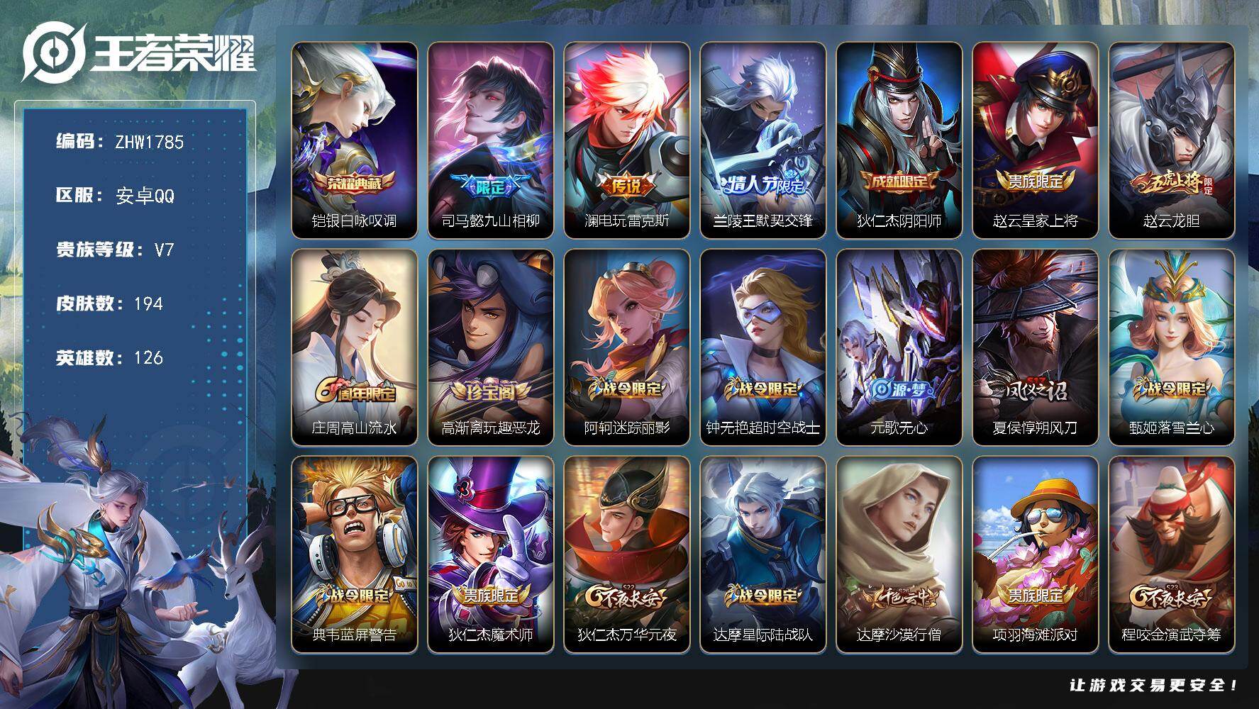 [14330171]可二次【店主推荐捡漏号!可直接换绑】:安卓Q-V7-最强王者段位-126英雄-194皮肤-1典藏皮肤-3传说-42史诗 【英雄全皮】:司马懿全皮,鬼谷子全皮,影全皮 【荣耀典藏】:铠银白咏叹调 【传说皮肤】:司马懿九山相柳,澜电玩雷克斯,兰陵王默契交锋 【限定皮肤】:狄仁杰阴阳师,赵云皇家上将,赵云龙胆,庄周高山流水,高渐离玩趣恶龙,阿轲迷踪丽影,钟无艳超时空战士,元歌无心,夏侯惇朔风刀,甄姬落雪兰心,典韦蓝屏警告,狄仁杰魔术师,狄仁杰万华元夜,达摩星际陆战队,达摩沙漠行僧,项羽海滩派对,程咬金演武夺筹,韩信傲雪梅枪,兰陵王默契交锋,兰陵王金庭之子,后羿圣弓游侠,李元芳云中旅人,钟馗驱傩正仪,杨戬潮玩骑兵,干将莫邪真爱魔法,鬼谷子原初探秘者,鬼谷子五谷丰年,苏烈千军破阵,弈星混沌棋,沈梦溪大漠名商,明世隐疑决卦,裴擒虎李小龙,裴擒虎擒涛扼浪,云中君纤云弄巧,上官婉儿梁祝,西施玲珑珍味,鲁班大师探海日志,桑启海盐诗旅,戈娅驭风魔法,艾琳流音漫舞,阿古朵江河有灵,张良古海寻踪,鬼谷子天穹祈灯,沈梦溪龙舞盛年,刘邦剑破天穹 【年限皮肤】:赵云龙胆 【赛季限定】:夏侯惇朔风刀,狄仁杰万华元夜,达摩沙漠行僧,程咬金演武夺筹,兰陵王金庭之子,张良古海寻踪,李元芳云中旅人,钟馗驱傩正仪,鬼谷子原初探秘者,苏烈千军破阵,弈星混沌棋,沈梦溪大漠名商,明世隐疑决卦,裴擒虎擒涛扼浪,鲁班大师探海日志,桑启海盐诗旅,鬼谷子天穹祈灯,刘邦剑破天穹 【战令限定】:阿轲迷踪丽影,钟无艳超时空战士,甄姬落雪兰心,典韦蓝屏警告,达摩星际陆战队,艾琳流音漫舞,后羿圣弓游侠,杨戬潮玩骑兵,干将莫邪真爱魔法,西施玲珑珍味,戈娅驭风魔法 【史诗皮肤】:项羽苍穹之光,露娜紫霞仙子,赵云皇家上将,赵云未来纪元,貂蝉圣诞恋歌,甄姬冰雪圆舞曲,狄仁杰魔术师,廉颇地狱岩魂,宫本武藏鬼剑武藏,孙尚香水果甜心,墨子金属风暴,吕布末日机甲,张飞乱世虎臣,诸葛亮黄金分割率,亚瑟心灵战警,雅典娜冰冠公主,铠曙光守护者,阿轲节奏热浪,典韦蓝屏警告,狄仁杰鹰眼统帅,上官婉儿梁祝,娜可露露晚萤,阿轲迷踪丽影,赵云龙胆,孙尚香时之恋人,裴擒虎李小龙,云中君纤云弄巧,干将莫邪真爱魔法,庄周高山流水,司马懿暗渊魔法,韩信傲雪梅枪,夏洛特永昼,钟无艳超时空战士,鬼谷子五谷丰年,元歌无心,蔡文姬电玩兔顽号,刘禅电玩爆裂旋风,戈娅驭风魔法,阿