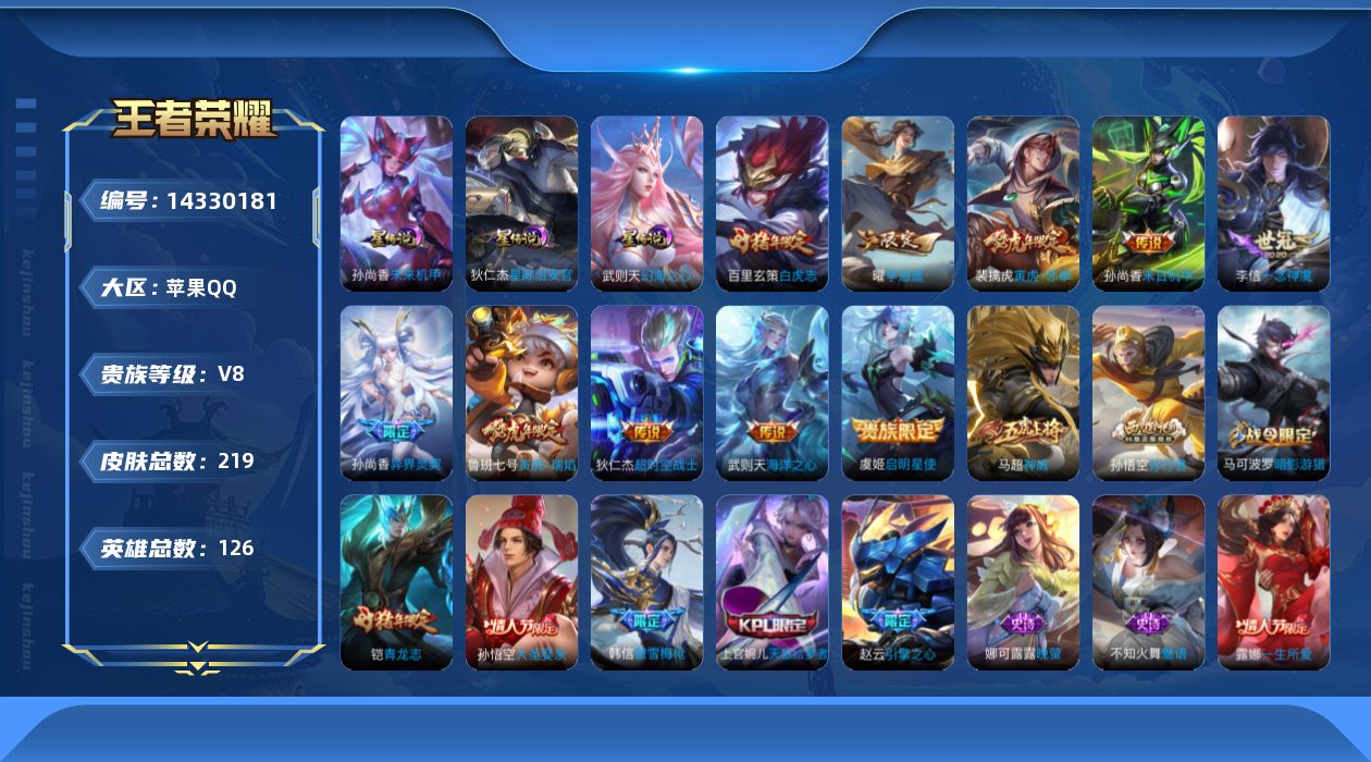 [14330181]可二次,【店主推荐捡漏号!可直接换绑】苹果Q-V8-荣耀黄金I段位-125英雄-219皮肤-1典藏英雄-10传说-64史诗 【荣耀典藏】:武则天英雄 【传说皮肤】:裴擒虎寅虎赤拳,鲁班七号寅虎瑞焰,孙尚香异界灵契,曜李逍遥 ,虞姬启明星使,李信一念神魔,百里玄策白虎志,孙尚香末日机甲,武则天海洋之心,狄仁杰超时空战士 【限定皮肤】:白起狰,狄仁杰阴阳师,廉颇寅虎御盾,赵云皇家上将,赵云引擎之心,嬴政白昼王子,孙尚香异界灵契,鲁班七号寅虎瑞焰,庄周高山流水,高渐离死亡摇滚,白起夜都怪侠,芈月重明,芈月幻夜卜梦,吕布猎兽之王,夏侯惇朔风刀,甄姬游园惊梦,曹操烛龙,典韦穷奇,马可波罗暗影游猎,狄仁杰魔术师,狄仁杰万华元夜,达摩沙漠行僧,项羽海滩派对,老夫子醍醐杖,程咬金演武夺筹,露娜一生所爱,韩信逐梦之影,韩信傲雪梅枪,兰陵王金庭之子,花木兰瑞麟志,孙悟空大圣娶亲,孙悟空孙行者,后羿圣弓游侠,李元芳银河之约,李元芳云中旅人,虞姬启明星使,钟馗驱傩正仪,干将莫邪真爱魔法,雅典娜单词大作战,蔡文姬繁星吟游,太乙真人饕餮,鬼谷子原初探秘者,鬼谷子五谷丰年,黄忠火炮绅士,铠青龙志,苏烈千军破阵,百里玄策白虎志,弈星混沌棋,沈梦溪星空之诺,沈梦溪大漠名商,明世隐疑决卦,明世隐吟游魔法,裴擒虎李小龙,裴擒虎寅虎赤拳,狂铁御狮,米莱狄御霄,云中君纤云弄巧,伽罗天狼溯光者,盾山御銮,猪八戒西部大镖客,上官婉儿天狼绘梦者,嫦娥拒霜思,曜李逍遥 ,蒙犽狂想玩偶喵,鲁班大师探海日志,镜匿光追影者,桑启海盐诗旅,艾琳女武神,鬼谷子天穹祈灯,刘邦剑破天穹,程咬金群星魔术团 【年限皮肤】:百里玄策白虎志,花木兰瑞麟志,铠青龙志,裴擒虎寅虎赤拳,鲁班七号寅虎瑞焰,廉颇寅虎御盾,马超神威 【赛季限定】:白起狰,芈月重明,夏侯惇朔风刀,曹操烛龙,典韦穷奇,狄仁杰万华元夜,达摩沙漠行僧,老夫子醍醐杖,程咬金演武夺筹,兰陵王金庭之子,李元芳云中旅人,钟馗驱傩正仪,太乙真人饕餮,鬼谷子原初探秘者,苏烈千军破阵,弈星混沌棋,沈梦溪大漠名商,明世隐疑决卦,狂铁御狮,米莱狄御霄,盾山御銮,鲁班大师探海日志,桑启海盐诗旅,鬼谷子天穹祈灯,刘邦剑破天穹 【战令限定】:嬴政白昼王子,白起夜都怪侠,芈月幻夜卜梦,吕布猎兽之王,马可波罗暗影游猎,后羿圣弓游侠,李元芳银河之约,干将莫邪真爱魔法,雅典娜单词大作战,黄忠火炮绅士,