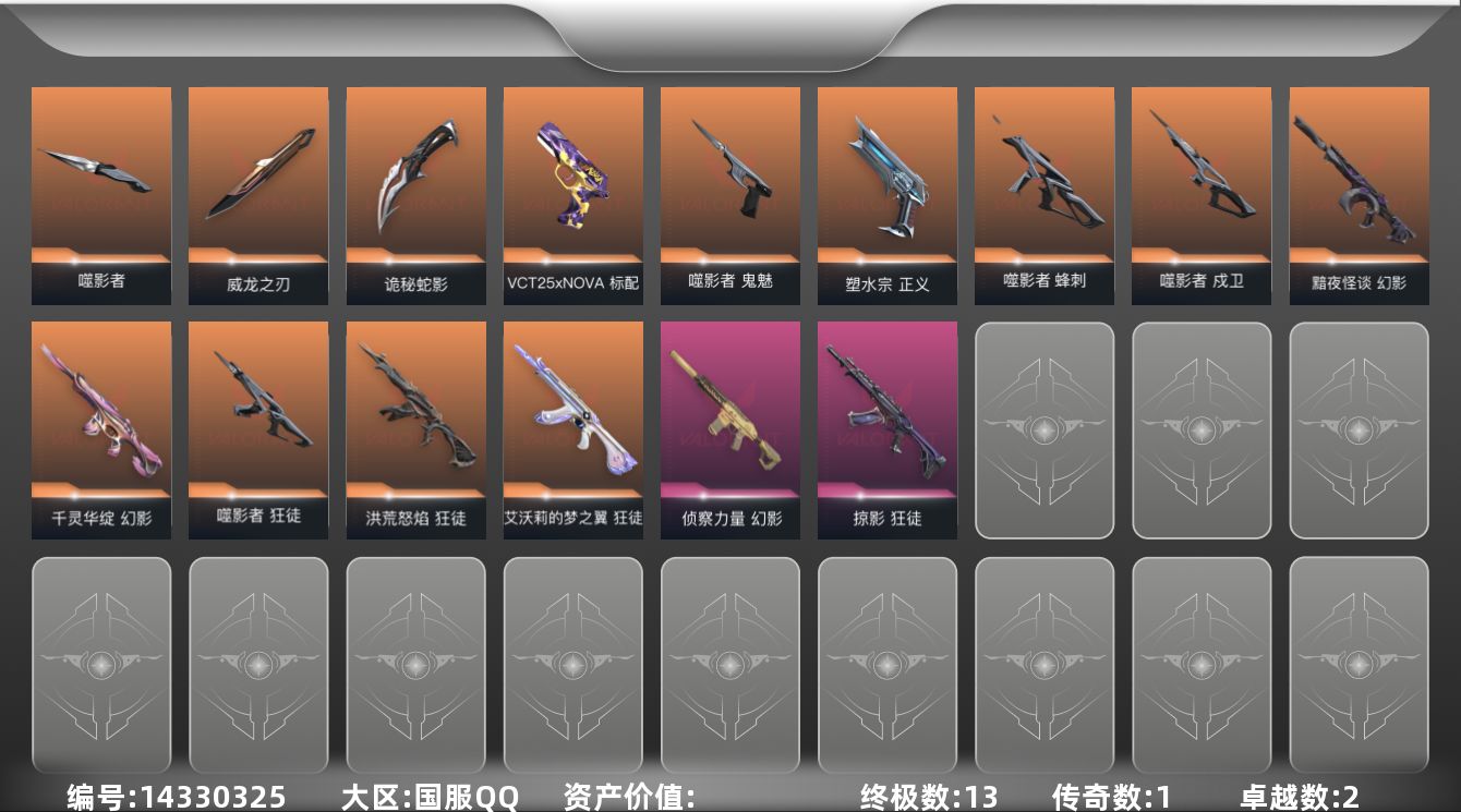 [14330325]【套装】:噬影者套装 【英雄】:幻棱,炼狱,维斯,暮蝶,钛狐,壹决,铁臂,捷风,幽影,不死鸟,贤者,猎枭,蝰蛇,零,芮娜,奇乐,尚勃勒,霓虹,斯凯,夜露,星礈,K/O,黑梦,钢锁 【近战 武器】:近战武器-噬影者 簇刃,近战武器-威龙之刃,近战武器-诡秘蛇影 军刀,近战武器-日耀风暴 遗器 【狂徒】:狂徒-艾沃莉的梦之翼,狂徒-洪荒怒焰,狂徒-噬影者,狂徒-掠影,狂徒-诡秘蛇影 【幻影】:幻影-黯夜怪谈,幻影-千灵华绽,幻影-侦察力量,幻影-末日之翼 【戍卫】:戍卫-噬影者,戍卫-折光棱晶 【飞将】:飞将-末日之翼 【莽侠】:莽侠-诡秘蛇影 【奥丁】:奥丁-末日之翼 【判官】:判官-诡秘蛇影 【蜂刺】:蜂刺-噬影者,蜂刺-折光棱晶 【标配】:标配-折光棱晶 【VCT手枪】:标配-VCT25 x NOVA 【正义】:正义-塑水宗 【鬼魅】:鬼魅-噬影者,鬼魅-诡秘蛇影 【短炮】:短炮-末日之翼 【卡面】:树懒大作战 卡面,梦幻奶茶 卡面,无畏契约GO!第一卷:芮娜 卡面,无畏契约GO!第一卷:零 卡面,无垠星环 卡面,《双城之战》金克丝 卡面,无畏契约GO!第一卷:贤者 卡面,别冒尖 卡面,夯实根基 卡面,代号红色 卡面,新兵报到 卡面,V契约 卡面,无畏契约 卡面 【喷漆】:买装还是存钱 喷漆,无畏契约GO!第一卷:芮娜 喷漆,红鳞 喷漆,无畏契约GO!第一卷:贤者 喷漆,暴走萝莉 喷漆,放下武器 喷漆,胜利属于无畏契约 喷漆,GLHF 喷漆,无畏契约 喷漆 【挂饰】:动力机箱 挂饰,天外飞客 挂饰,《双城之战》魄罗 挂饰,无畏契约 纪念币 挂饰