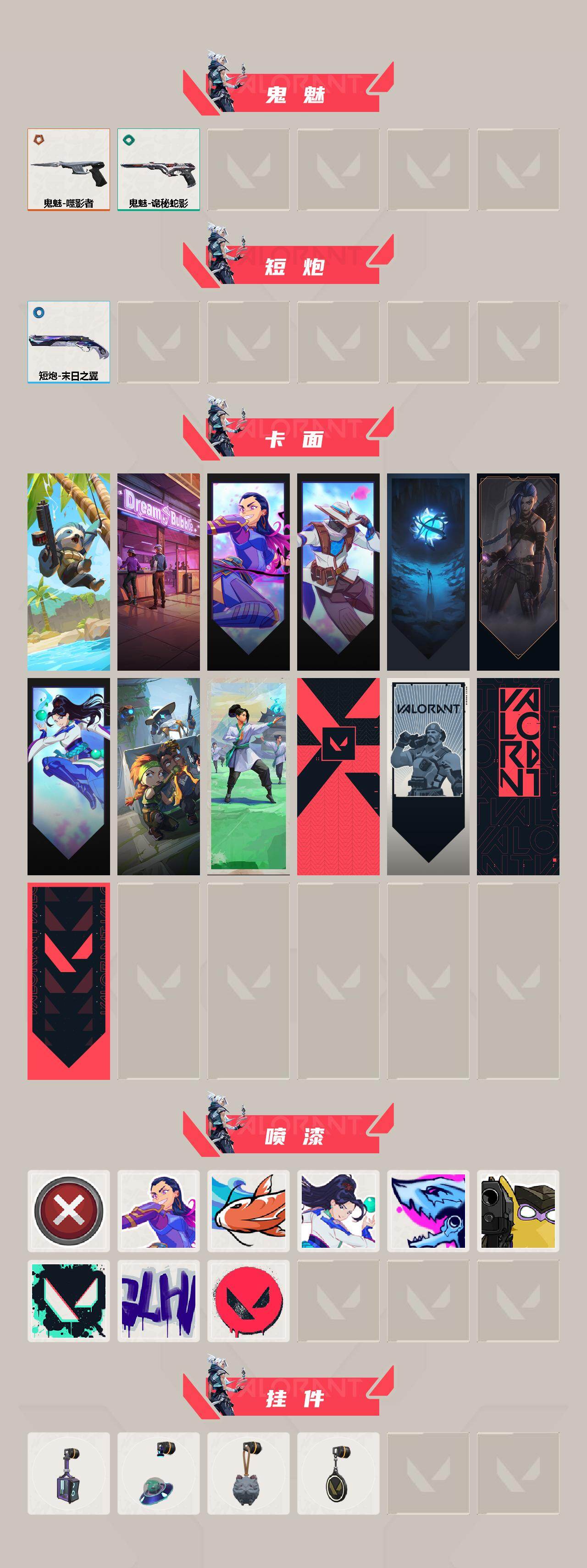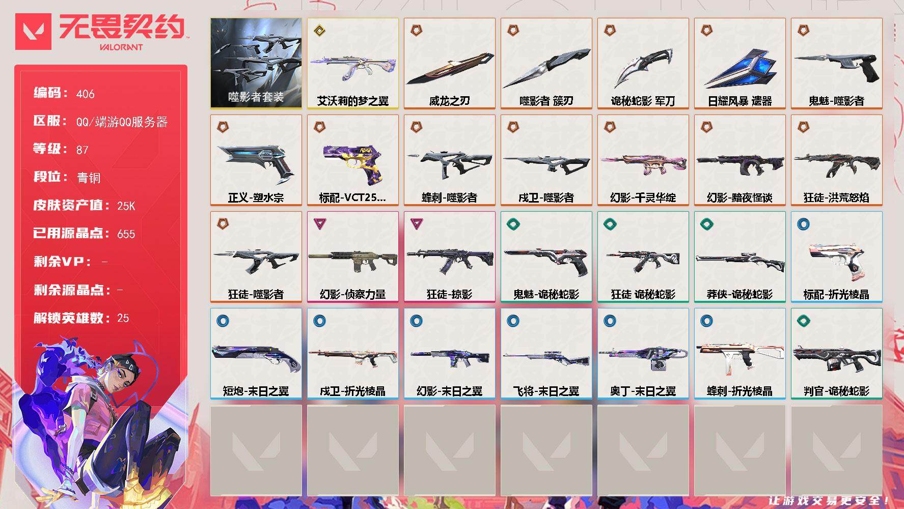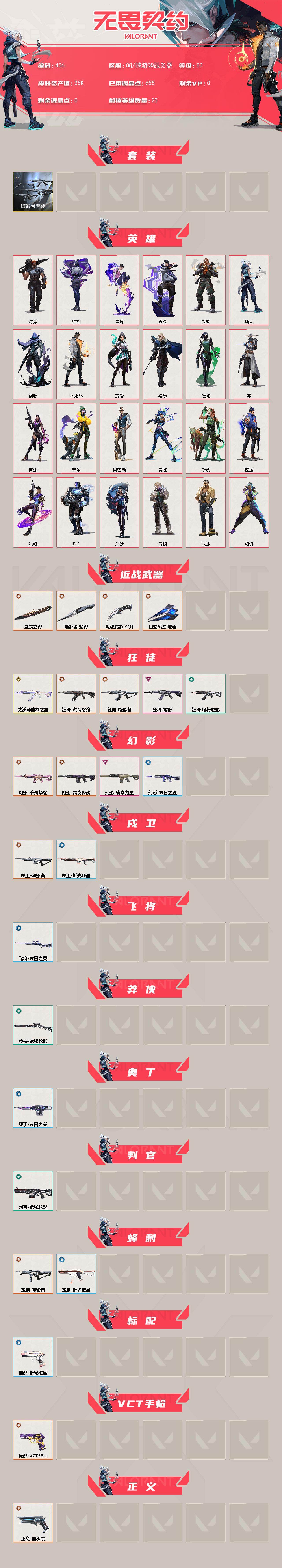 - [12935075]【套装】:2022全球冠军赛套装,VCT 2025 赛季套装 【英雄】:幻棱,炼狱,维斯,暮蝶,钛狐,壹决,铁臂,捷风,雷兹,不死鸟,贤者,猎枭,芮娜,奇乐,尚勃勒,霓虹,K/O,盖可,黑梦 【近战 武器】:近战武器-2022全球冠军赛 蝴蝶刀,近战武器-VCT 2025 爪刀,近战武器-RGX 11z Pro//3.0 爪刀,近战武器-落英飞旋,近战武器-艾沃莉的魔法棒,近战武器-诡秘蛇影 军刀,近战武器-神圣领域 战刀 【狂徒】:狂徒-艾沃莉的梦之翼,狂徒-洪荒怒焰,狂徒-奇点//2.0,狂徒-虚空遗器,狂徒-RGX 11z Pro,狂徒-掠影,狂徒-盖亚的复仇,狂徒-紫阙金琅,狂徒-离子武器//2.0,狂徒-诡秘蛇影 【幻影】:幻影-2022全球冠军赛,幻影-侦察力量,幻影-海洋之星//2.0,幻影-神圣领域,幻影-末日之翼 【戍卫】:戍卫-天界神兵,戍卫-月球哨兵,戍卫-折光棱晶 【獠犬】:獠犬-电音光谱,獠犬-神圣领域,獠犬-电音光谱 【冥驹】:冥驹-星云暗涌 【飞将】:飞将-西部未来,飞将-末日之翼 【莽侠】:莽侠-诡秘蛇影,莽侠-月球哨兵 【战神】:战神-奇点,战神-神圣领域 【奥丁】:奥丁-末日之翼 【判官】:判官-诡秘蛇影 【雄鹿】:雄鹿-源能者危机001,雄鹿-月球哨兵 【骇灵】:骇灵-星云暗涌 【蜂刺】:蜂刺-天界神兵,蜂刺-星云暗涌,蜂刺-折光棱晶 【标配】:标配-电音光谱,标配-折光棱晶,标配-电音光谱 【VCT手枪】:标配-VCT25 x KRÜ 【正义】:正义-西部未来,正义-月球哨兵 【鬼魅】:鬼魅-天界神兵,鬼魅-诡秘蛇影,鬼魅-星云暗涌 【狂怒】:狂怒-神圣领域 【短炮】:短炮-末日之翼 【卡面】:南瓜盛典 卡面,超限闪存 卡面,源能者美容 卡面,无畏契约GO!第一卷:芮娜 卡面,无畏契约GO!第一卷:零 卡面,无垠星环 卡面,战术小伙伴 卡面,代号红色 卡面,新兵报到 卡面,V契约 卡面,无畏契约 卡面 【喷漆】:买装还是存钱 喷漆,酷熊冲浪 喷漆,无畏契约GO!第一卷:零 喷漆,无畏契约GO!第一卷:贤者 喷漆,胜利属于无畏契约 喷漆,GLHF 喷漆,无畏契约 喷漆 【挂饰】:第九季//第三幕 纪念币 挂饰,Z世代特饮 挂饰,天外飞客 挂饰,悠闲鸭 挂饰,海豹的认可 挂饰,无畏契约 纪念币 挂饰