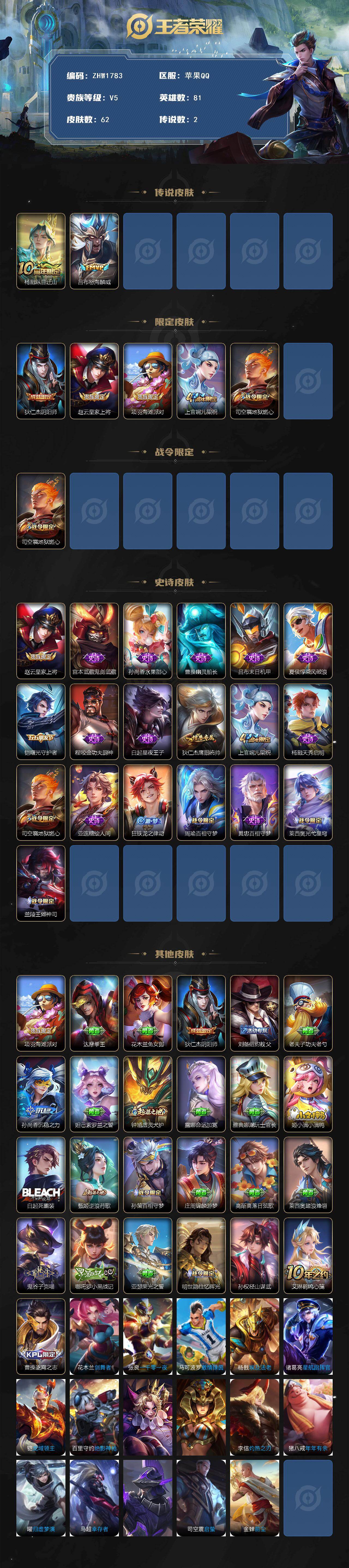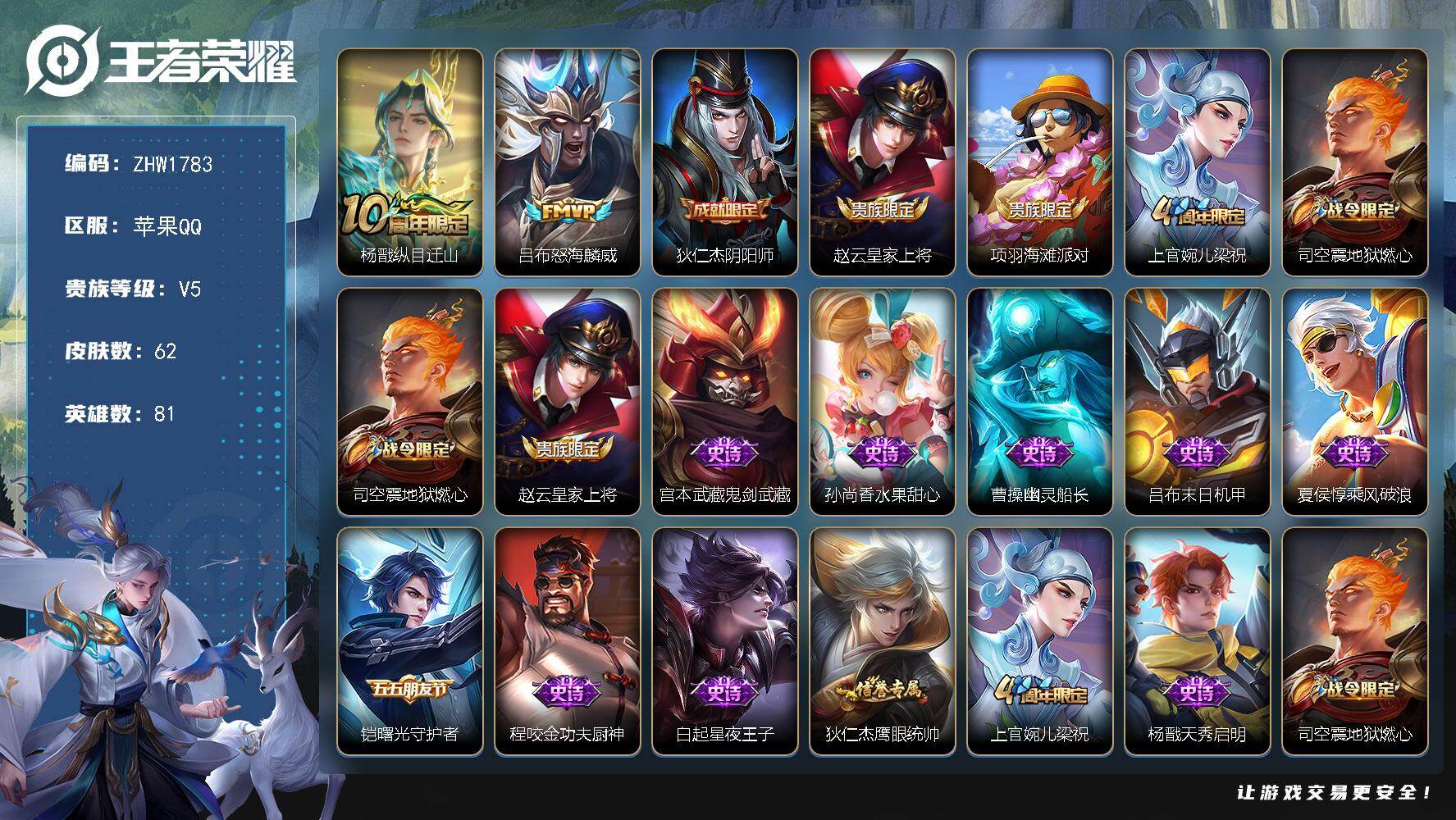 [14330191]可二次【店主推荐捡漏号!可直接换绑】 苹果Q-V5-最强王者段位-81英雄-62皮肤-2传说-19史诗