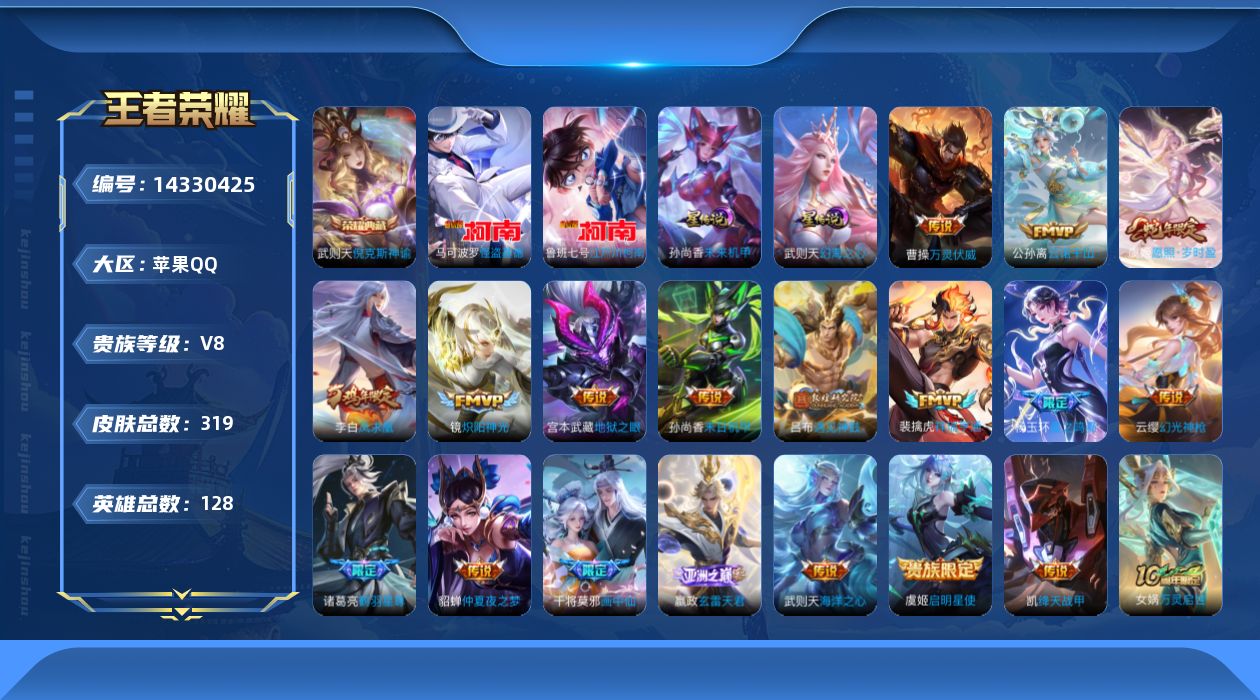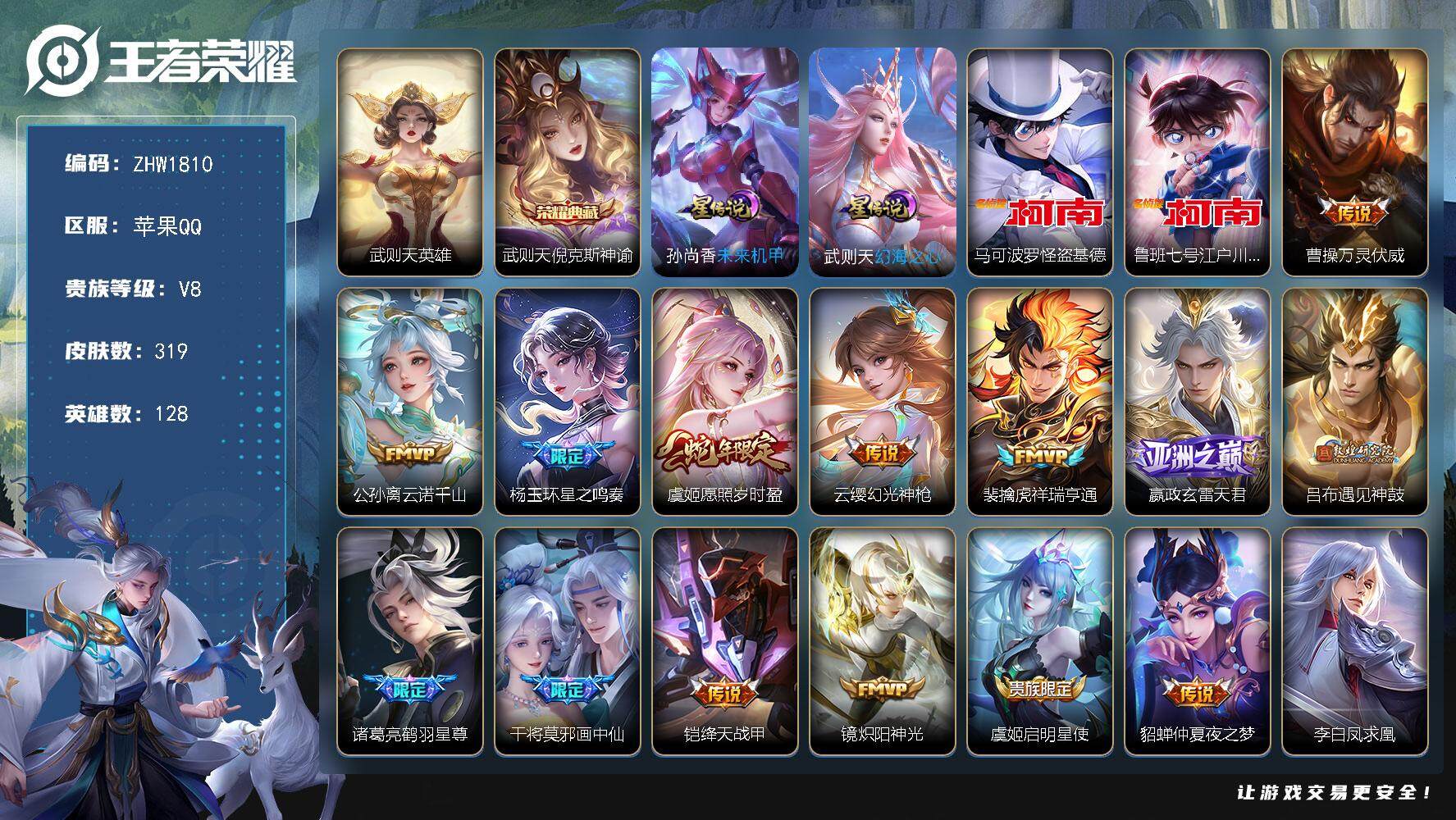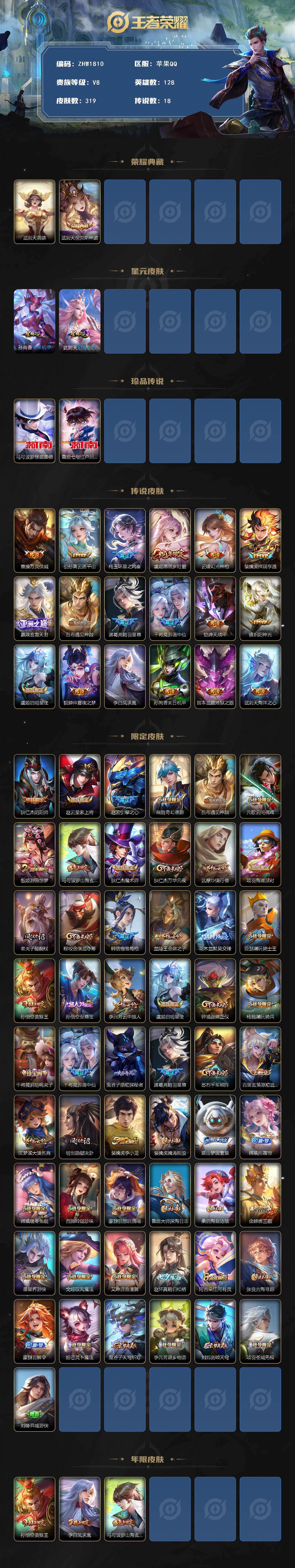 [14330425]【店主推荐捡漏号!可直接换绑】苹果Q-V8-最强王者段位-128英雄-319皮肤-1典藏皮肤-1典藏英雄-2珍品传说-18传说-90史诗-2星元