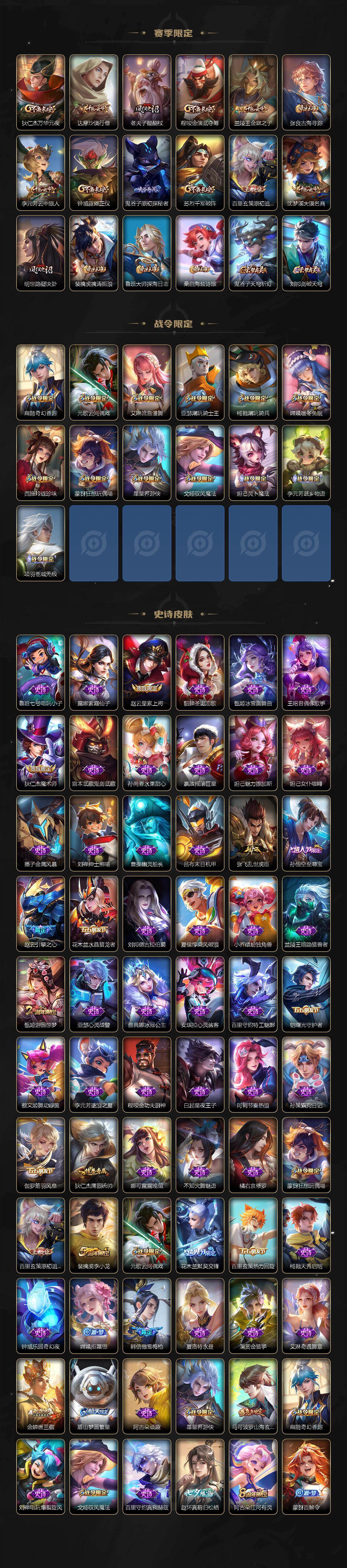 【限定皮肤】:狄仁杰阴阳师,赵云皇家上将,赵云引擎之心,扁鹊奇幻香踪,吕布遇见神鼓,元歌云间偶戏,甄姬游园惊梦,马可波罗山海玄木吟,狄仁杰魔术师,狄仁杰万华元夜,达摩沙漠行僧,项羽海滩派对,老夫子醍醐杖,程咬金演武夺筹,韩信傲雪梅枪,兰陵王金庭之子,花木兰默契交锋,亚瑟潮玩骑士王,孙悟空美猴王,孙悟空至尊宝,李元芳云中旅人,虞姬启明星使,钟馗驱傩正仪,杨戬潮玩骑兵,干将莫邪胡桃夹子,干将莫邪画中仙,鬼谷子原初探秘者,诸葛亮鹤羽星尊,苏烈千军破阵,百里玄策原初追逐者,沈梦溪大漠名商,明世隐疑决卦,裴擒虎李小龙,裴擒虎擒涛扼浪,盾山梦圆繁星,嫦娥拒霜思,嫦娥暖冬兔眠,西施玲珑珍味,蒙犽狂想玩偶喵,鲁班大师探海日志,桑启海盐诗旅,金蝉唐三藏,暃星界游侠,戈娅驭风魔法,艾琳流音漫舞,赵怀真鹤归松栖,阿古朵江河有灵,张良古海寻踪,蒙犽百解令,妲己灵卜魔法,鬼谷子天穹祈灯,李元芳蔬乡物语,刘邦剑破天穹,项羽苍威无极,刘备异域游侠