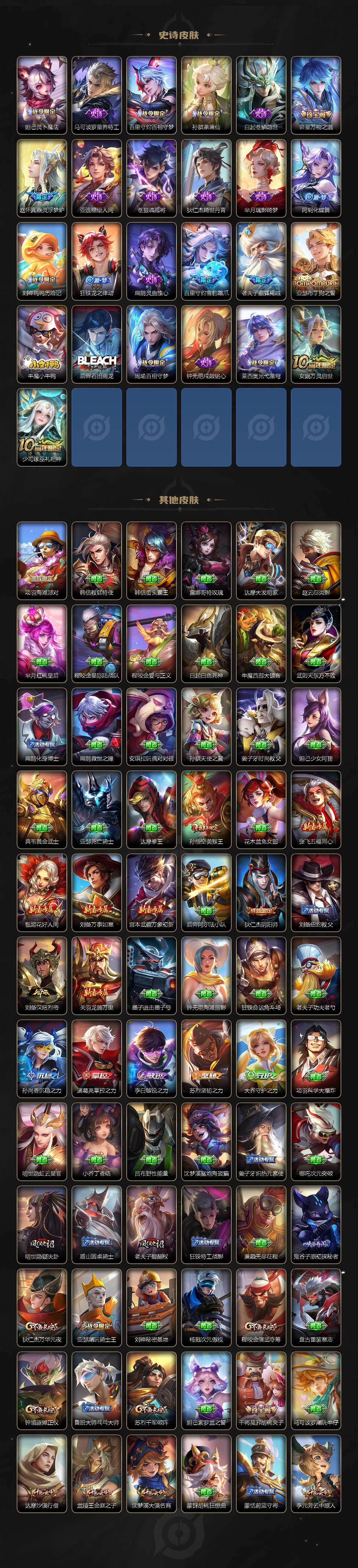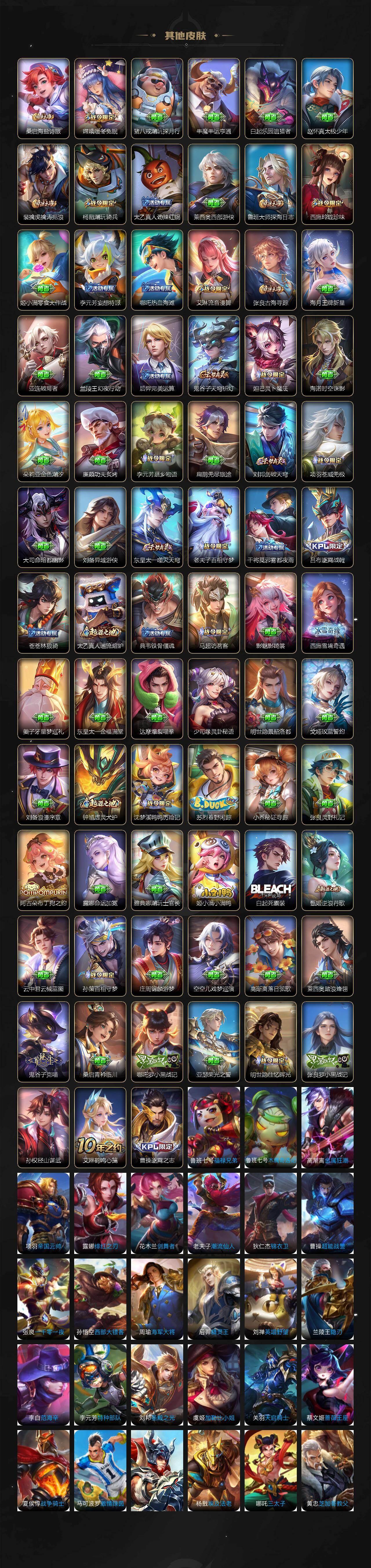 娜可露露晚萤,伽罗箭羽风息,李元芳逐浪之夏,不知火舞魅语,孙策猫狗日记,阿轲节奏热浪,露娜紫霞仙子,王昭君偶像歌手,雅典娜冰冠公主,吕布末日机甲,鲁班七号电玩小子,橘右京修罗,嬴政摇滚巨星,刘禅绅士熊喵,白起星夜王子,安琪拉心灵骇客,程咬金功夫厨神,刘邦德古拉伯爵,兰陵王暗隐猎兽者,曹操幽灵船长,宫本武藏鬼剑武藏,亚瑟心灵战警,钟馗乐园奇幻夜,杨戬天秀·启明,蔡文姬舞动绿茵,小乔缤纷独角兽,夏侯惇乘风破浪,花木兰水晶猎龙者,铠曙光守护者,百里玄策热力回旋,墨子金属风暴,百里玄策原初追逐者,貂蝉圣诞恋歌,百里守约特工魅影,嫦娥拒霜思,夏洛特永昼,澜赏金猎手,艾琳奇遇舞章,阿古朵顽趣,刘禅电玩·爆裂旋风,百里守约真我赫兹,赵怀真鹤归松栖,蒙犽百解令,白起苍鳞隐世,赵怀真器灵·浮梦炉,亚连糖绘人间,苍狼魂孤将,狄仁杰绮世丹青