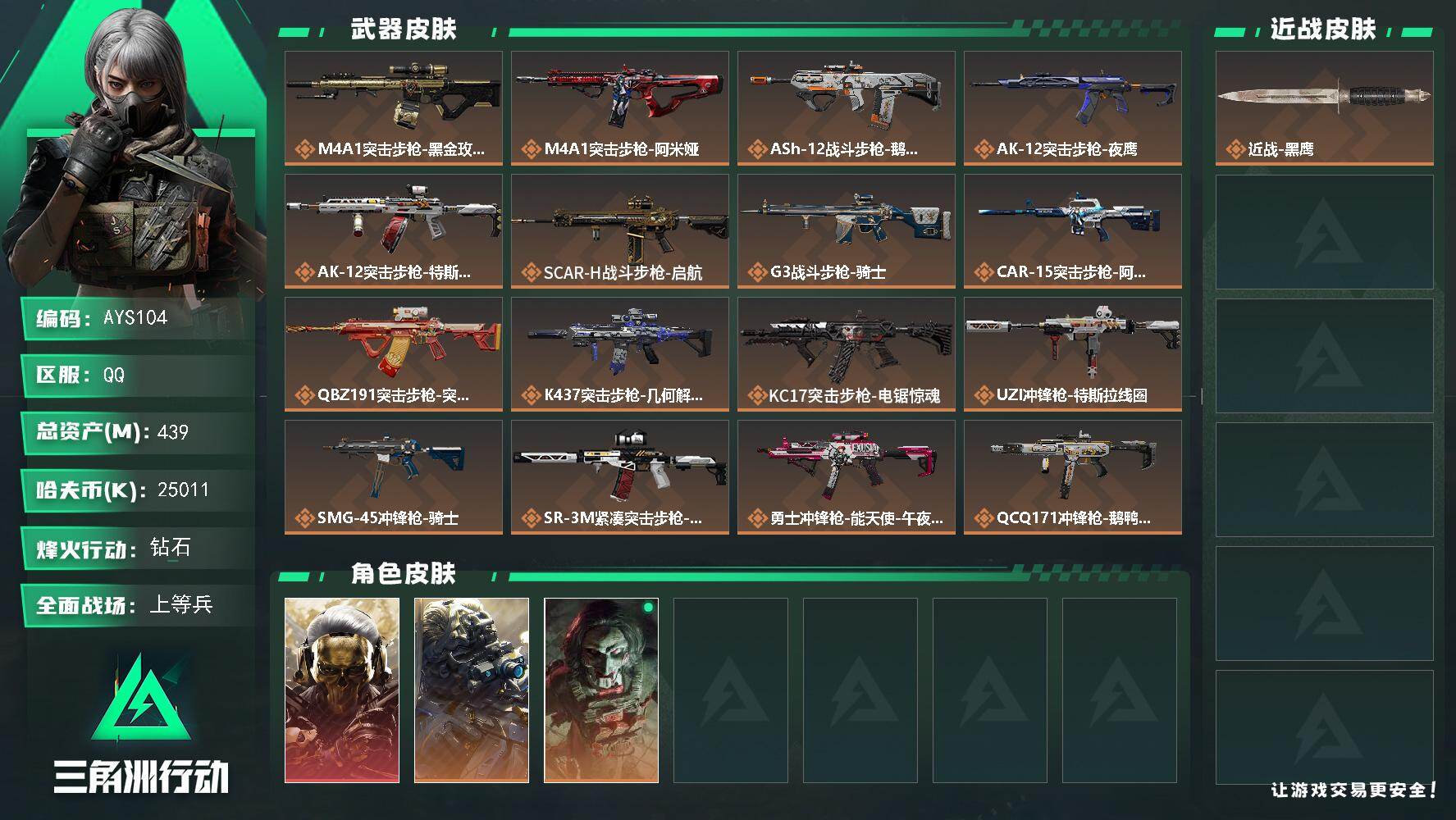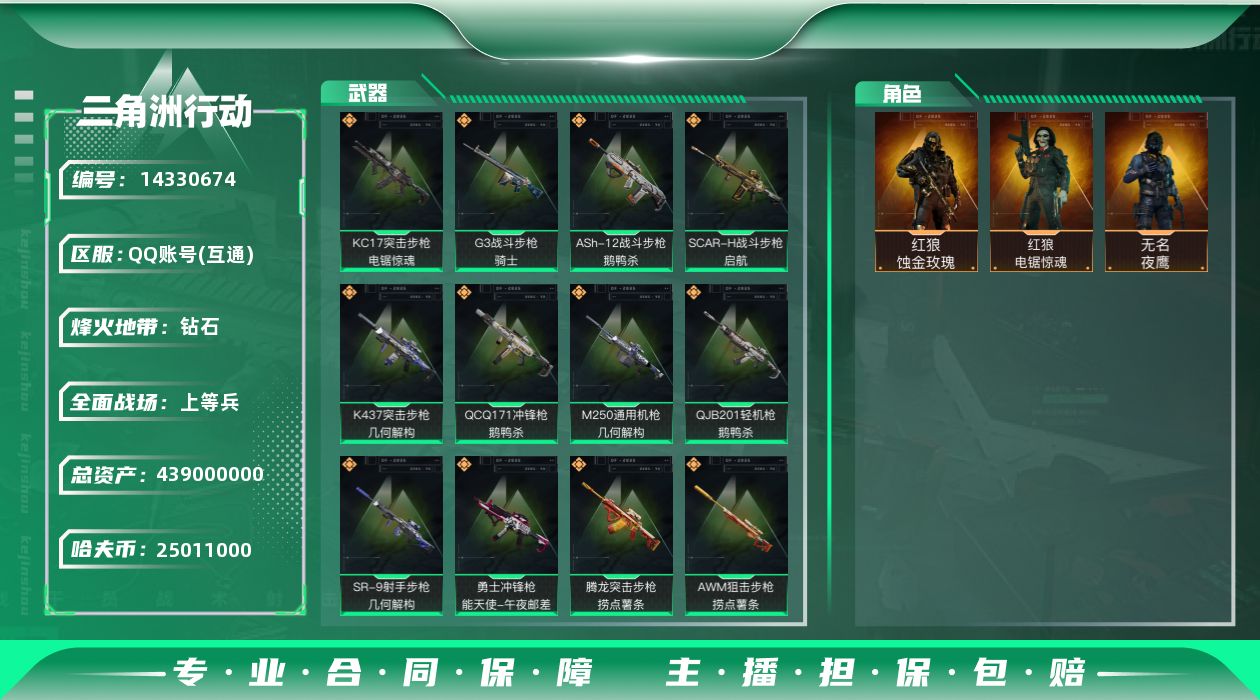 [14330674],【店主推荐捡漏号!可直接换绑】25011k哈伏币-356m流动资产-60烽火等级-钻石-28战场等级-上等兵 【干员外观】:红狼-蚀金玫瑰,无名-夜鹰,红狼-电锯惊魂 【近战皮肤】:近战-黑鹰 【传说外观】:M4A1突击步枪-蚀金玫瑰,M4A1突击步枪-阿米娅,ASh-12战斗步枪-鹅鸭杀,AK-12突击步枪-夜鹰,AK-12突击步枪-特斯拉线圈,SCAR-H战斗步枪-启航,G3战斗步枪-骑士,CAR-15突击步枪-阿米娅,腾龙突击步枪-捞点薯条,K437突击步枪-几何解构,KC17突击步枪-电锯惊魂,UZI冲锋枪-特斯拉线圈,SMG-45冲锋枪-骑士,SR-3M紧凑突击步枪-特斯拉线圈,勇士冲锋枪-能天使-午夜邮差,QCQ171冲锋枪-鹅鸭杀,M250通用机枪-几何解构,QJB201轻机枪-鹅鸭杀,SKS射手步枪-秘银工艺,SR-25射手步枪-水墨云图,SR-9射手步枪-几何解构,AWM狙击步枪-捞点薯条,93R-捞点薯条,复合弓-黑·天际线 【史诗外观】:AKM突击步枪-林中猎手,QBZ95-1突击步枪-曙光,ASh-12战斗步枪-守夜人,M16A4突击步枪-竞赛选手,AUG突击步枪-蝮蛇,M7战斗步枪-禁卫,SG552突击步枪-尖端治疗,SG552突击步枪-深海恐惧,SCAR-H战斗步枪-囚徒,G3战斗步枪-战场英杰,AS Val突击步枪-尖端治疗,腾龙突击步枪-猎鳄行动,MP5冲锋枪-深海恐惧,MP5冲锋枪-战术竞备,MP5冲锋枪-竞技风,Vector冲锋枪-阿萨拉文明,Vector冲锋枪-猎鳄行动,SR-3M紧凑突击步枪-英雄,SR-3M紧凑突击步枪-战术竞备,勇士冲锋枪-深海恐惧,勇士冲锋枪-工业狂潮,QCQ171冲锋枪-禁卫,M1014霰弹枪-林中猎手,S12K霰弹枪-曙光,M870霰弹枪-聚光灯,PKM通用机枪-蝮蛇,PKM通用机枪-守夜人,M250通用机枪-囚徒,SVD狙击步枪-阿萨拉工艺,SVD狙击步枪-暗夜猎手,M14射手步枪-禁卫,SR-25射手步枪-尖端治疗,SR-25射手步枪-聚光灯,SV-98狙击步枪-林中猎手,SV-98狙击步枪-囚徒,SV-98狙击步枪-猎鳄行动,M700狙击步枪-竞技风,M700狙击步枪-蝮蛇,M700狙击步枪-守夜人,QSZ92G-风林火山,沙漠之鹰-曙光 【稀有外观】:M14射手步枪-花岗岩,S12K霰弹枪