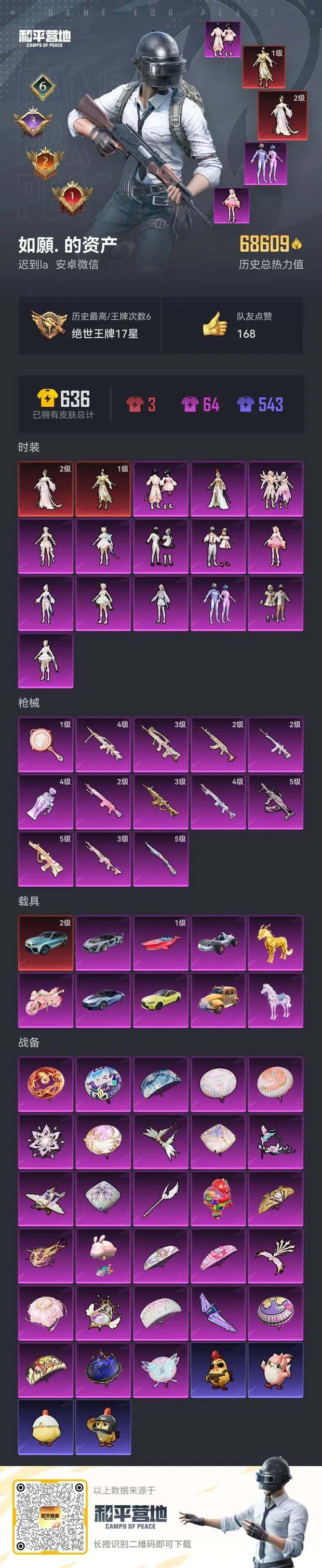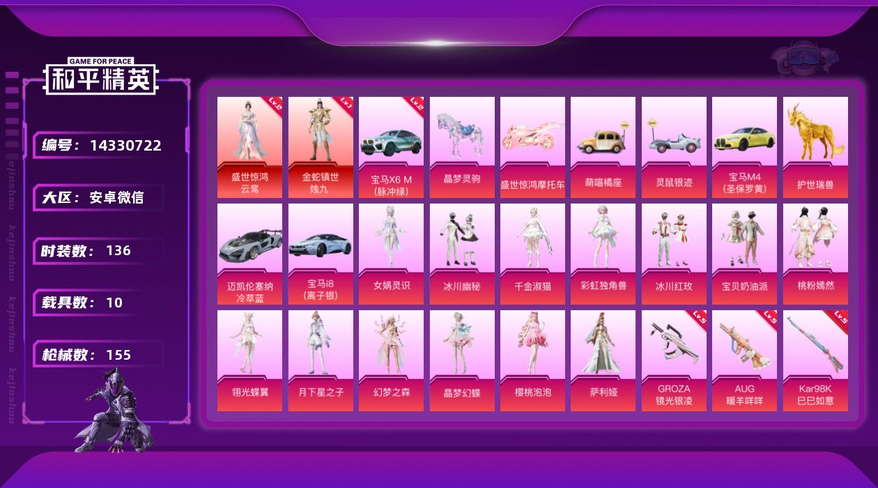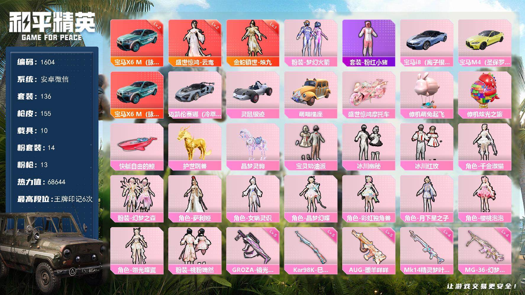 [14330722]安卓 微信-2神装-14粉装-13特效枪-10载具-9粉色飞行器-68644热力值-6王牌印记-136套装-155枪皮