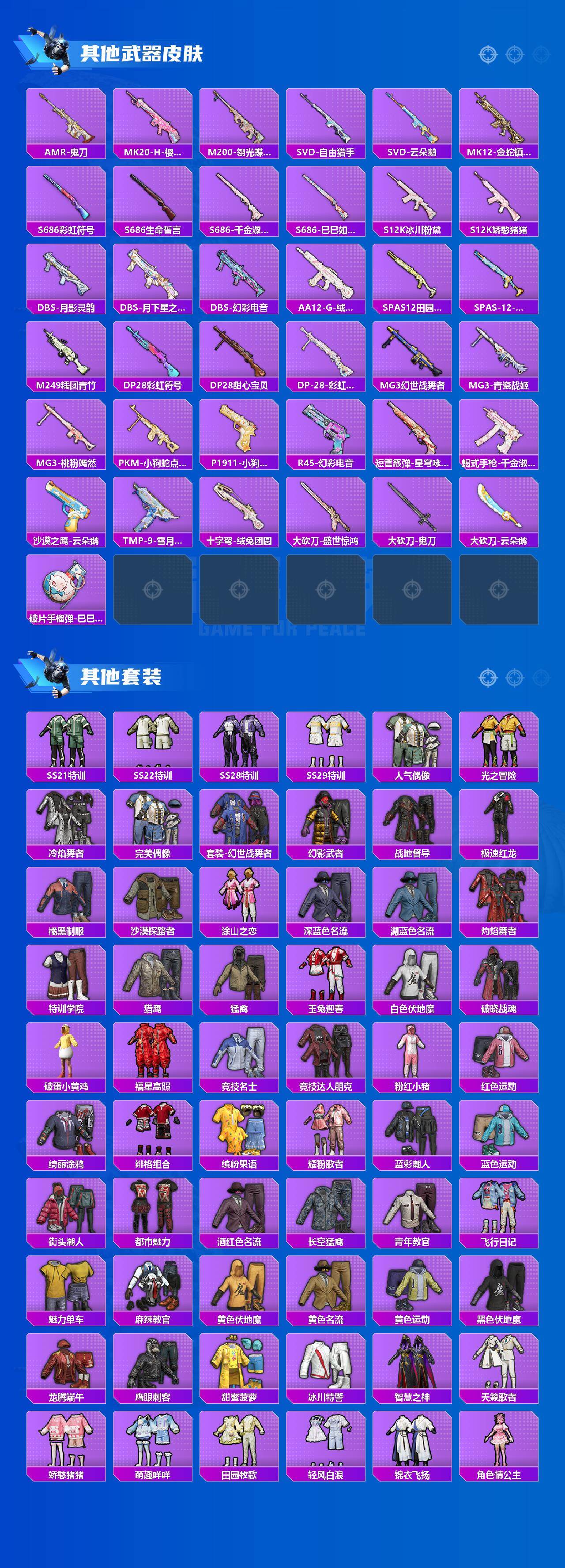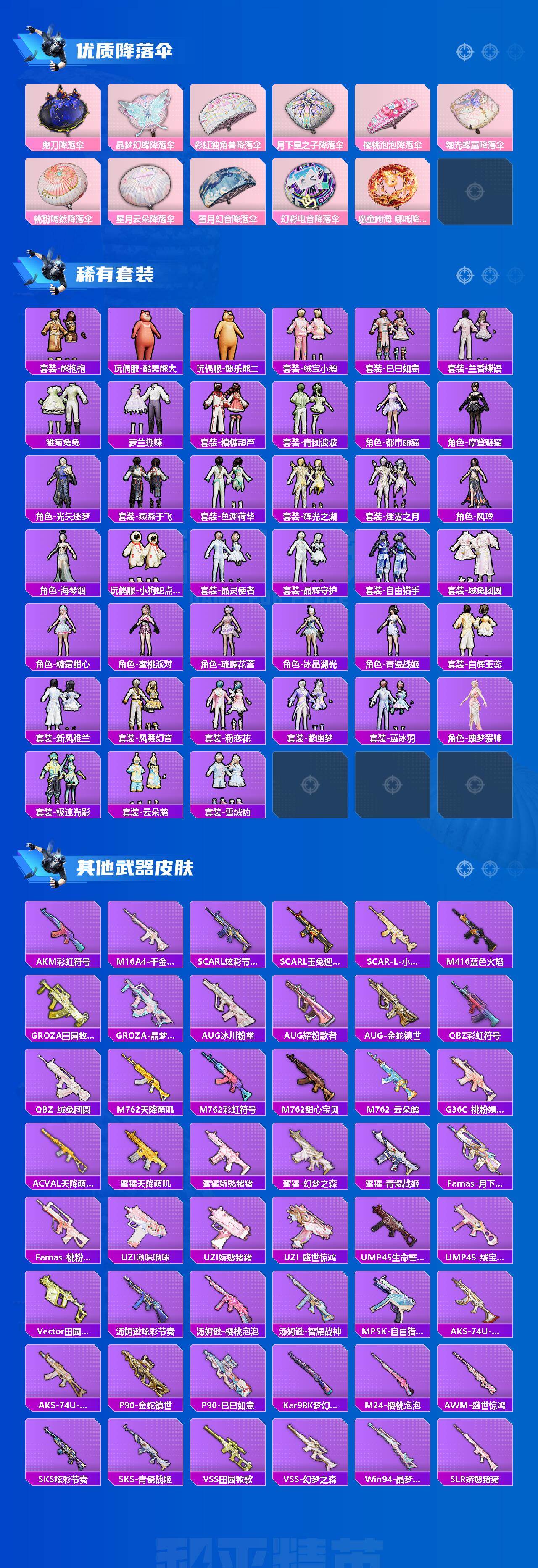 【粉色枪皮】:M16A4-晶梦幻蝶,SCAR-L-金蛇镇世,GROZA-镜光银凌,AUG-暖羊咩咩,M762-鬼刀,Famas-翎光蝶翼,Kar98K-巳巳如意,Mk14-精灵梦叶罗丽,Mk14-盛世惊鸿,Mk14-樱桃泡泡,MG-36-幻梦之森,平底锅-桃粉嫣然,烟雾弹-丁香清露