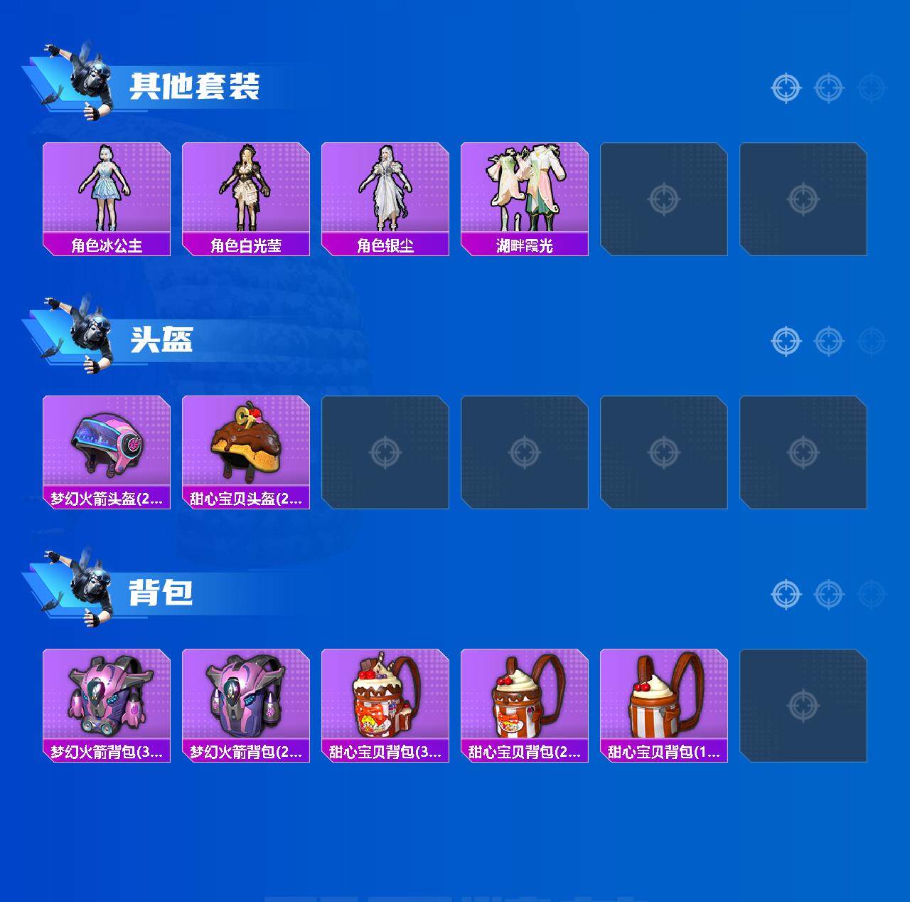 M16A4-晶梦幻蝶,SCAR-L-金蛇镇世,GROZA-镜光银凌,AUG-暖羊咩咩,M762-鬼刀,Kar98K-巳巳如意,Mk14-精灵梦叶罗丽,Mk14-盛世惊鸿,Mk14-樱桃泡泡,MG-36-幻梦之森,平底锅-桃粉嫣然,烟雾弹-丁香清露