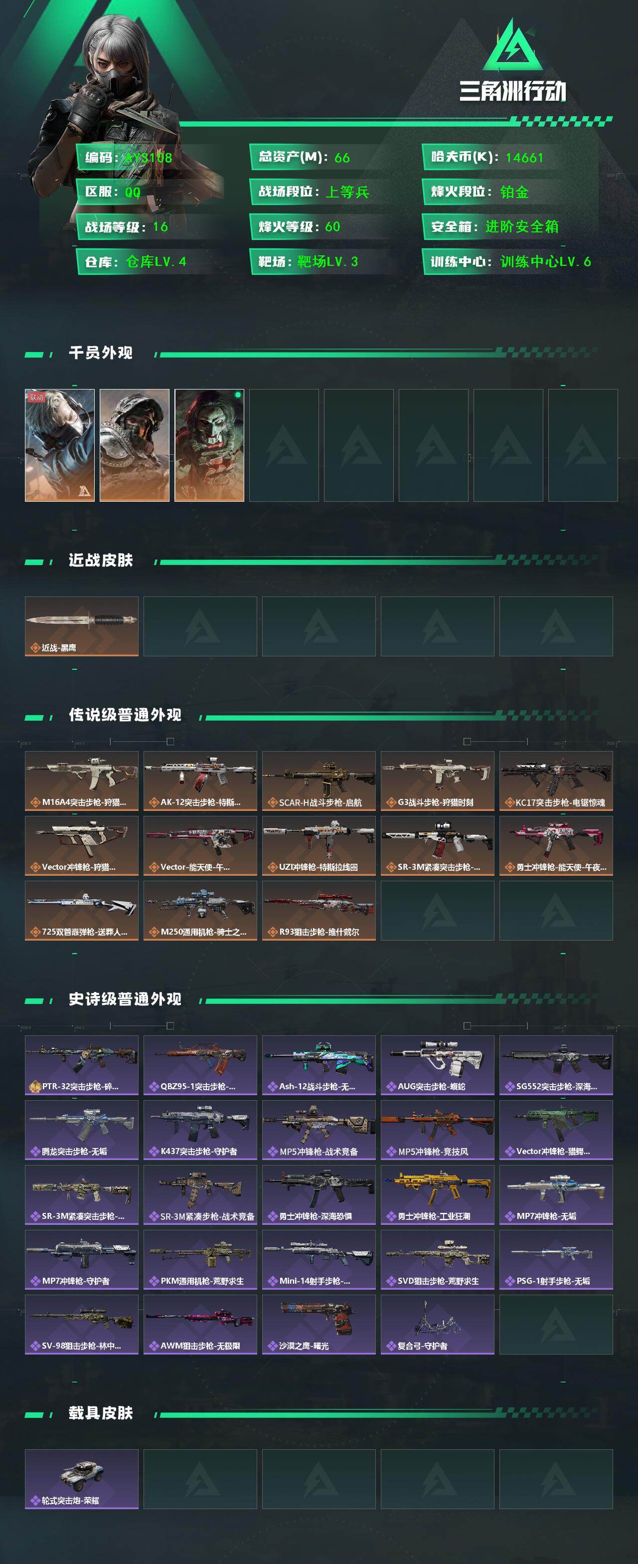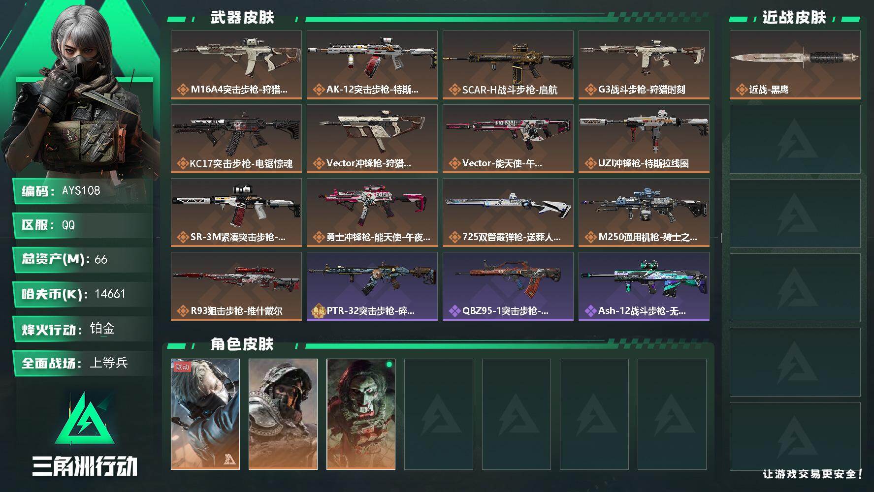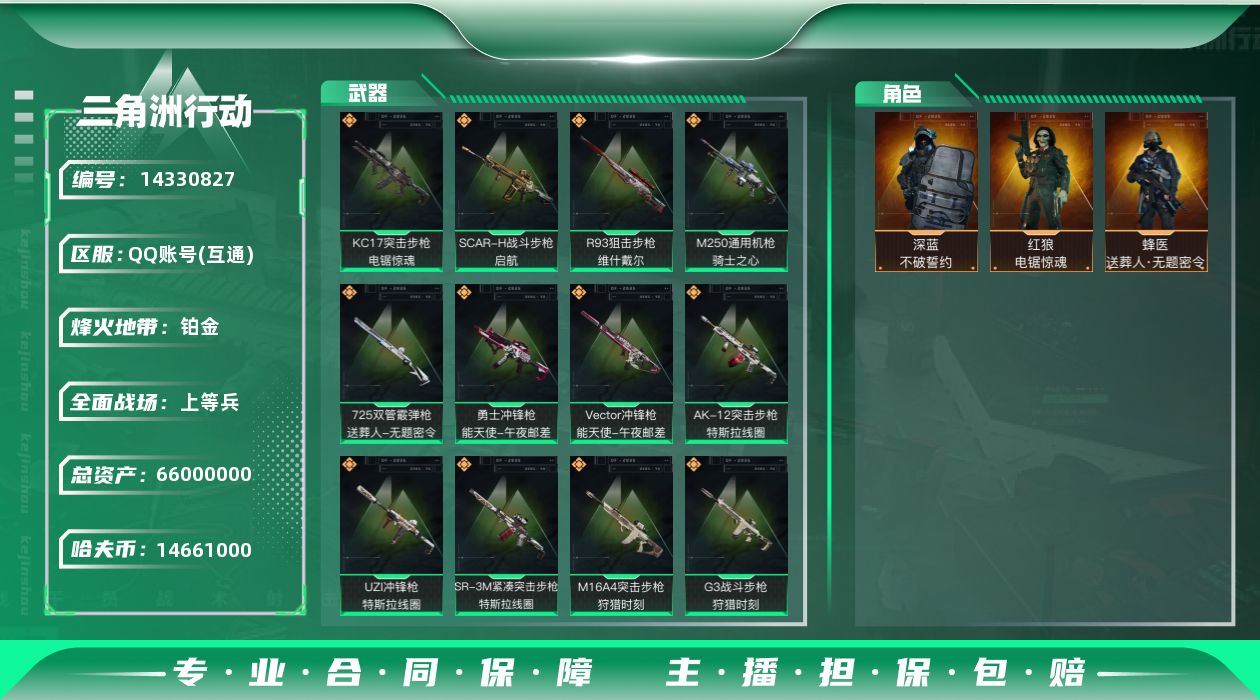 [14330827]【店主推荐捡漏号!可直接换绑】14661k哈伏币-58m流动资产-60烽火等级-铂金-16战场等级-上等兵 【干员外观】:蜂医-送葬人·无题密令,深蓝-不破誓约,红狼-电锯惊魂 【近战皮肤】:近战-黑鹰 【传说外观】:M16A4突击步枪-狩猎时刻,AK-12突击步枪-特斯拉线圈,SCAR-H战斗步枪-启航,G3战斗步枪-狩猎时刻,KC17突击步枪-电锯惊魂,Vector冲锋枪-狩猎时刻,Vector冲锋枪-能天使-午夜邮差,UZI冲锋枪-特斯拉线圈,SR-3M紧凑突击步枪-特斯拉线圈,勇士冲锋枪-能天使-午夜邮差,725双管霰弹枪-送葬人-无题密令,M250通用机枪-骑士之心,R93狙击步枪-维什戴尔 【史诗外观】:PTR-32突击步枪-碎冰行动,QBZ95-1突击步枪-曙光,ASh-12战斗步枪-无极限,AUG突击步枪-蝮蛇,SG552突击步枪-深海恐惧,腾龙突击步枪-无垢,K437突击步枪-守护者,MP5冲锋枪-战术竞备,MP5冲锋枪-竞技风,Vector冲锋枪-猎鳄行动,SR-3M紧凑突击步枪-荒野求生,SR-3M紧凑突击步枪-战术竞备,勇士冲锋枪-深海恐惧,勇士冲锋枪-工业狂潮,MP7冲锋枪-无垢,MP7冲锋枪-守护者,PKM通用机枪-荒野求生,Mini-14射手步枪-守护者,SVD狙击步枪-荒野求生,PSG-1射手步枪-无垢,SV-98狙击步枪-林中猎手,AWM狙击步枪-无极限,沙漠之鹰-曙光,复合弓-守护者 【稀有外观】:AKM突击步枪-战术演练,AKM突击步枪-肃杀,QBZ95-1突击步枪-公平竞技,K416突击步枪-虎啸,M7战斗步枪-精英联盟,M7战斗步枪-捣蛋鬼,SCAR-H战斗步枪-荣耀列队,SCAR-H战斗步枪-黄昏,G3战斗步枪-战术演练,G3战斗步枪-主宰,腾龙突击步枪-雪崩,腾龙突击步枪-冰天雪地,MP5冲锋枪-弄臣,MP5冲锋枪-虎啸,MP5冲锋枪-哈夫克卫队,P90冲锋枪-黄昏,P90冲锋枪-捣蛋鬼,Vector冲锋枪-先锋,UZI冲锋枪-亚特兰蒂斯,SMG-45-行动开启,SR-3M紧凑突击步枪-雪崩,勇士冲锋枪-冰天雪地,M1014霰弹枪-幻影结构,S12K霰弹枪-战术演练,M250通用机枪-虎啸,QJB201轻机枪-黄昏,QJB201轻机枪-哈夫克卫队,Mini-14射手步枪-荣耀列队,SKS射手步枪-弄臣,SKS射手步枪-