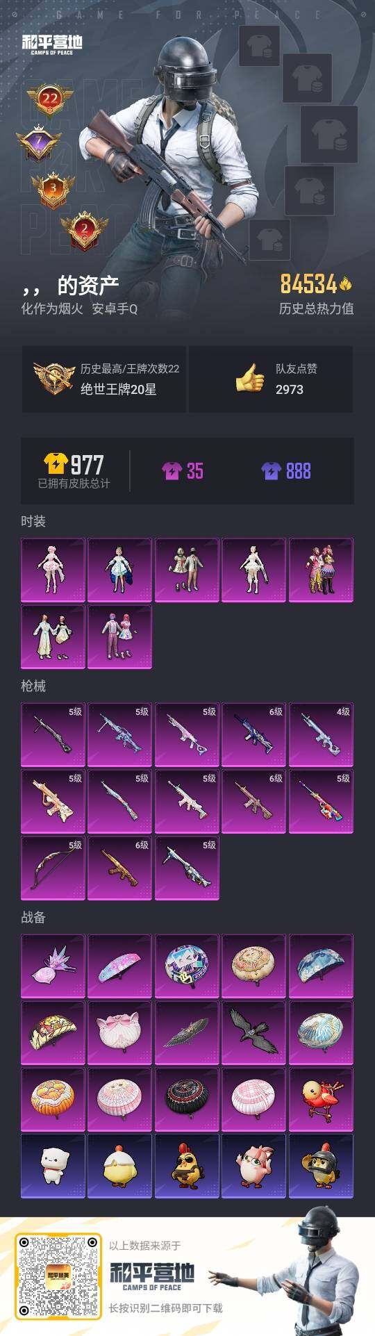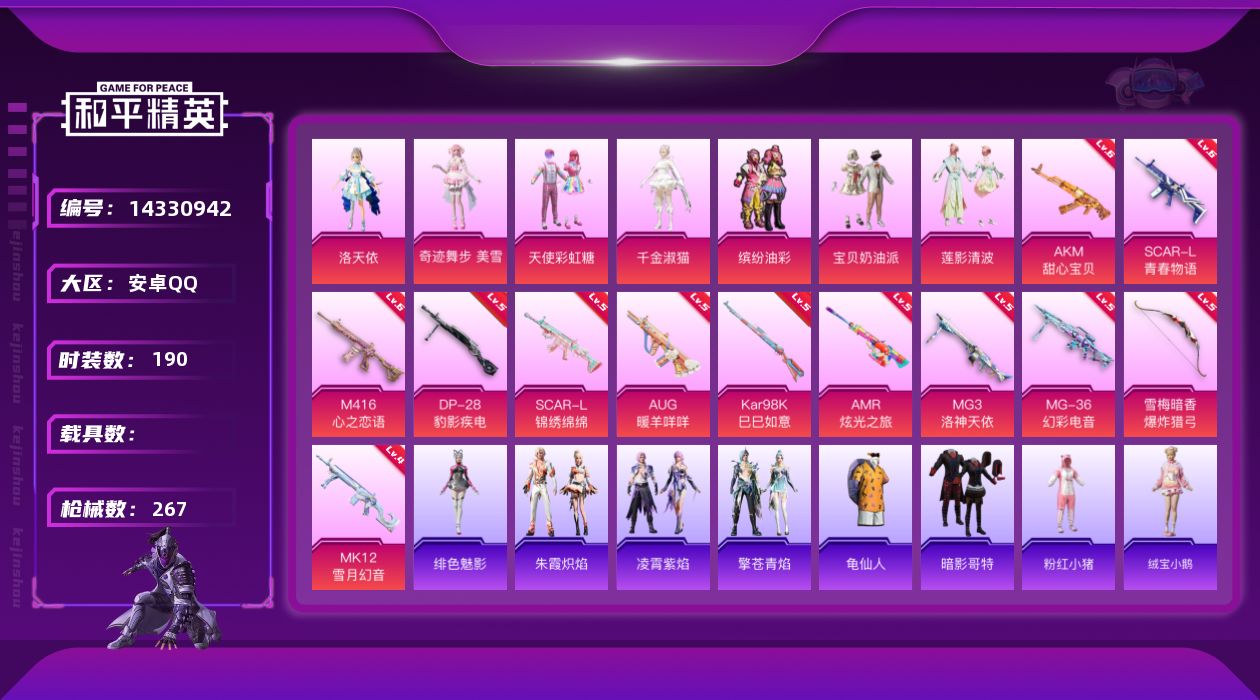 - PX_2095523- 安卓手Q-7王牌印记-8粉装-6特效枪-3载具-40290热力值-92套装-119枪皮-3卓越印记-1传奇印记 【8粉装】,梦幻火箭,甜心巧克力,宝贝奶油派,天使彩虹糖,放客神游,第五大道,怪诞乔克,蜜语绒猫 【6特效枪】AKM-炫紫旋律-5级 SCAR-L-纯梦嫁纱-4级 M416-心之恋语-5级 Kar98K-巳巳如意-5级 M417-第五大道-2级 Vector-环太