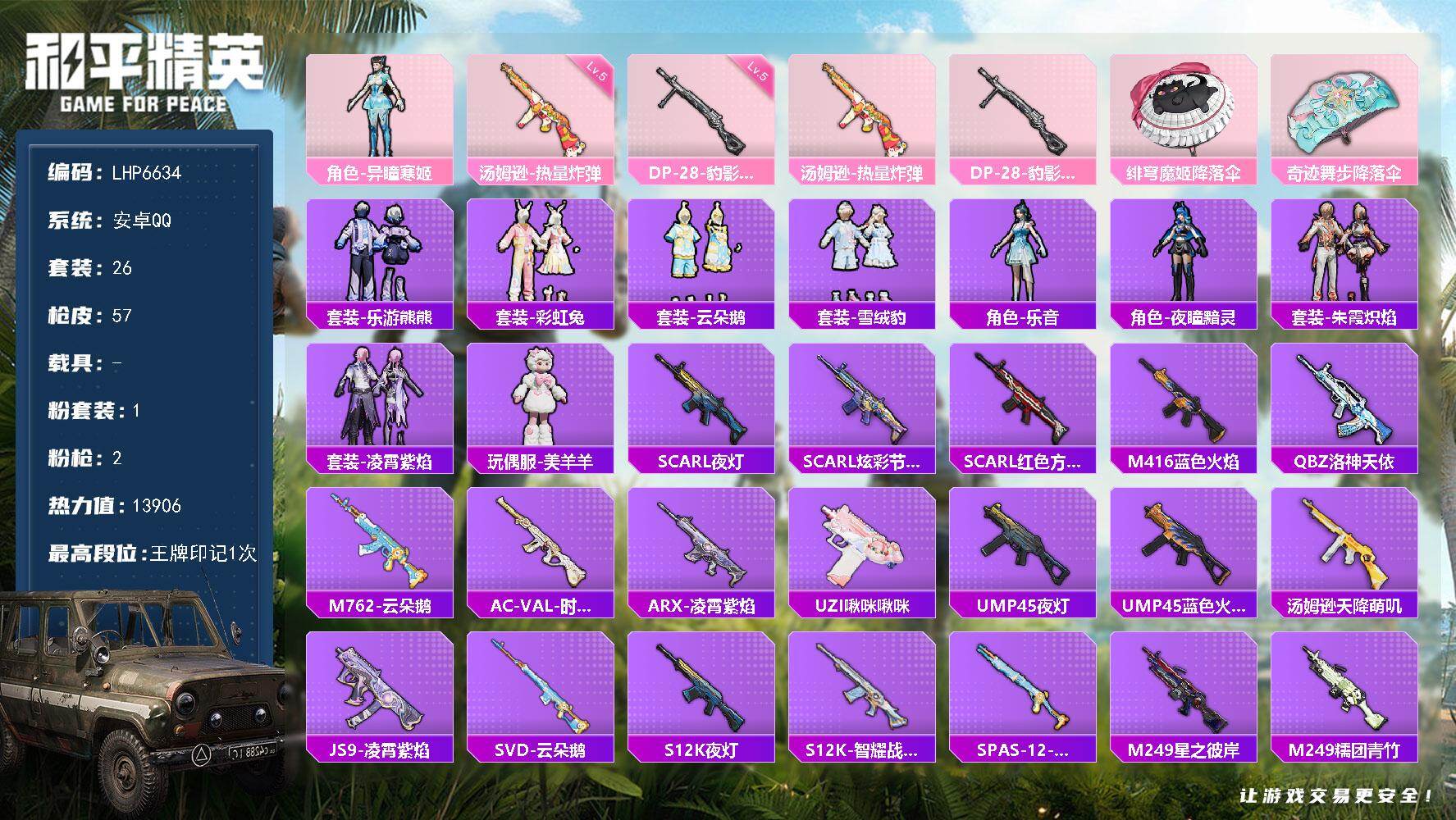 [14330961]可二次【店主推荐捡漏号!可直接换绑】 安卓 手Q-1粉装-2特效枪-1粉色飞行器-1.3w热力值-1王牌印记-26套装-57枪皮【粉色套装】:角色-异瞳寒姬【粉色枪皮等级】:汤姆逊-热量炸弹(五级),DP-28-豹影疾电(五级)