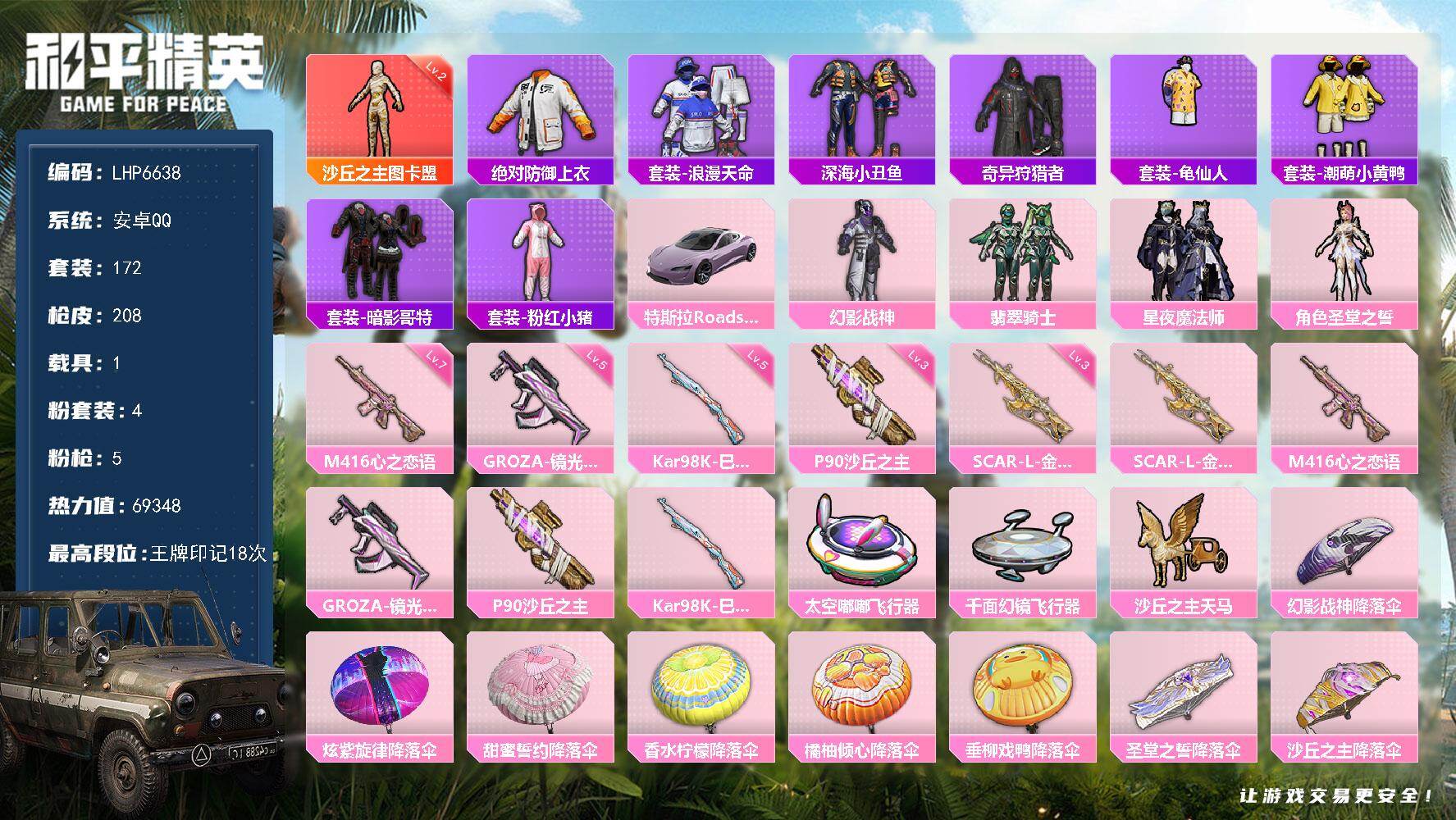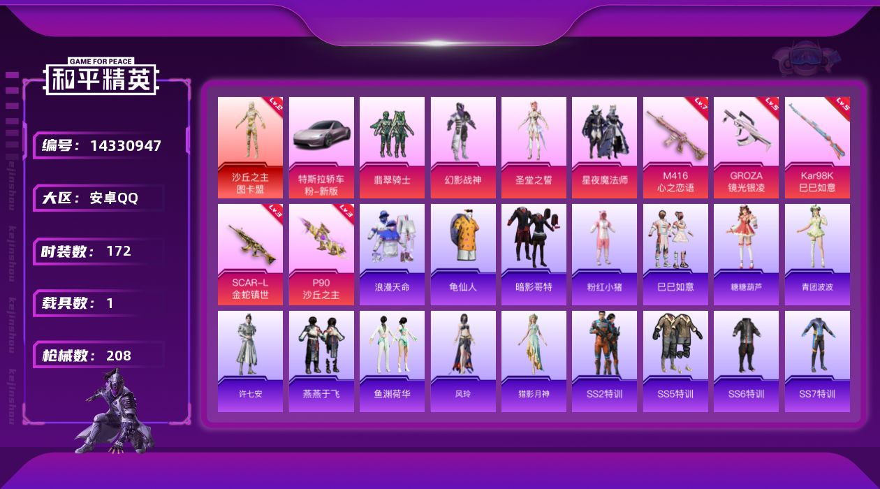 [14330947]【店主推荐捡漏号!可直接换绑】/素材身法号/地铁满天赋 安卓 手Q-1神装-4粉装-5特效枪-1载具-4粉色飞行器-6.9w热力值-18王牌印记-172套装-208枪皮【红色神装等级】:沙丘之主-图卡盟(二级)【热门品类】:绝对防御上衣,套装-浪漫天命,套装-深海小丑鱼,套装-奇异狩猎者,套装-龟仙人,套装-潮萌小黄鸭,套装-暗影哥特,套装-粉红小猪【粉色载具】:特斯拉Roadster(沁心粉)【粉色套装】:粉装-幻影战神,粉装-翡翠骑士,粉装-星夜魔法师,角色-圣堂之誓【粉色枪皮等级】:SCAR-L-金蛇镇世(三级),M416-心之恋语(七级),GROZA-镜光银凌(五级),P90-沙丘之主(三级),Kar98K-巳巳如意(五级)【粉色飞行器】:太空嘟嘟飞行器,千面幻镜飞行器,沙丘之主天马