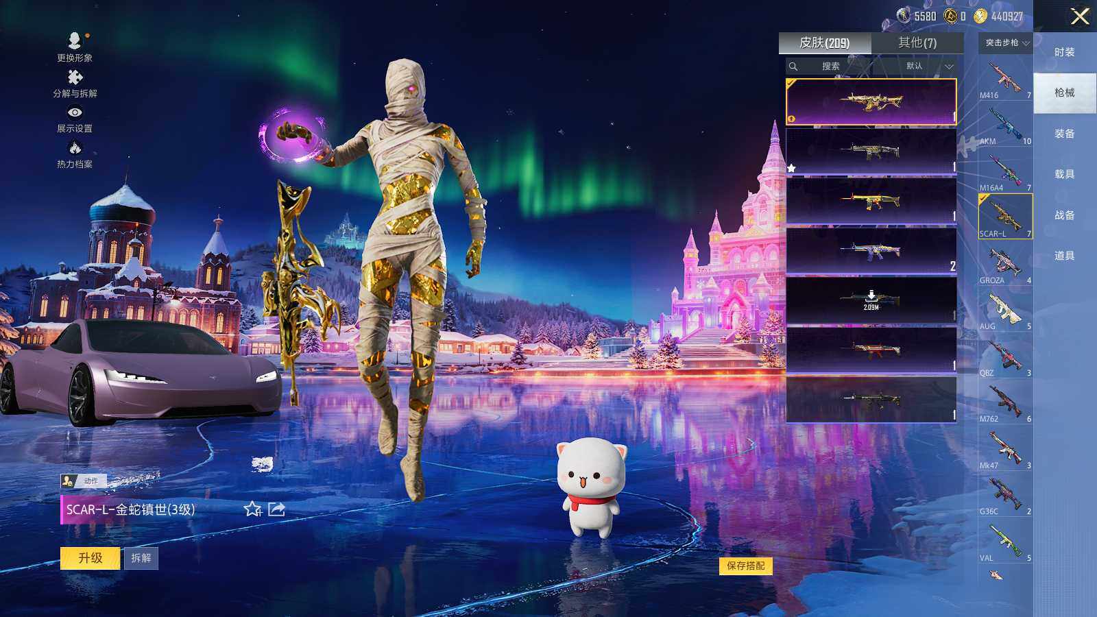 SCAR-L-金蛇镇世,M416-心之恋语,GROZA-镜光银凌,P90-沙丘之主,Kar98K-巳巳如意