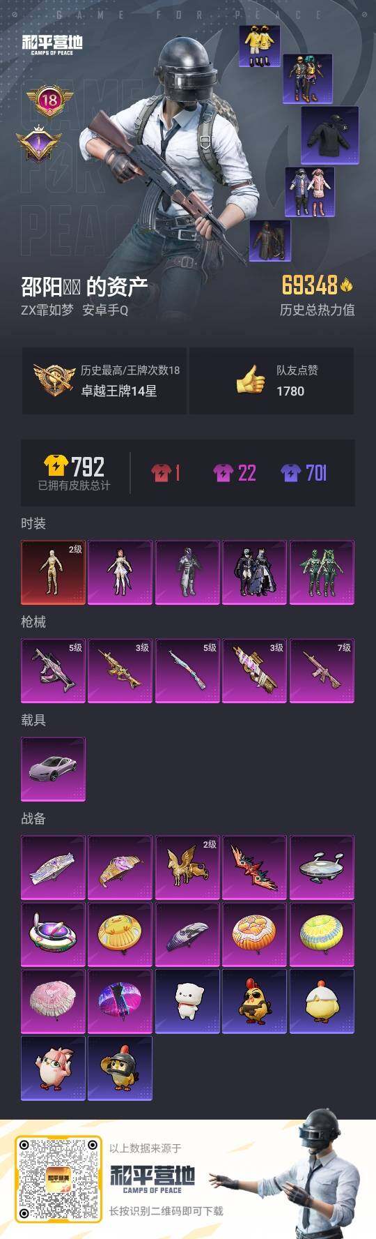 - [14551789]【店主推荐捡漏号!可直接换绑】 安卓 手Q-2粉装-7特效枪-4粉色飞行器-3.8w热力值-6王牌印记-72套装-125枪皮【热门品类】:套装-粉红小猪【粉色套装】:角色-千金淑猫,角色-异瞳寒姬【粉色枪皮等级】:M416-电玩时刻(五级),GROZA-镜光银凌(五级),M762-青锋波束(五级),UMP45-量子极限(五级),AKS-74U-星穹咏叹调(七级),Kar98K-巳巳如意(五级),DP-28-豹影疾电(五级)【粉色飞行器】:冠军兔兔飞行器,时光之吻飞行器,时光之誓飞行器