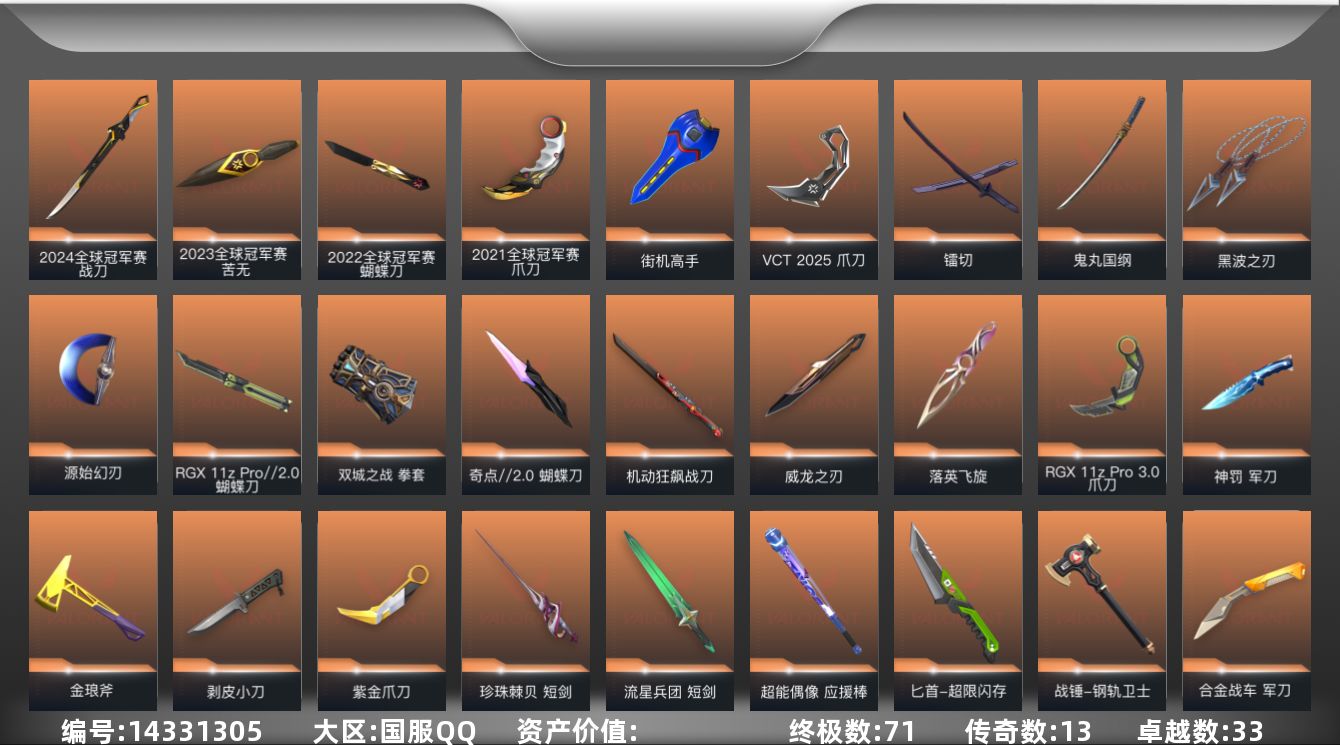 [14331305]【套装】:离火刃套装,2025全球冠军赛套装,2024全球冠军赛套装,2023全球冠军赛套装,2022全球冠军赛套装,2021全球冠军赛套装,源能者娱乐系统套装,ORA x 颗秒套装,VCT 2025 赛季套装,塑水宗套装,离火刃套装,《英雄联盟:双城之战》套装,《双城之战》收藏套装,VCTxEDG 队伍套装,紫阙金琅//2.0套装,耀鳞威龙套装,紫阙金琅套装,无畏启程套装 【英雄】:幻棱,炼狱,维斯,暮蝶,钛狐,壹决,铁臂,捷风,雷兹,幽影,不死鸟,贤者,猎枭,蝰蛇,零,芮娜,奇乐,尚勃勒,霓虹,斯凯,夜露,星礈,K/O,海神,盖可,黑梦,钢锁 【近战 武器】:近战武器-2025全球冠军赛 蝴蝶刀,近战武器-2024全球冠军赛 战刀,近战武器-2023全球冠军赛 苦无,近战武器-2022全球冠军赛 蝴蝶刀,近战武器-2021全球冠军赛 爪刀,近战武器-ORA x 颗秒 军刀,近战武器-RGX 11z Pro//2.0 蝴蝶刀,近战武器-剥皮小刀,近战武器-奇点//2.0 蝴蝶刀,近战武器-VCT 2025 爪刀,近战武器-紫金爪刀,近战武器-RGX 11z Pro//3.0 爪刀,近战武器-离火刃,近战武器-黑波之刃,近战武器-落英飞旋,近战武器-镭切,近战武器-威龙之刃,近战武器-鬼丸国纲,近战武器-双城之战 拳套,近战武器-源始幻刃,近战武器-珍珠棘贝 短剑,近战武器-流星兵团 短剑,近战武器-超能偶像 应援棒,近战武器-超限闪存 匕首,近战武器-钢轨卫士 战锤,近战武器-合金战车 军刀,近战武器-弧光异彩 军刀,近战武器-荒土机兵 热能刀,近战武器-机动狂飙 战刀,近战武器-街机高手,近战武器-金琅斧,近战武器-沙尘幻旅 匕首,近战武器-神罚 军刀,近战武器-诡秘蛇影 军刀,近战武器-神圣领域 战刀,近战武器-日耀风暴 遗器 【狂徒】:狂徒-艾沃莉的梦之翼,狂徒-超时空卫队,狂徒-2025全球冠军赛,狂徒-2023全球冠军赛,狂徒-2021全球冠军赛,狂徒-洪荒怒焰,狂徒-混沌序曲,狂徒-全息波普//2.0,狂徒-双城之战,狂徒-塑水宗,狂徒-创·纪元,狂徒-虚空遗器,狂徒-RGX 11z Pro,狂徒-多弥尔的复仇,狂徒-ORA x 颗秒,狂徒-堕天遗武,狂徒-掠影,狂徒-盖亚的复仇,狂徒-海洋之星,狂徒-耀鳞威龙,狂徒-紫阙金琅,狂徒-离子武器//2.
