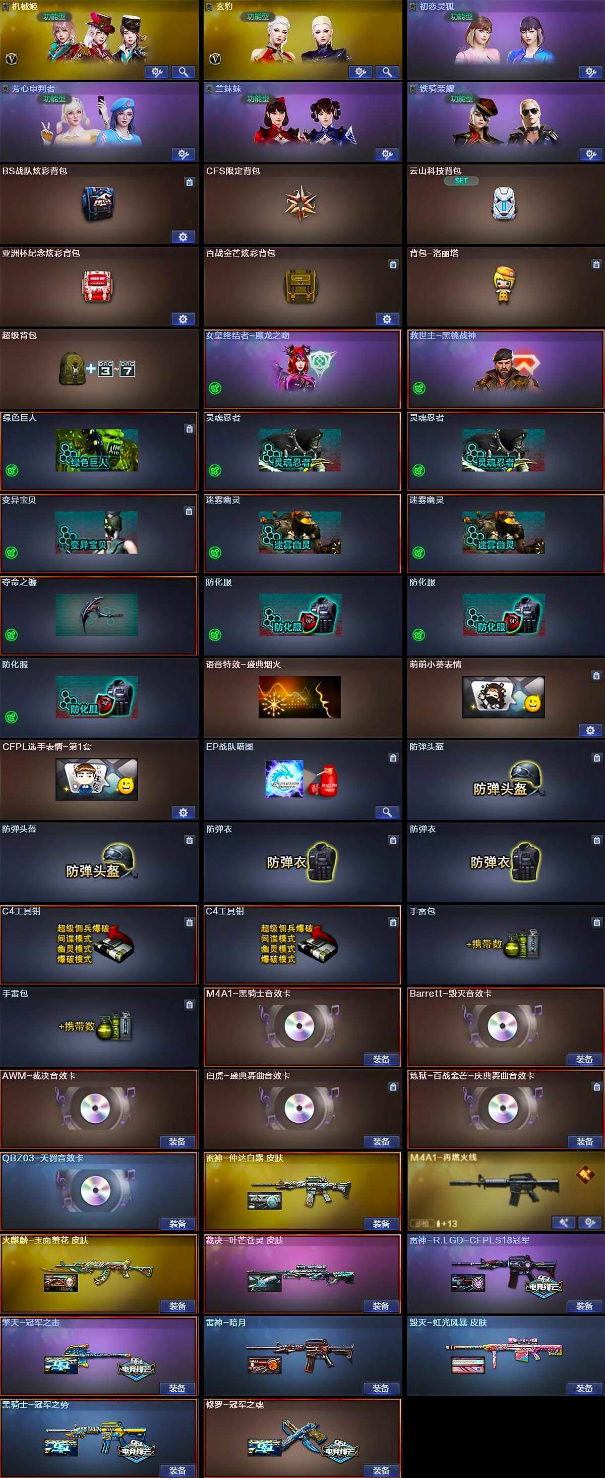【道具】:BS战队炫彩背包,CFS限定背包,云山科技背包,亚洲杯纪念炫彩背包,百战金芒炫彩背包,背包-洛丽塔,超级背包,女皇终结者-魔龙之吻,救世主-黑桃战神,绿色巨人,灵魂忍者*2,变异宝贝,迷雾幽灵*2,夺命之镰,防化服*3,语音特效-盛典烟火,萌萌小葵表情,CFPL选手表情-第1套,EP战队喷图,防弹头盔*2,防弹衣*2,C4工具钳*2,手雷包*2