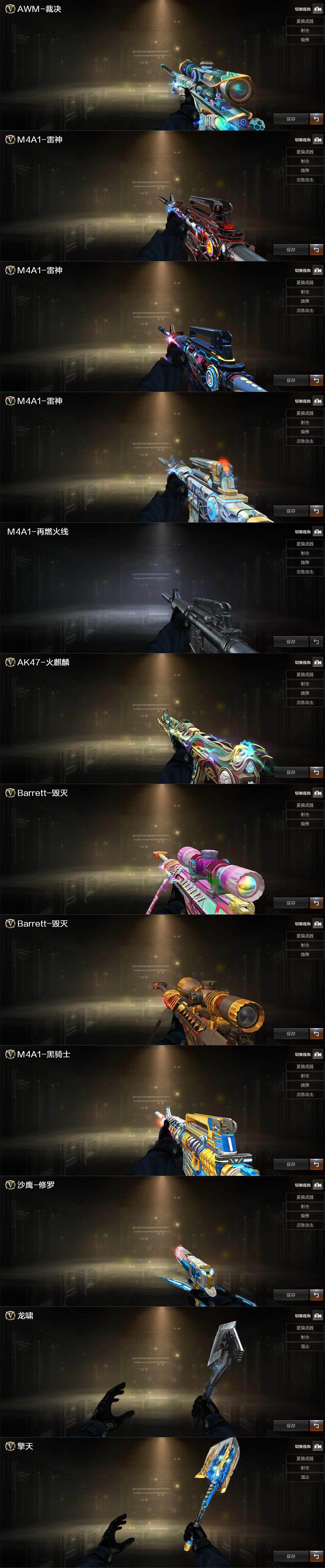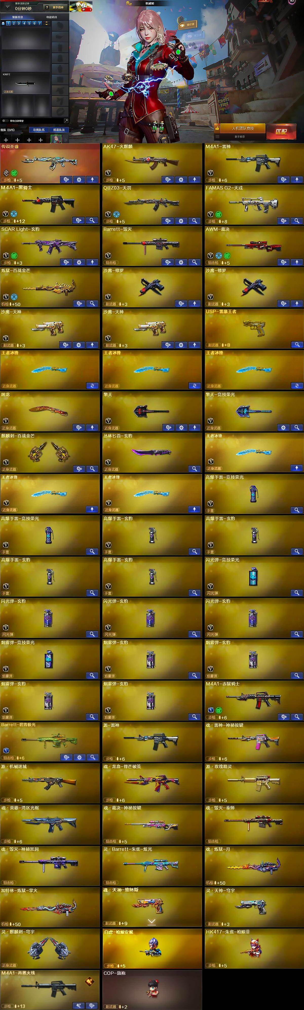 【英雄级武器】:AK47-火麒麟,M4A1-雷神,M4A1-黑骑士,QBZ03-天罚,FAMAS G2-天戎,SCAR Light-玄豹,Barrett-毁灭,AWM-裁决,炼狱-百战金芒,沙鹰-修罗*2,沙鹰-天神*2,屠龙,擎天,擎天-竞技荣光,麒麟刺-百战金芒,丛林匕首-玄豹,王者冰锋-觉醒版*3,高爆手雷-竞技荣光*2,高爆手雷-玄豹*4,闪光弹-竞技荣光,闪光弹-玄豹*3,烟雾弹-竞技荣光,烟雾弹-玄豹*4,M4A1-赤狱骑士,Barrett-碧霄极光