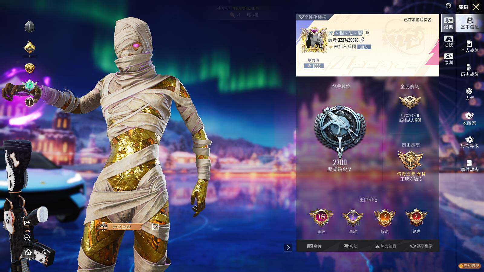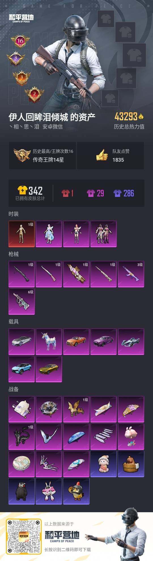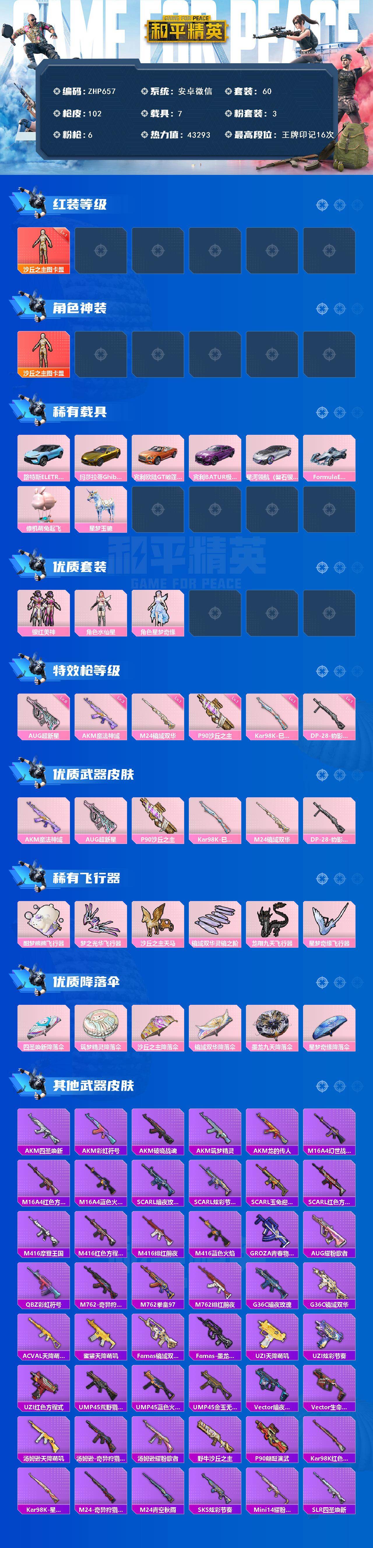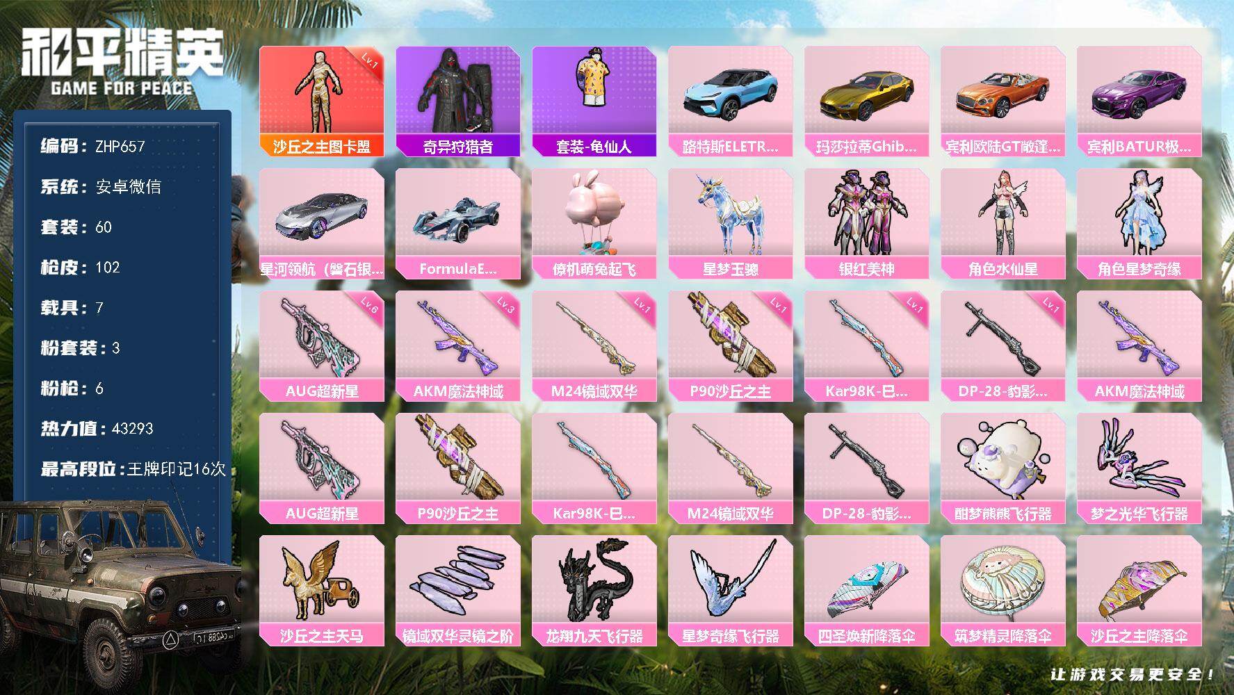 [14332736]安卓 微信-1神装-3粉装-6特效枪-7载具-6粉色飞行器-43293热力值-16王牌印记-60套装-102枪皮
