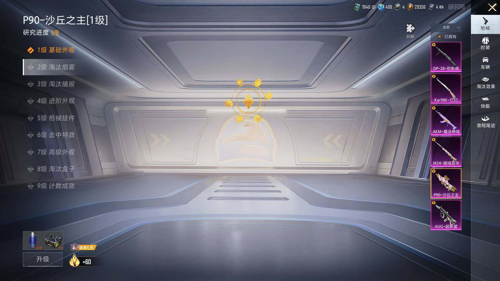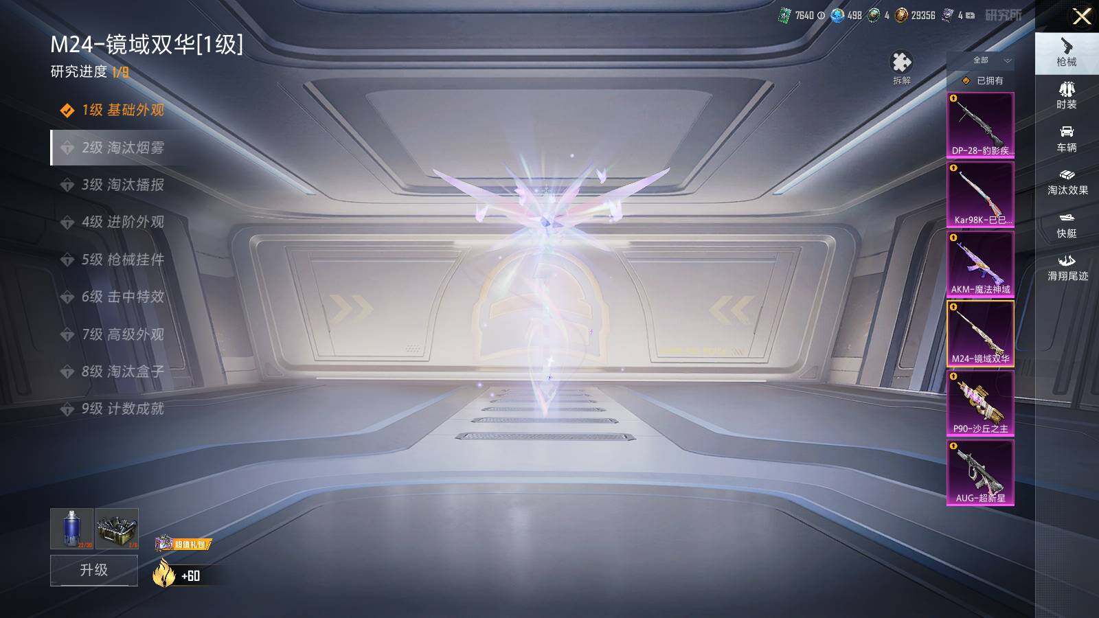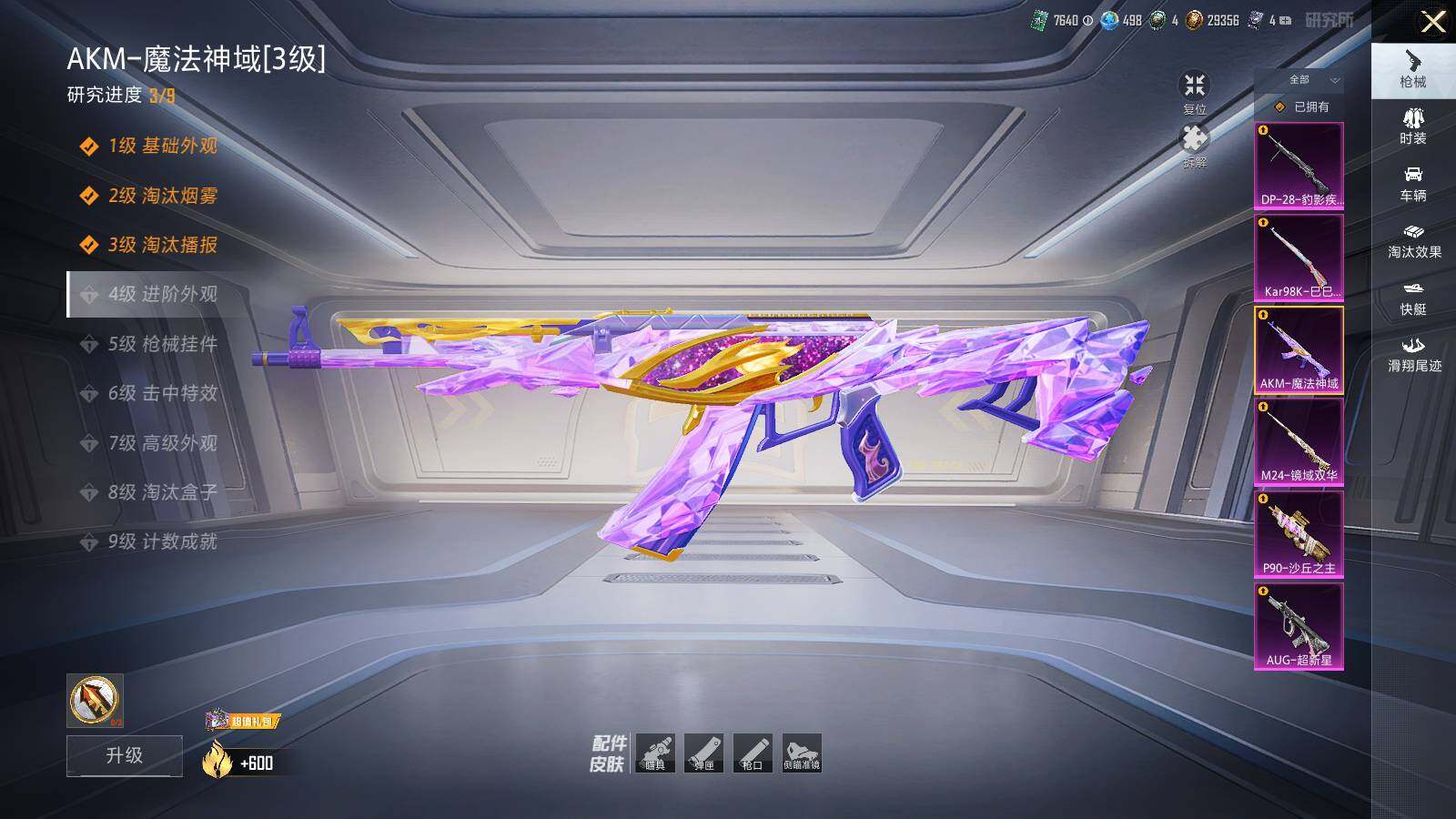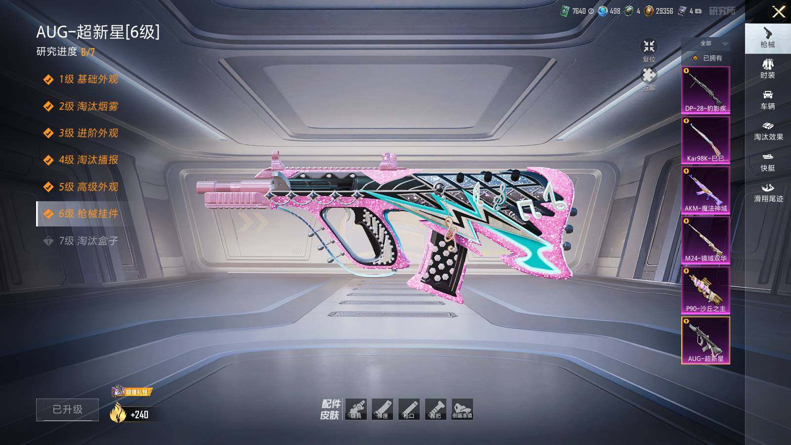 【粉色枪皮等级】:AKM-魔法神域(三级),AUG-超新星(六级),P90-沙丘之主(一级),Kar98K-巳巳如意(一级),M24-镜域双华(一级),DP-28-豹影疾电(一级)