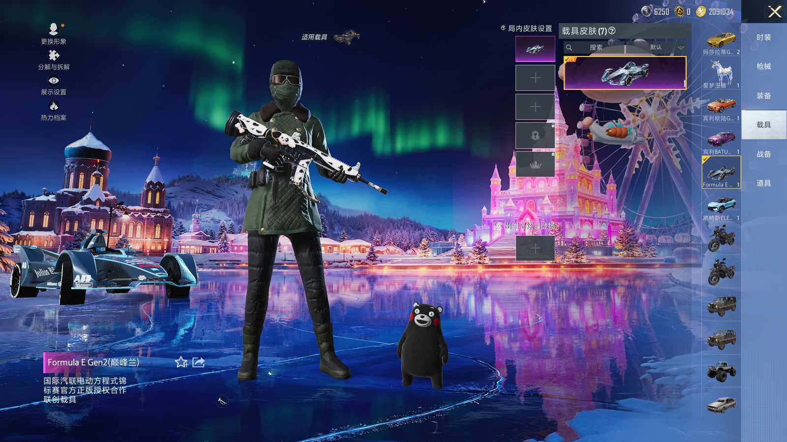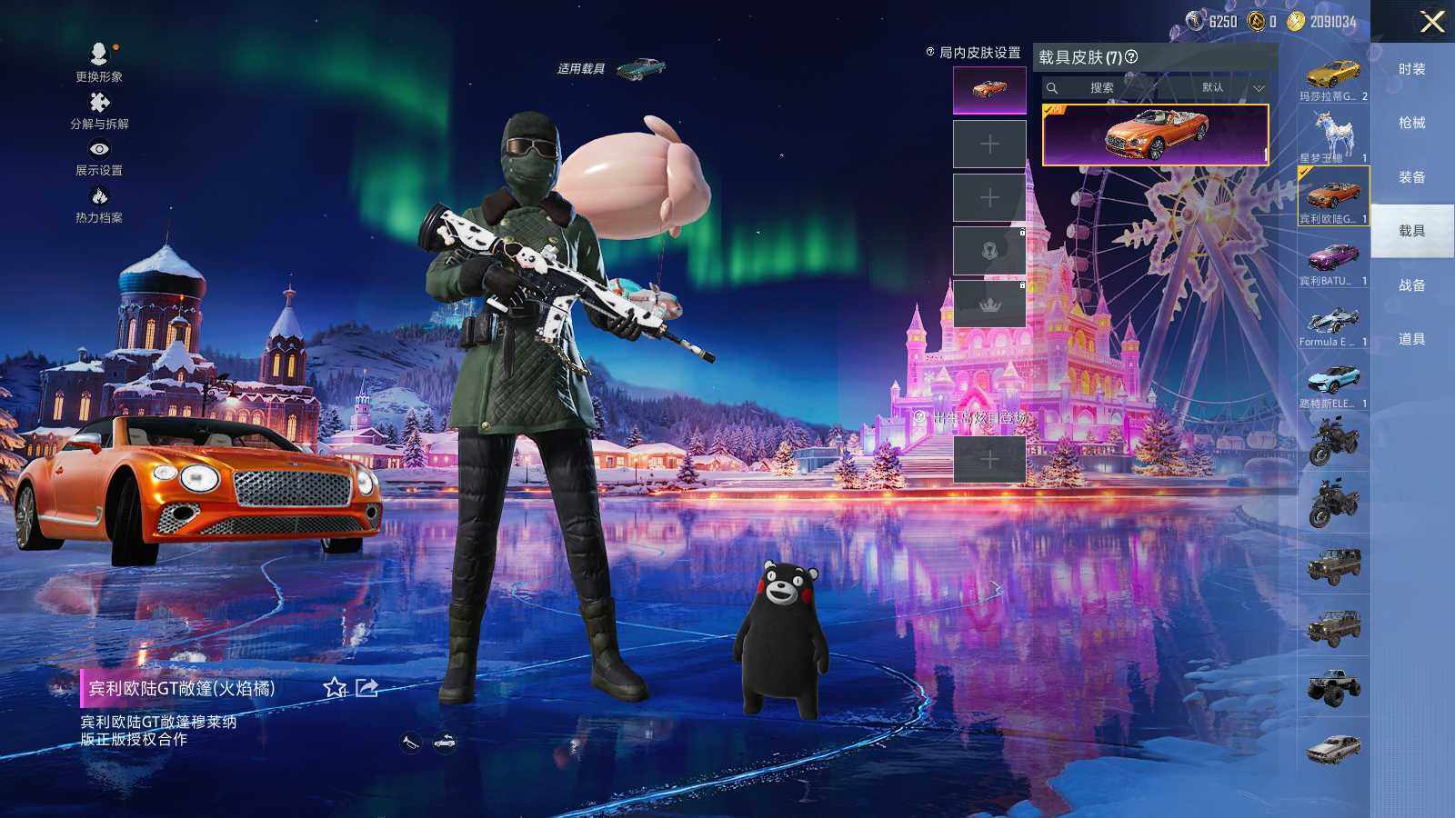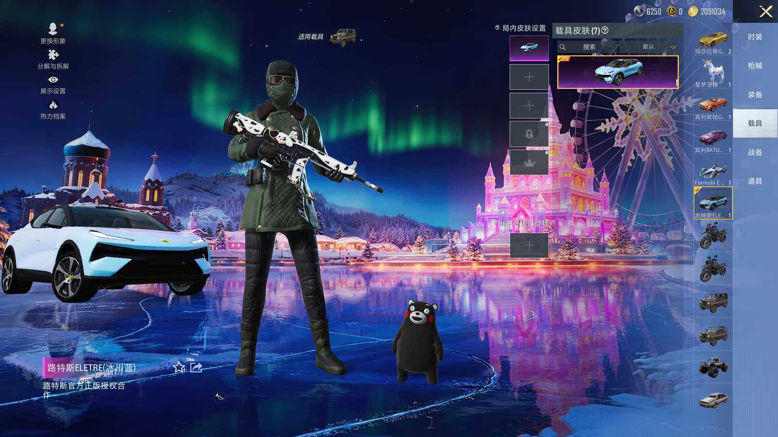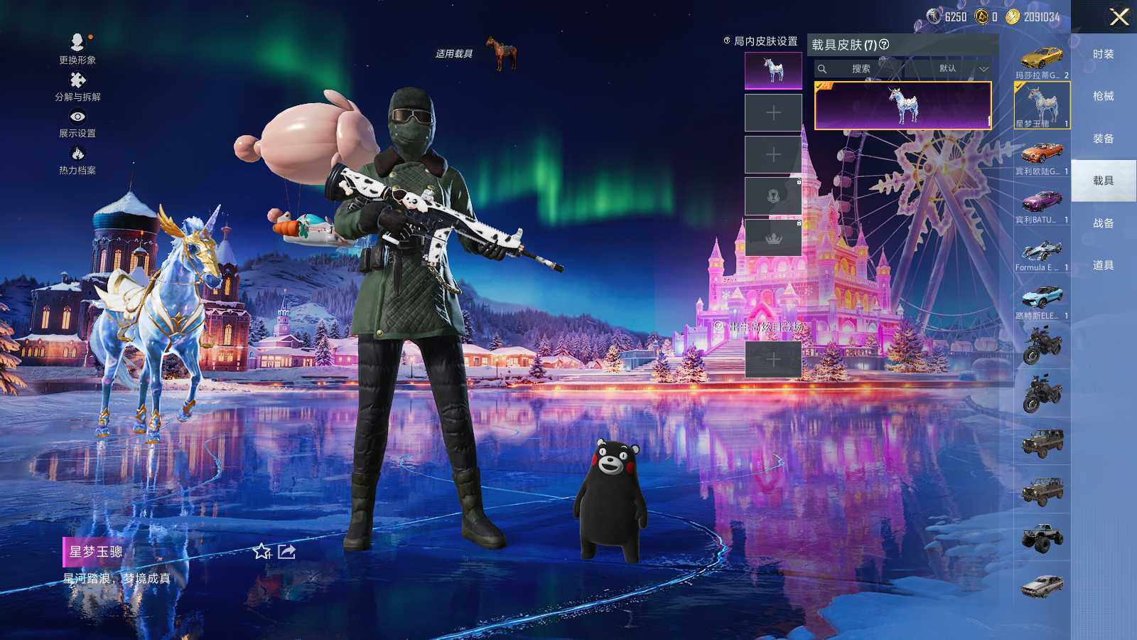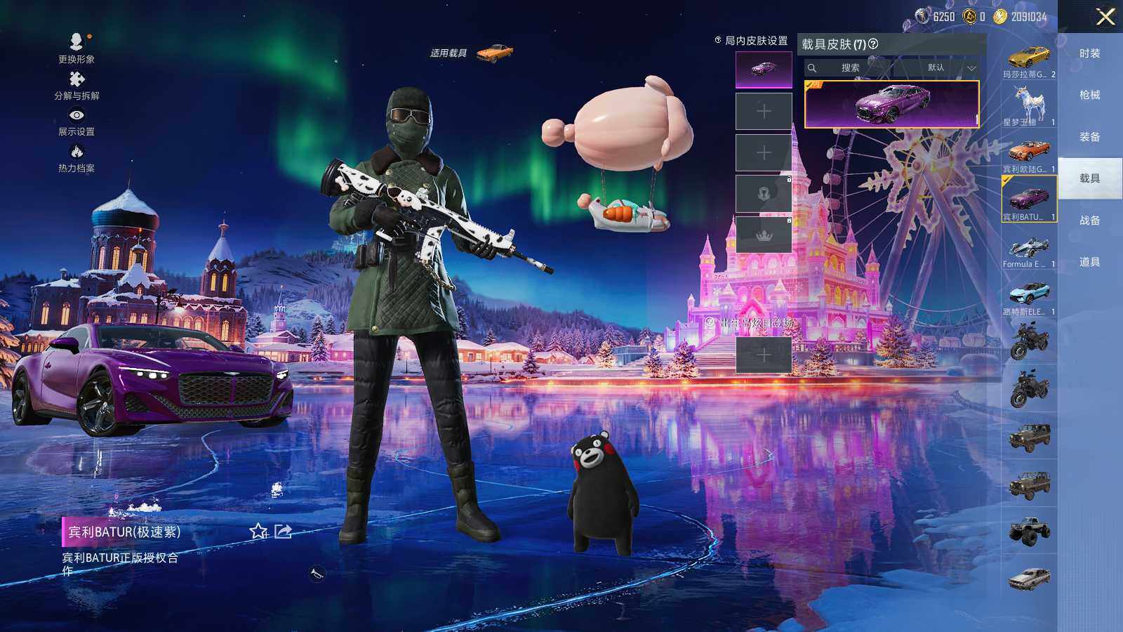 【粉色载具】:路特斯ELETRE(冰川蓝),玛莎拉蒂Ghibli(金),宾利欧陆GT敞篷(火焰橘),宾利BATUR(极速紫),星河领航(磐石银),Formula E Gen2(巅峰兰),僚机-萌兔起飞,星梦玉骢
