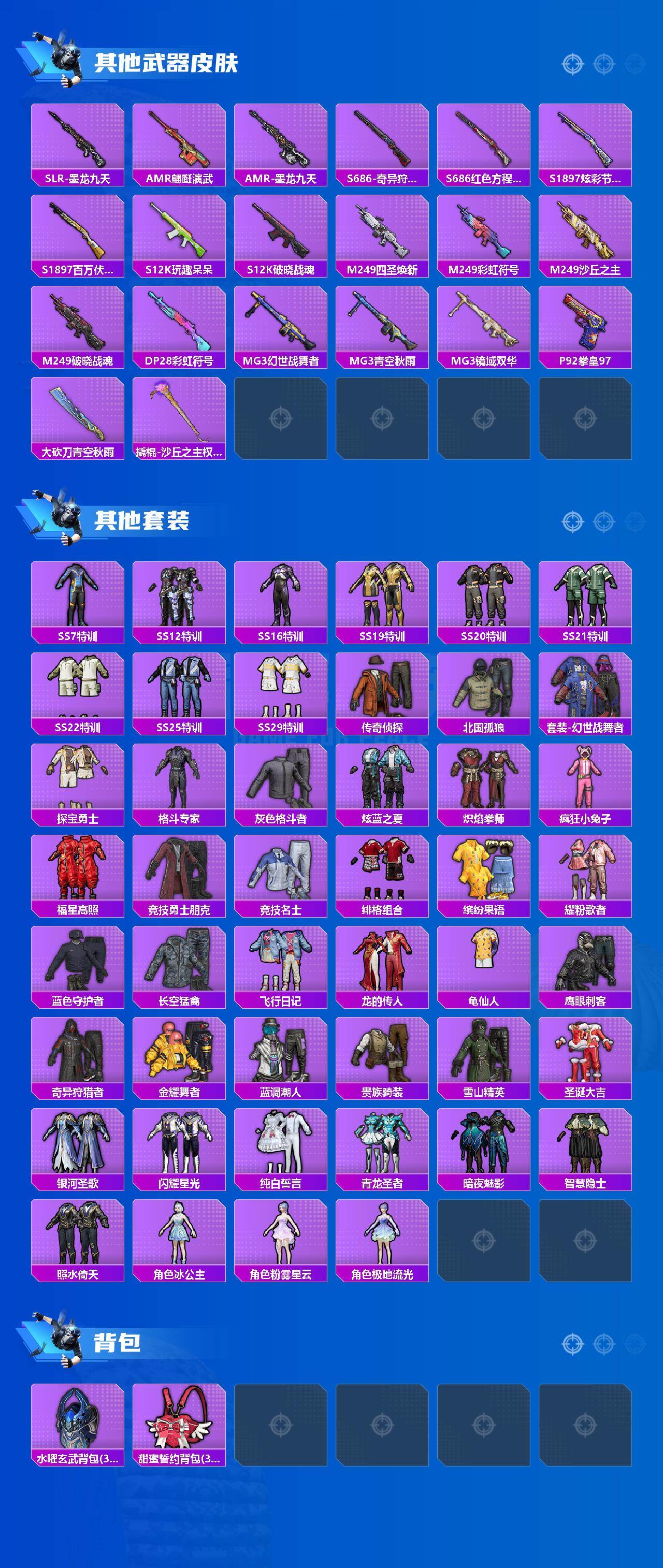 - [12293427]7粉装 6特效枪 1载具 6印记 可二次 身法装备:暗影哥特(红眼罩) 优质装备:玛莎拉蒂Ghibli(蓝),M416五爪金龙,极致幻想,新星烈龙(小白龙),潮汐统领,M762甜心娃娃,GROZA焦糖拿铁,SCAR-L青春物语,AWM橘柚倾心,AKM绿萝繁花 热门装扮:精灵娃娃,酣梦娃娃,复仇流浪者,宙之时溯,软萌银虎,大橘为重,仓鼠灰灰 五级特效枪:五级M416-五爪金龙,五级GROZA-焦糖拿铁 四级特效枪:四级AKM-绿萝繁花,四级M762-甜心娃娃 三级特效枪:三级SCAR-L-青春物语 二级特效枪:二级AWM-橘柚倾心 紫色装扮:SS22特训,SS21特训,SS31特训套装,SS5特训,冰原使者,,冰焰天使,凛冬战士,刚毅裁决者,北国孤狼,SS30特训套装,SS33特训套装,青涩时光,SS20特训,银白舞王,SS13特训,治愈之星,科技之星,SS14特训,飞驰魅影,音速流光,极速竞梦,SS19特训,浓情摩卡,魔力冰咖,焰山流火,月蓝流光,异彩先驱,SS18特训,酷萌兔限定,长空猛禽,雪山征服者,雪山精英,雪鹰学院,霓虹极客,霓虹街区,缤纷果语,蓝色守护者,跃动心情,飞行日记,龙腾端午,骑行爱好者,黄色名流,黎明保卫者,龙的传人,极速红龙,海滨突袭者,圣诞大吉,夏日音浪,完美偶像,帅气教官,幻世战舞者,战地菁英,疯狂小兔子,破蛋小黄鸡,神秘领域,甜蜜告白,空岛之星,竞技勇士朋克,牛气冲天,灰色格斗者,炫蓝之夏,燃烧卡路里,牛气满满,狂沙舞者,镭射皇者,SS29特训,星途旅人,SS28特训,玉兔迎春,竞技名士,暗影哥特(红眼罩),惊鸿侠骨,SS24特训(SS24特训套装),SS25特训,锦衣飞扬,浪漫天命,华灯初上,云霞荷露,SS26特训,精神漫游,炽焰拳师,格斗专家,SS6特训,圣殿骑士,银河圣歌,闪耀星光,黑色刀锋,核芯基因,SS7特训,拳皇97草薙京,淡雅花蕊,SS8特训,青龙圣者,原初圣火,逆风勇士,SS12特训,隐空刺,纯白誓言,SS9特训,暗夜契约,本愿之火,SS11特训,海洋之心,SS32特训服(SS32特训套装),金耀舞者,蓝调潮人,丛林猎人,传奇侦探 优质战备:万古烈焰降落伞,闲梦青缨降落伞,至尊龙雀降落伞,梦幻火箭飞行器,星之信仰降落伞,伏魔团降落伞,甜蜜誓约降落伞,锦绣火鲤降落伞,绚金瑰梦降落伞,天之羽翼降落伞