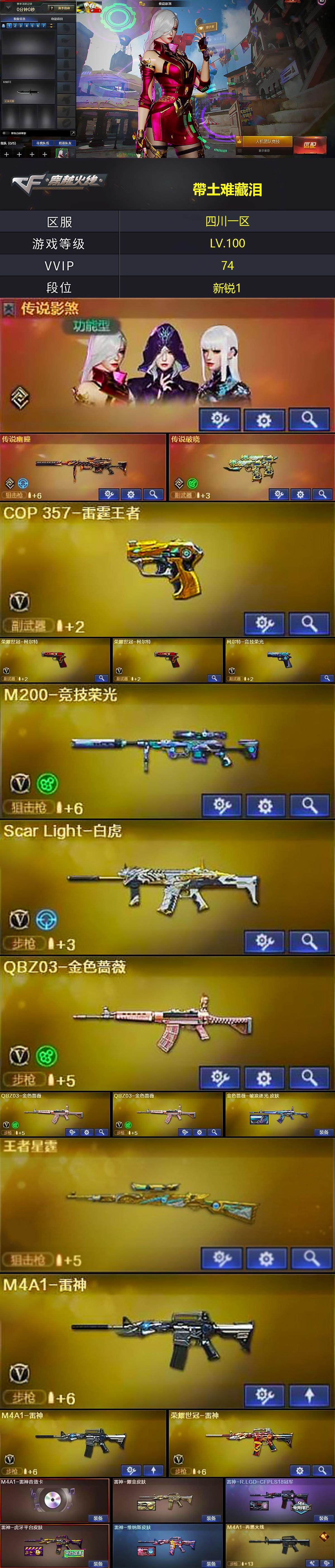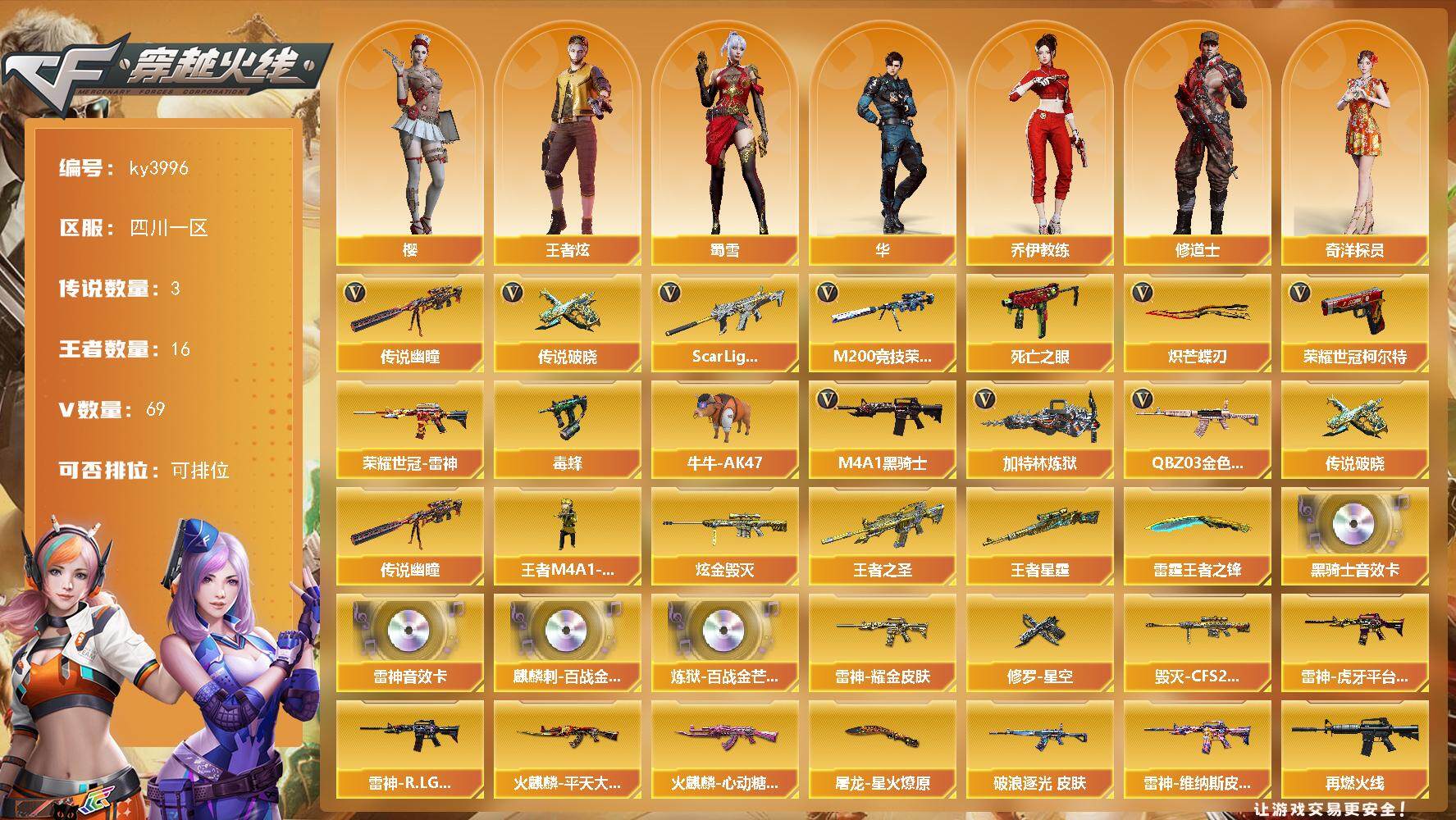 [14333828]四川一区-69V-16王者-1炫金 【传说武器】:传说幽瞳,传说破晓 【传说角色】:传说影煞 【热门武器】:传说幽瞳,传说破晓,QBZ03-金色蔷薇*3,Scar Light-白虎,M200-竞技荣光,死亡之眼,荣耀世冠-雷神,荣耀世冠-柯尔特*2,毒蜂,牛牛-AK47,M4A1-黑骑士,加特林-炼狱,王者M4A1-萌萌金发刀锋,炽芒蝶刃 【王者炫金武器】:王者之圣,王者星霆,雷霆王者之锋,炫金毁灭 【音效卡】:M4A1-雷神音效卡,M4A1-黑骑士音效卡,麒麟刺-百战金芒-盛典舞曲音效卡,炼狱-百战金芒-庆典舞曲音效卡 【皮肤】:金色蔷薇-破浪逐光 皮肤,雷神-耀金皮肤,雷神-R.LGD-CFPLS18冠军,雷神-虎牙平台皮肤,雷神-维纳斯皮肤,M4A1-再燃火线,火麒麟-雷神,火麒麟-平天大圣,火麒麟-心动糖果,毁灭-CFS2020,毁灭-百城浙江 皮肤,毁灭-虹光风暴 皮肤*2,毁灭-秦师 皮肤,M4A1-千变-孔明皮肤*2,黑龙-能量核心*2,黑骑士-电玩青兔皮肤,黑骑士-破界 皮肤,修罗-星空,屠龙-星火燎原,轻型军用手斧-再燃火线 【角色】:樱,华,王者炫,奇洋探员,乔伊教练,修道士,暗夜-X,初恋灵狐,飞虎队-X,风暴女*2,嘉年华灵狐,娟娟,龙儿,麻雀,曼陀罗-X,潘多拉-X,潜龙队-X,斯沃特-X,蜀雪,新娜塔莎,雪莉杨,雪莉杨-摸金校尉,影武者-X,游珑儿 【人偶武器】:王者M4A1-萌萌金发刀锋,王者Barrett-英勇金戈,王者COP-精英刀锋,AWM-灵狐-15周年嘉年华*2,海滩汪汪-巴雷特*2,牛牛-AK47,迷你牛魔王,迷你波特博士,迷你牛牛,迷你生化手雷,生化手雷-机甲核心,沙鹰-蓝水晶-曼陀罗,Barrett-夜玫瑰,迷你艾比,灵狐娃娃手雷*9 【暴走生化】:毒蜂,死亡之眼 【挑战大师】:AK47-冰龙粉碎者,激光毁灭者III-白马银枪,神圣爆裂者-末日III 【英雄级武器】:M4A1-千变,AK47-火麒麟,M4A1-黑龙,M4A1-雷神*2,M4A1-黑骑士,AK12-天启,Scar Light-白虎,无影-神兵利器,黑武士-锦绣游龙,QBZ03-金色蔷薇*3,王者之势-觉醒版,AK-47-猩红传说,黑骑士-海王*2,荣耀世冠-雷神,Barrett-毁灭,Barrett-极光,M200-竞技荣光,王者之力-觉醒版,加特林-炼