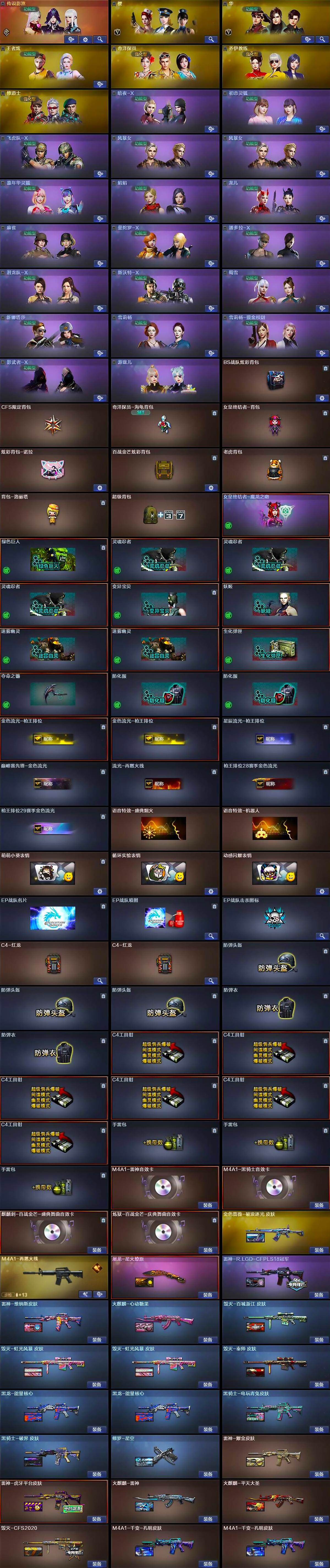 【皮肤】:金色蔷薇-破浪逐光 皮肤,雷神-耀金皮肤,雷神-R.LGD-CFPLS18冠军,雷神-虎牙平台皮肤,雷神-维纳斯皮肤,M4A1-再燃火线,火麒麟-雷神,火麒麟-平天大圣,火麒麟-心动糖果,毁灭-CFS2020,毁灭-百城浙江 皮肤,毁灭-虹光风暴 皮肤*2,毁灭-秦师 皮肤,M4A1-千变-孔明皮肤*2,黑龙-能量核心*2,黑骑士-电玩青兔皮肤,黑骑士-破界 皮肤,修罗-星空,屠龙-星火燎原,轻型军用手斧-再燃火线