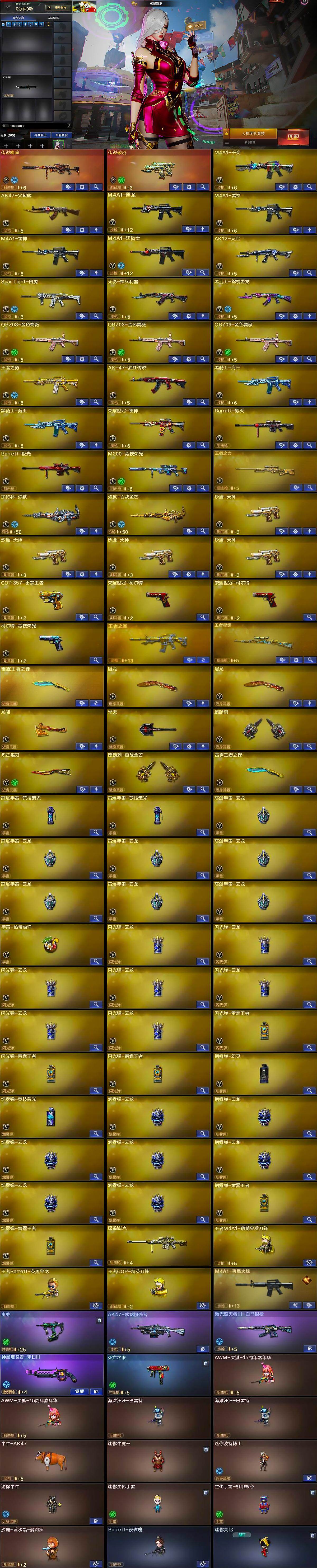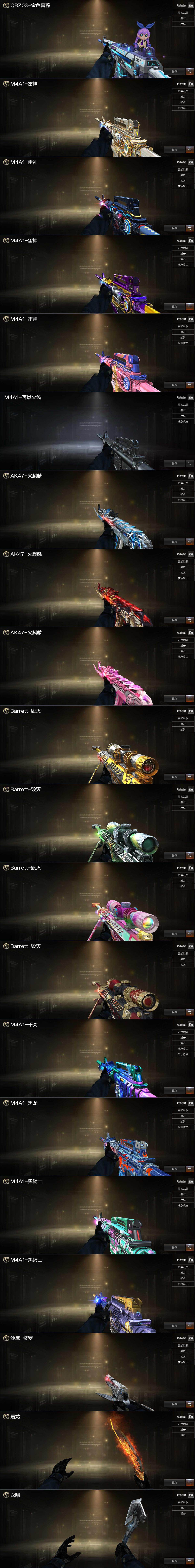 【英雄级武器】:M4A1-千变,AK47-火麒麟,M4A1-黑龙,M4A1-雷神*2,M4A1-黑骑士,AK12-天启,Scar Light-白虎,无影-神兵利器,黑武士-锦绣游龙,QBZ03-金色蔷薇*3,王者之势-觉醒版,AK-47-猩红传说,黑骑士-海王*2,荣耀世冠-雷神,Barrett-毁灭,Barrett-极光,M200-竞技荣光,王者之力-觉醒版,加特林-炼