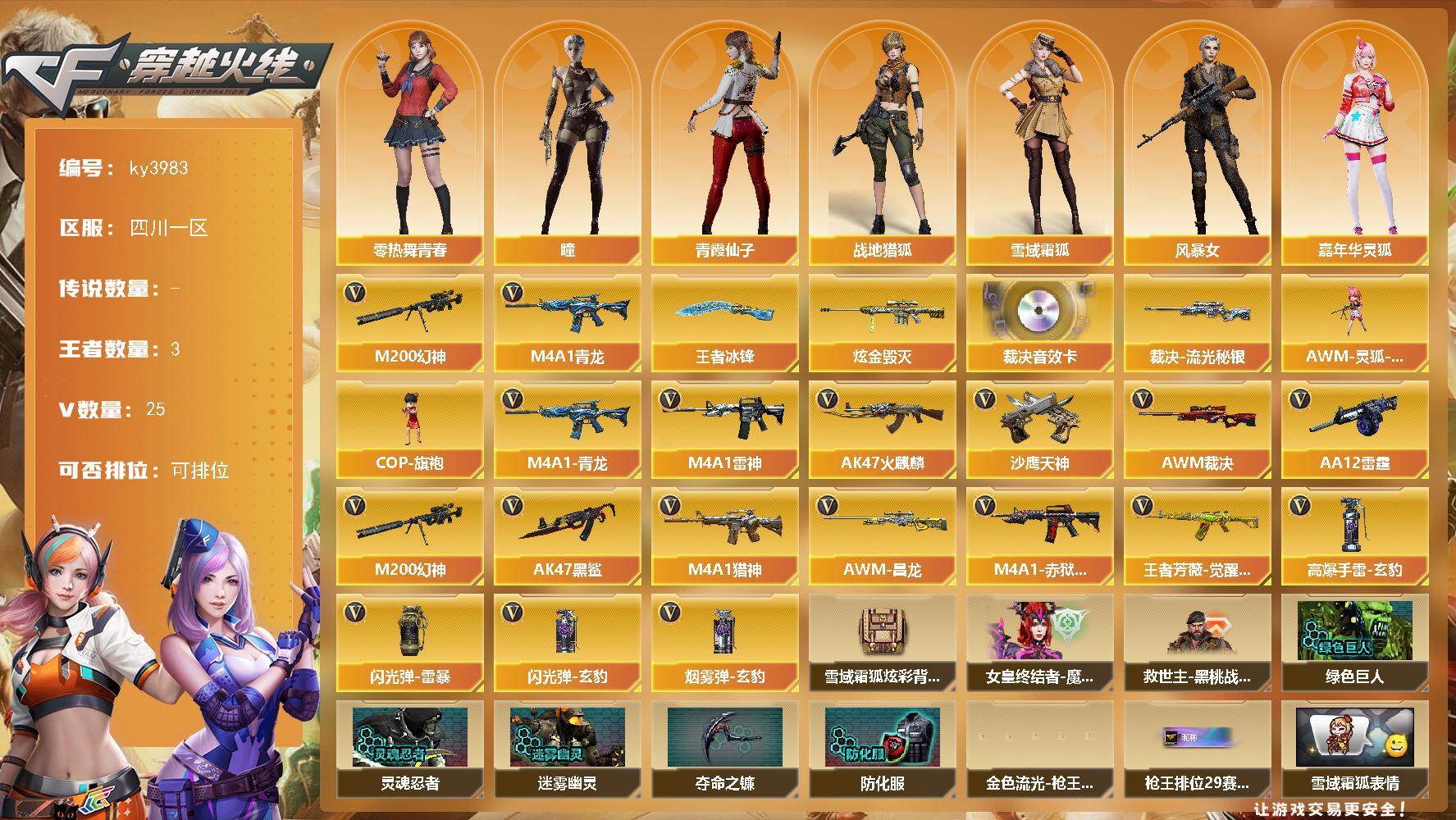 [14334045]四川一区-25V-3王者-1炫金 【热门武器】:M4A1-青龙,M200-幻神 【王者炫金武器】:王者冰锋,炫金毁灭 【音效卡】:AWM-裁决音效卡 【皮肤】:裁决-流光秘银 【角色】:瞳,战地猎狐,雪域霜狐,风暴女,嘉年华灵狐,零-热舞青春,曼陀罗-X,潘多拉-X,青霞仙子,斯沃特-X 【人偶武器】:AWM-灵狐-15周年嘉年华,COP-旗袍 【英雄级武器】:AK47-火麒麟,M4A1-雷神,AK47-黑鲨,M4A1-青龙,M4A1-猎神,王者芳薇-觉醒版,AWM-裁决,M200-幻神,AA-12-雷霆,沙鹰-天神*5,高爆手雷-玄豹*2,闪光弹-雷暴,闪光弹-玄豹*5,烟雾弹-玄豹,M4A1-赤狱骑士,AWM-昌龙 【道具】:雪域霜狐炫彩背包,女皇终结者-魔龙之吻,救世主-黑桃战神,绿色巨人,灵魂忍者,迷雾幽灵,夺命之镰,防化服*3,金色流光-枪王排位*2,星辰流光-枪王排位,枪王排位28赛季金色流光,枪王排位29赛季金色流光,雪域霜狐表情,C4-黑曜,C4-再燃火线,防弹头盔*3,防弹衣*3,C4工具钳*3,手雷包*3 【特殊枪械】: