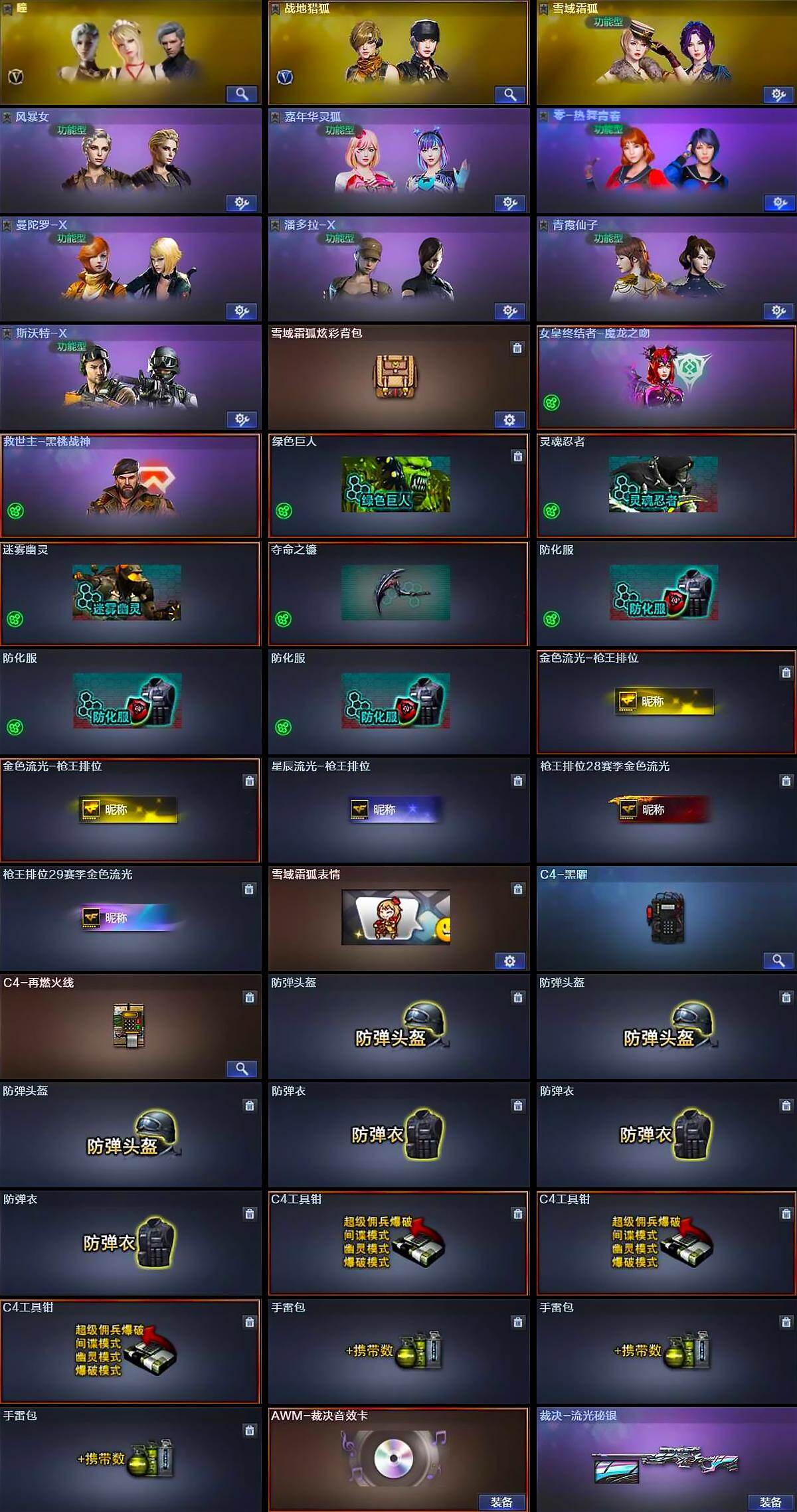 【道具】:雪域霜狐炫彩背包,女皇终结者-魔龙之吻,救世主-黑桃战神,绿色巨人,灵魂忍者,迷雾幽灵,夺命之镰,防化服*3,金色流光-枪王排位*2,星辰流光-枪王排位,枪王排位28赛季金色流光,枪王排位29赛季金色流光,雪域霜狐表情,C4-黑曜,C4-再燃火线,防弹头盔*3,防弹衣*3,C4工具钳*3,手雷包*3