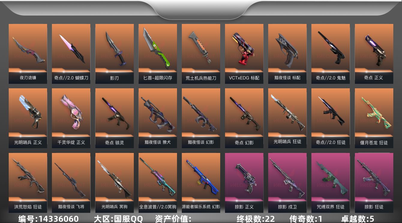 [14336060]【套装】:奇点//2.0套装,黯夜怪谈套装,VCTxEDG 队伍套装,回火礼包:奇点套装,掠影套装 【英雄】:炼狱,维斯,暮蝶,壹决,铁臂,捷风,幽影,不死鸟,贤者,猎枭,蝰蛇,芮娜,奇乐,尚勃勒,霓虹,斯凯,夜露,K/O,海神,盖可,黑梦,钢锁 【近战 武器】:近战武器-超限闪存 匕首,近战武器-荒土机兵 热能刀,近战武器-奇点//2.0 蝴蝶刀,近战武器-夜刃诡镰,近战武器-影刃 【标配】:标配-黯夜怪谈,标配-荒土机兵,标配-浮光跃金 【VCT手枪】:标配-VCT x EDG 【狂怒】:狂怒-逆冲蛮牛 【鬼魅】:鬼魅-奇点//2.0,鬼魅-模拟赫兹 【正义】:正义-光明哨兵,正义-奇点,正义-千灵华绽,正义-掠影,正义-超限闪存,正义-纳米打击 【蜂刺】:蜂刺-超限闪存 【骇灵】:骇灵-奇点,骇灵-荒土机兵,骇灵-浮光跃金 【雄鹿】:雄鹿-模拟赫兹,雄鹿-逆冲蛮牛 【判官】:判官-纳米打击x 【獠犬】:獠犬-黯夜怪谈,獠犬-模拟赫兹,獠犬-逆冲蛮牛 【戍卫】:戍卫-掠影,戍卫-浮光跃金,戍卫-逆冲蛮牛 【幻影】:幻影-源能者娱乐系统,幻影-黯夜怪谈,幻影-奇点,幻影-超限闪存,幻影-纳米打击 【狂徒】:狂徒-光明哨兵,狂徒-洪荒怒焰,狂徒-奇点//2.0,狂徒-偃月苍龙,狂徒-掠影,狂徒-咒缚双界,狂徒-荒土机兵 【飞将】:飞将-黯夜怪谈 【冥驹】:冥驹-光明哨兵,冥驹-全息波普//2.0,冥驹-掠影,冥驹-荒土机兵,冥驹-模拟赫兹 【莽侠】:莽侠-超限闪存 【战神】:战神-浮光跃金 【奥丁】:奥丁-纳米打击 【卡面】:终章:激斗汉堡 卡面,进入射程 卡面,分崩离析 卡面,纳米打击 卡面,抑制技术 卡面,激斗汉堡 卡面,瓦娃脸雪糕 P2 卡面,从黄昏到黎明 卡面,荒土机兵 卡面,银弹猎手 卡面,逆冲蛮牛 卡面,《双城之战》拥抱 卡面,精灵大战 卡面,欢迎来到底城 卡面,南瓜盛典 卡面,VCT CN首冠 卡面,唱片的故事 卡面,钢弓与箭弦 卡面,排除故障 卡面,奇点//2.0 卡面,战术桌游 卡面,悠享食光 卡面,修车达人 卡面,热舞环节 卡面,模拟赫兹 卡面,浮光跃金 卡面,超限闪存 卡面,维斯工牌 卡面,正义的化身 卡面,代号红色 卡面,新兵报到 卡面,V契约 卡面,无畏契约 卡面 【喷漆】:小小心意 喷漆,战“素”兔 喷漆,宇宙的指引 喷漆,请求重启 喷