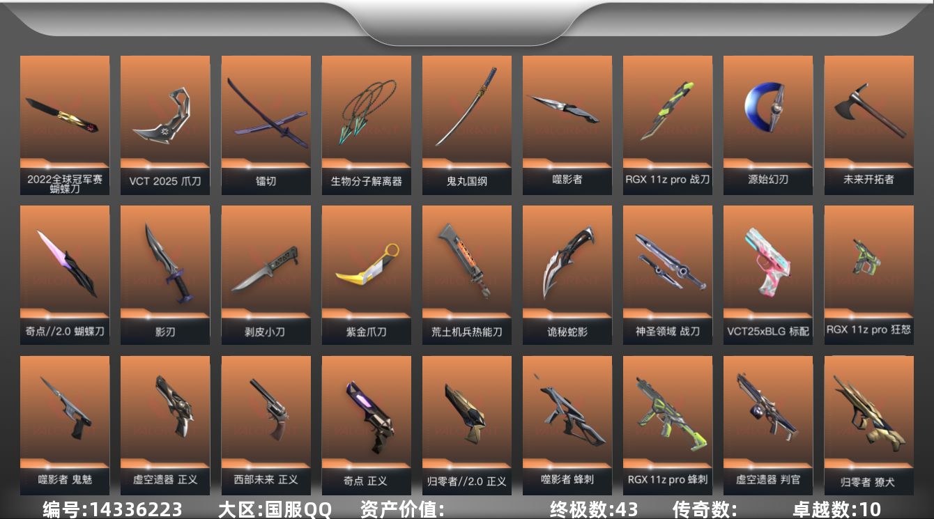 [14336223]【套装】:2022全球冠军赛套装,西部未来套装,VCT 2025 赛季套装,虚空遗器套装,噬影者套装,RGX 11z Pro套装,归零者//2.0套装 【英雄】:幻棱,炼狱,暮蝶,钛狐,壹决,铁臂,捷风,雷兹,幽影,不死鸟,贤者,猎枭,零,芮娜,尚勃勒,盖可,黑梦 【近战 武器】:近战武器-2022全球冠军赛 蝴蝶刀,近战武器-紫金爪刀,近战武器-VCT 2025 爪刀,近战武器-奇点//2.0 蝴蝶刀,近战武器-剥皮小刀,近战武器-RGX 11z Pro 战刀,近战武器-噬影者 簇刃,近战武器-镭切,近战武器-鬼丸国纲,近战武器-源始幻刃,近战武器-未来开拓者,近战武器-荒土机兵 热能刀,近战武器-生物分子解离器,近战武器-影刃,近战武器-诡秘蛇影 军刀,近战武器-神圣领域 战刀 【狂徒】:狂徒-混沌序曲,狂徒-虚空遗器,狂徒-噬影者,狂徒-RGX 11z Pro,狂徒-掠影,狂徒-盖亚的复仇,狂徒-日冕雄师,狂徒-荒土机兵,狂徒-诡秘蛇影 【幻影】:幻影-2022全球冠军赛,幻影-归零者//2.0,幻影-西部未来,幻影-虚空遗器,幻影-侦察力量,幻影-神圣领域,幻影-纳米打击,幻影-末日之翼,幻影-西部未来 【戍卫】:戍卫-归零者//2.0,戍卫-噬影者,戍卫-RGX 11z Pro,戍卫-逆冲蛮牛,戍卫-月球哨兵,戍卫-折光棱晶 【獠犬】:獠犬-归零者,獠犬-神圣领域,獠犬-逆冲蛮牛 【冥驹】:冥驹-堕天遗武,冥驹-掠影,冥驹-荒土机兵,冥驹-星云暗涌 【飞将】:飞将-西部未来,飞将-末日之翼 【莽侠】:莽侠-归零者//2.0,莽侠-诡秘蛇影,莽侠-月球哨兵 【战神】:战神-神圣领域 【奥丁】:奥丁-西部未来,奥丁-纳米打击,奥丁-末日之翼 【判官】:判官-虚空遗器,判官-诡秘蛇影,判官-纳米打击x 【雄鹿】:雄鹿-逆冲蛮牛,雄鹿-月球哨兵 【骇灵】:骇灵-紫阙金琅,骇灵-荒土机兵,骇灵-星云暗涌 【蜂刺】:蜂刺-噬影者,蜂刺-RGX 11z Pro,蜂刺-星云暗涌,蜂刺-折光棱晶 【标配】:标配-荒土机兵,标配-折光棱晶 【VCT手枪】:标配-VCT25 x BLG 【正义】:正义-归零者//2.0,正义-奇点,正义-西部未来,正义-虚空遗器,正义-离子武器,正义-纳米打击,正义-游戏结束,正义-月球哨兵 【鬼魅】:鬼魅-噬影者,鬼魅-盖世英雄,鬼魅-天界