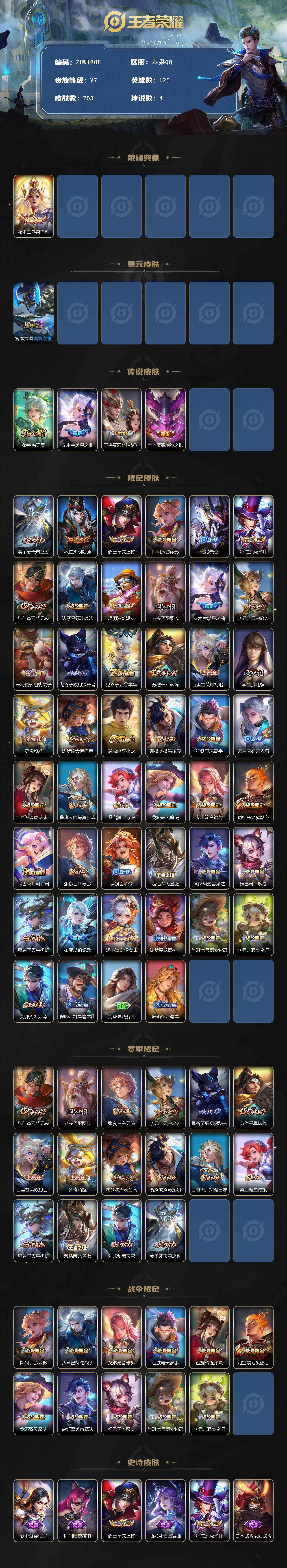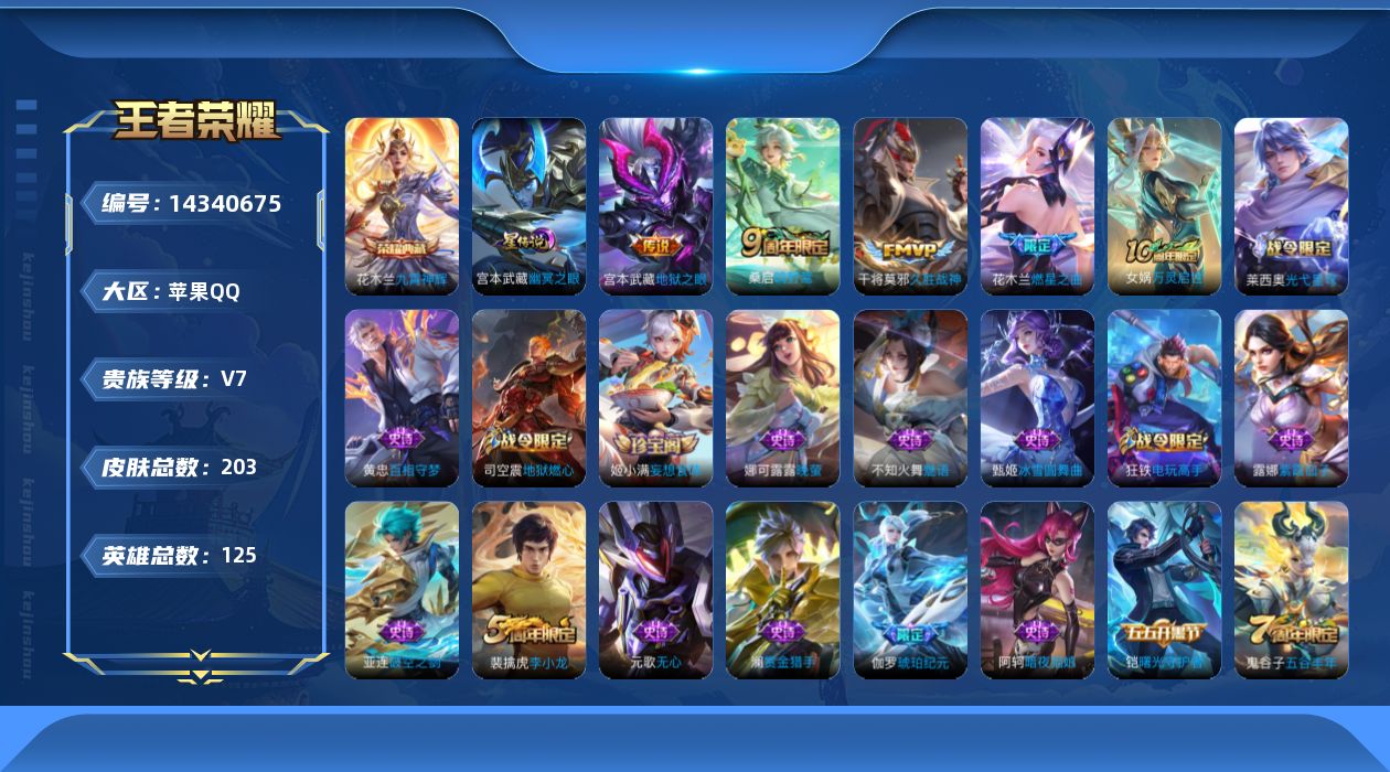 [14340675]可二次【店主推荐捡漏号!可直接换绑】苹果Q-V7-最强王者段位-125英雄-203皮肤-1典藏皮肤-4传说-58史诗-1星元