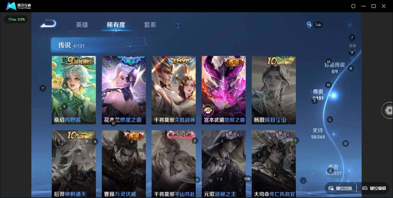 - [11325550]V6 1珍品传说 2传说 108英雄 105皮肤 可修改实名 女号 优质装备:器灵·落星盏 传说皮:续相思 珍宝阁皮:万物之道 限定皮:陌上桑,鸣野蒿 史诗皮:化蝶舞,星界战将,谪仙醉月,炽弈燎原,破空之剑,涂山红红,蒙犽顽岩魄,埋骨钱,遇见神鹿,冰冠公主,暗夜猫娘,猫狗日记-孙策,女仆咖啡,水果甜心,心灵骇客,诗语江南,缤纷独角兽,水晶猎龙者,圣诞恋歌,鹰眼统帅,魅力维加斯,滕王阁序