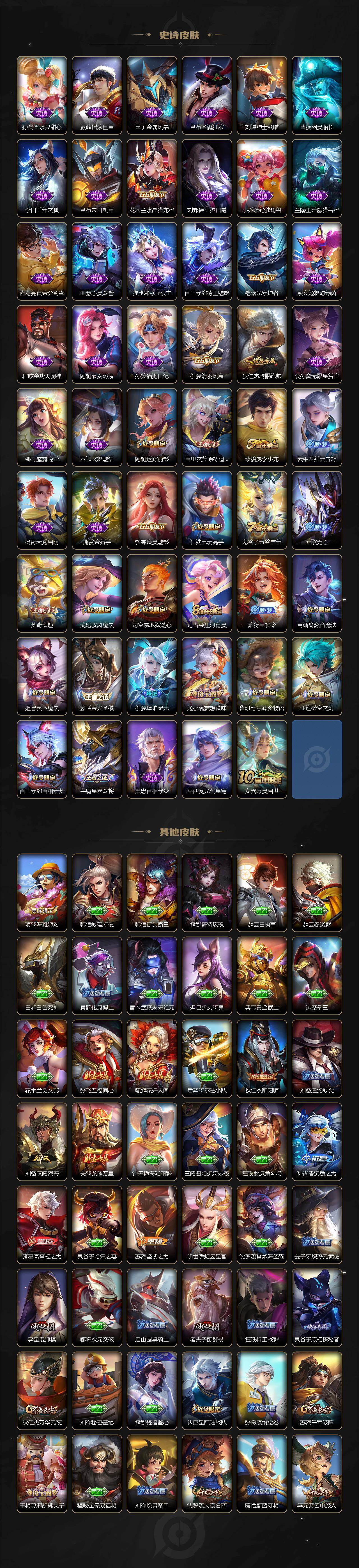 【史诗皮肤】:露娜紫霞仙子,阿轲暗夜猫娘,赵云皇家上将,甄姬冰雪圆舞曲,狄仁杰魔术师,宫本武藏鬼剑武藏,孙尚香水果甜心,嬴政摇滚巨星,墨子金属风暴,吕布圣诞狂欢,刘禅绅士熊喵,曹操幽灵船长,李白千年之狐,吕布末日机甲,花木兰水晶猎龙者,刘邦德古拉伯爵,小乔缤纷独角兽,兰陵王暗隐猎兽者,诸葛亮黄金分割率,亚瑟心灵战警,雅典娜冰冠公主,百里守约特工魅影,铠曙光守护者,蔡文姬舞动绿茵,程咬金功夫厨神,阿轲节奏热浪,孙策猫狗日记,伽罗箭羽风息,狄仁杰鹰眼统帅,公孙离无限星赏官,娜可露露晚萤,不知火舞魅语,阿轲迷踪丽影,百里玄策原初追逐者,裴擒虎李小龙,云中君纤云弄巧,杨戬天秀启明,澜赏