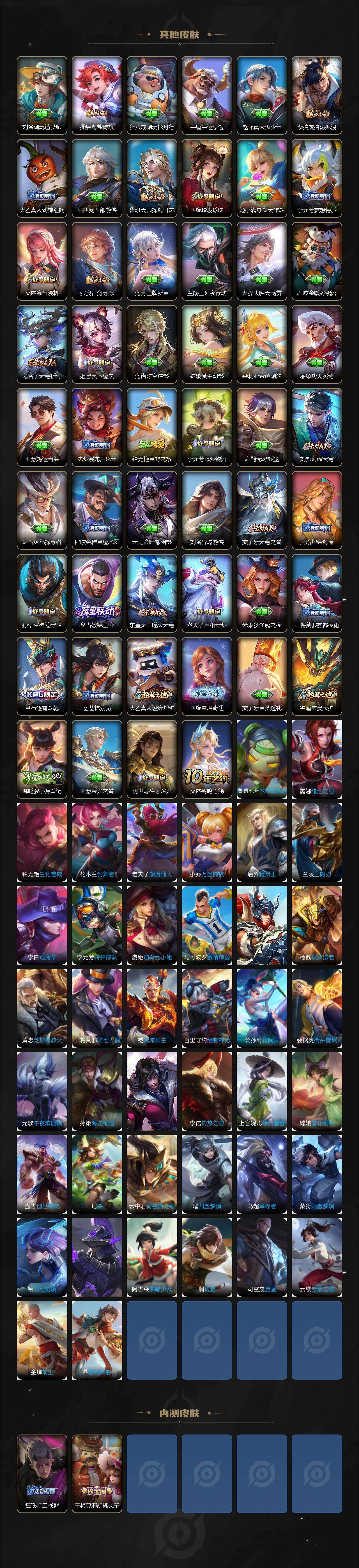 【限定皮肤】:姜子牙天穹之誓,狄仁杰阴阳师,赵云皇家上将,阿轲迷踪丽影,元歌无心,狄仁杰魔术师,狄仁杰万华元夜,达摩星际陆战队,项羽海滩派对,老夫子醍醐杖,花木兰燃星之曲,李元芳云中旅人,干将莫邪胡桃夹子,鬼谷子原初探秘者,鬼谷子五谷丰年,苏烈千军破阵,百里玄策原初追逐者,弈星混沌棋,梦奇顽趣,沈梦溪大漠名商,裴擒虎李小龙,裴擒虎擒涛扼浪,狂铁电玩高手,云中君纤云弄巧,西施玲珑珍味,鲁班大师探海日志,桑启海盐诗旅,戈娅驭风魔法,艾琳流音漫舞,司空震地狱燃心,阿古朵江河有灵,张良古海寻踪,蒙犽百解令,蒙恬荣光圣徽,高渐离燃音魔法,妲己灵卜魔法,鬼谷子天穹祈灯,伽罗琥珀纪元,姬小满妄想食味,沈梦溪龙舞盛年,鲁班七号蔬乡物语,李元芳蔬乡物语,刘邦剑破天穹,程咬金群星魔术团,刘备异域游侠,周瑜熔金海岸