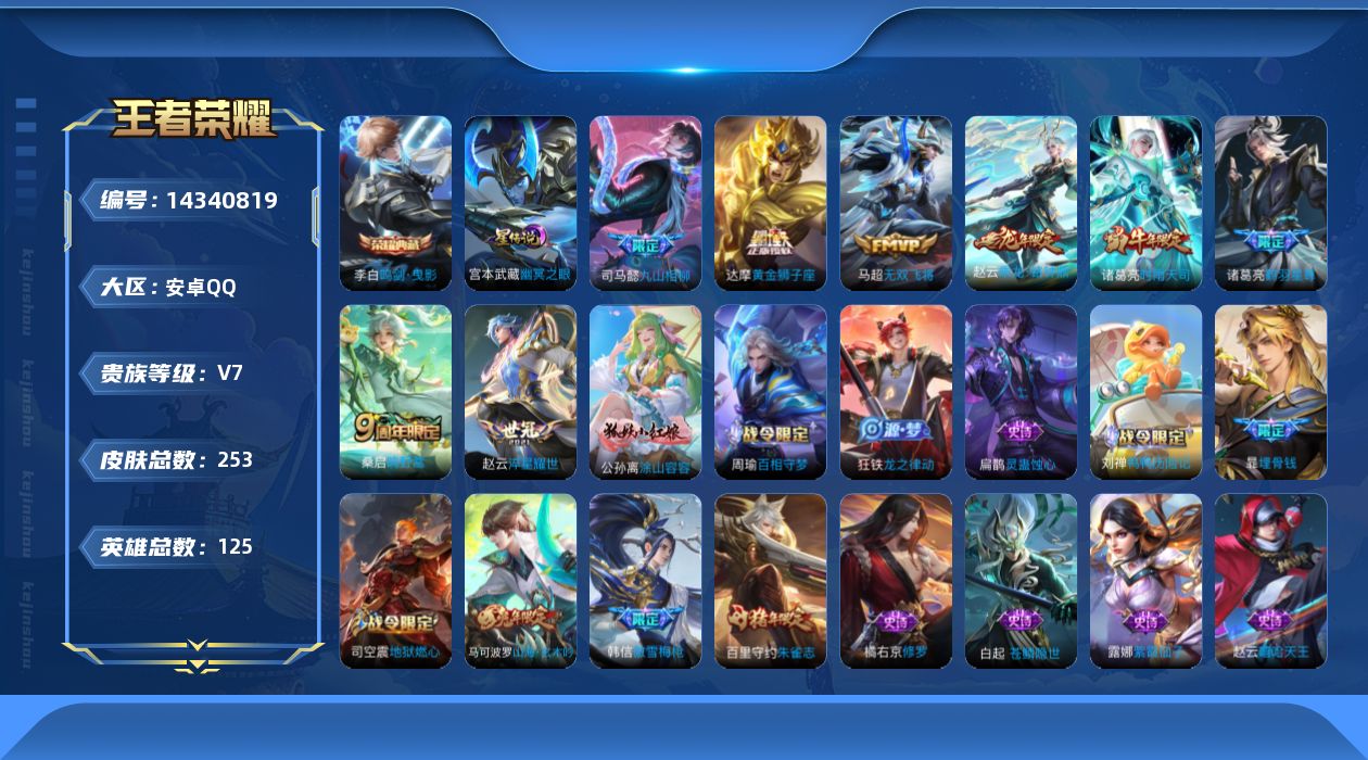 [14340819]可二次【店主推荐捡漏号!可直接换绑】万战赵云、万战达摩、万战蒙恬、1.1w司马懿,打野47段、对抗路46段,安卓Q-V7-最强王者段位-125英雄-253皮肤-1典藏皮肤-1星传说-8传说-67史诗 【英雄全皮】:司马懿全皮,蒙恬全皮,影全皮 【荣耀典藏】:李白鸣剑曳影 【传说皮肤】:司马懿九山相柳,桑启鸣野蒿,赵云乘龙铭钟鼎,诸葛亮鹤羽星尊,马超无双飞将,赵云淬星耀世,诸葛亮时雨天司,达摩黄金狮子座 【限定皮肤】:暃埋骨钱,姜子牙天穹之誓,杨戬破阵退雄兵,狄仁杰阴阳师,赵云皇家上将,赵云百木心枪,墨子神迹守卫,孙尚香蔷薇恋人,庄周高山流水,高渐离死亡摇滚,高渐离玩趣恶龙,元歌无心,马可波罗山海玄木吟,狄仁杰魔术师,狄仁杰万华元夜,达摩沙漠行僧,项羽海滩派对,老夫子醍醐杖,老夫子航海奇遇记,程咬金演武夺筹,韩信傲雪梅枪,兰陵王金庭之子,李元芳云中旅人,钟馗驱傩正仪,杨戬潮玩骑兵,干将莫邪胡桃夹子,雅典娜黎明之约,鬼谷子原初探秘者,鬼谷子五谷丰年,诸葛亮时雨天司,诸葛亮鹤羽星尊,苏烈千军破阵,百里玄策原初追逐者,百里守约朱雀志,梦奇顽趣,沈梦溪大漠名商,明世隐疑决卦,裴擒虎李小龙,裴擒虎擒涛扼浪,云中君纤云弄巧,上官婉儿梁祝,鲁班大师探海日志,桑启海盐诗旅,艾琳流音漫舞,司空震地狱燃心,阿古朵江河有灵,张良古海寻踪,蒙恬荣光圣徽,鬼谷子天穹祈灯,赵云乘龙铭钟鼎,沈梦溪龙舞盛年,刘邦剑破天穹,程咬金群星魔术团,镜青焰无极,刘备异域游侠,周瑜熔金海岸 【年限皮肤】:百里守约朱雀志,诸葛亮时雨天司,马可波罗山海玄木吟,赵云乘龙铭钟鼎 【赛季限定】:狄仁杰万华元夜,达摩沙漠行僧,老夫子醍醐杖,程咬金演武夺筹,兰陵王金庭之子,张良古海寻踪,李元芳云中旅人,钟馗驱傩正仪,雅典娜黎明之约,鬼谷子原初探秘者,苏烈千军破阵,百里玄策原初追逐者,梦奇顽趣,沈梦溪大漠名商,明世隐疑决卦,裴擒虎擒涛扼浪,鲁班大师探海日志,桑启海盐诗旅,鬼谷子天穹祈灯,蒙恬荣光圣徽,刘邦剑破天穹,姜子牙天穹之誓 【战令限定】:墨子神迹守卫,老夫子航海奇遇记,艾琳流音漫舞,杨戬潮玩骑兵,司空震地狱燃心,镜青焰无极 【史诗皮肤】:项羽苍穹之光,露娜紫霞仙子,赵云嘻哈天王,赵云皇家上将,赵云未来纪元,王昭君偶像歌手,狄仁杰魔术师,廉颇地狱岩魂,宫本武藏鬼剑武藏,孙尚香蔷薇恋人,孙尚香水果甜心,妲己魅力维加斯,墨子