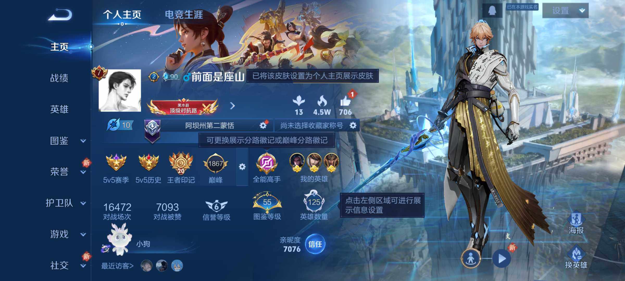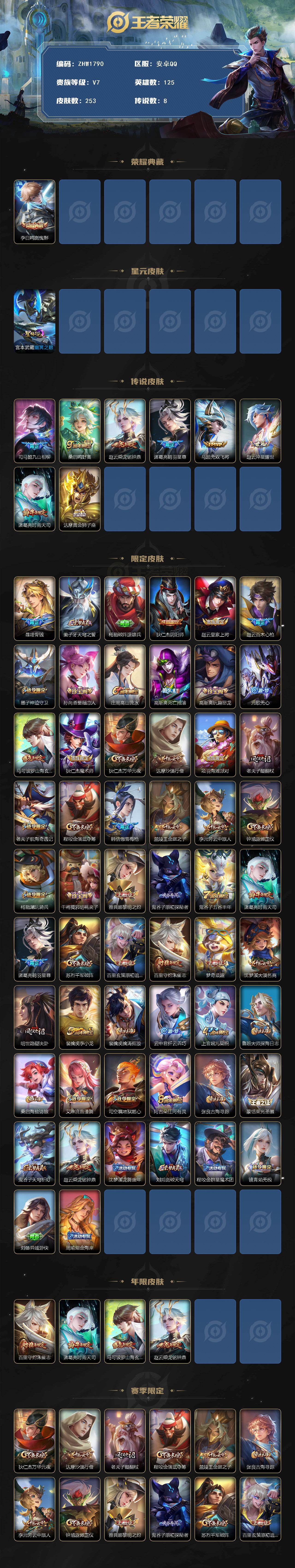 - PX_2105182-实名: 可修改 贵族等级: V7 英雄数: 121 皮肤数: 145 荣耀水晶: 鸣剑·曳影 传说皮: 黄金射手座,幻光神枪 限定皮: 遇见飞天,李小龙,游园惊梦,梁祝,天魔缭乱,至尊宝,如梦令-后羿,猪悟能,齐天大圣,愿照·众生和,愿照·岁时盈