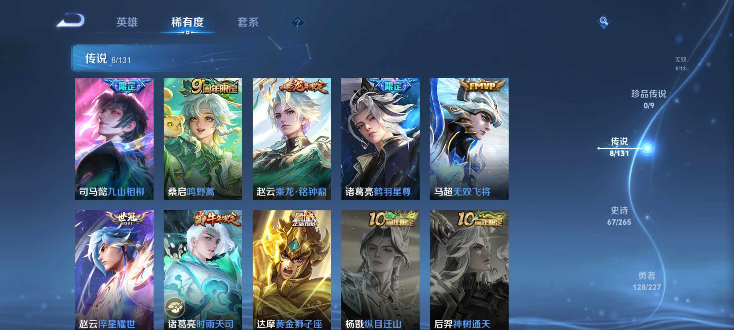 【传说皮肤】:司马懿九山相柳,桑启鸣野蒿,赵云乘龙铭钟鼎,诸葛亮鹤羽星尊,马超无双飞将,赵云淬星耀世,诸葛亮时雨天司,达摩黄金狮子座